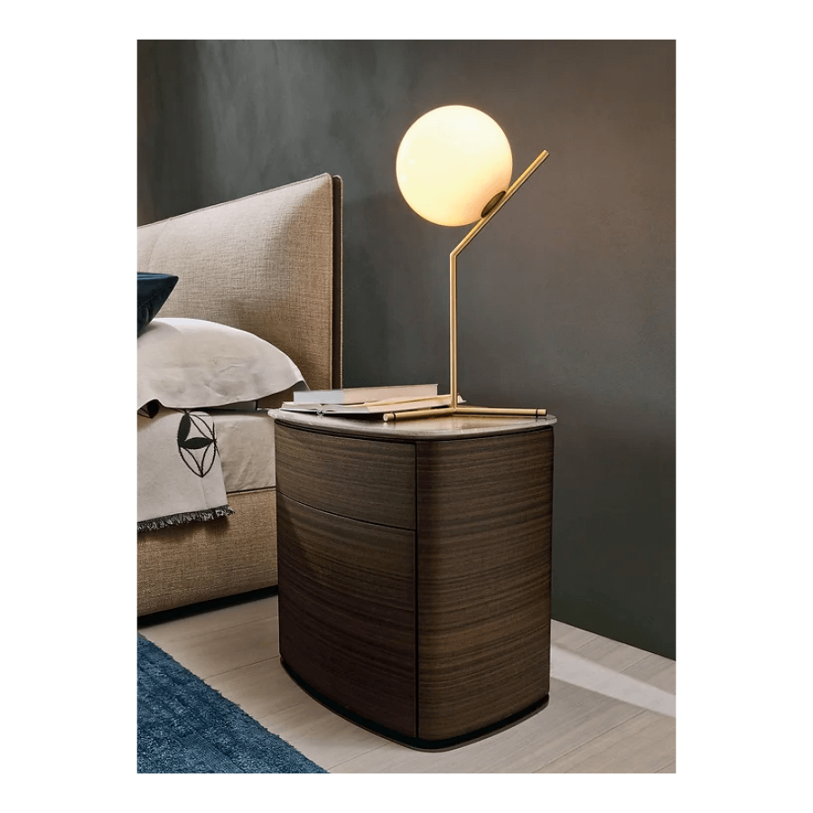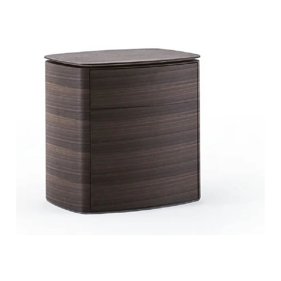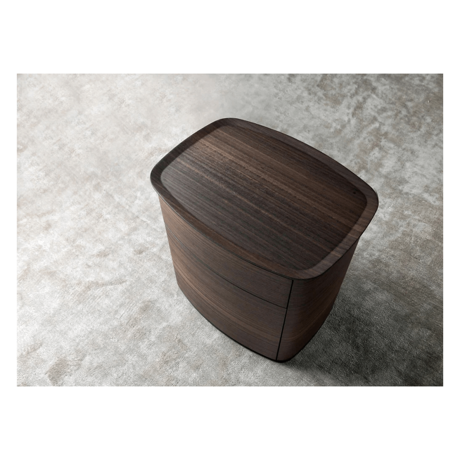 A wooden bedside unit with two drawers with a pressure opening. It is available in two variants in all wood or wood with marble top.