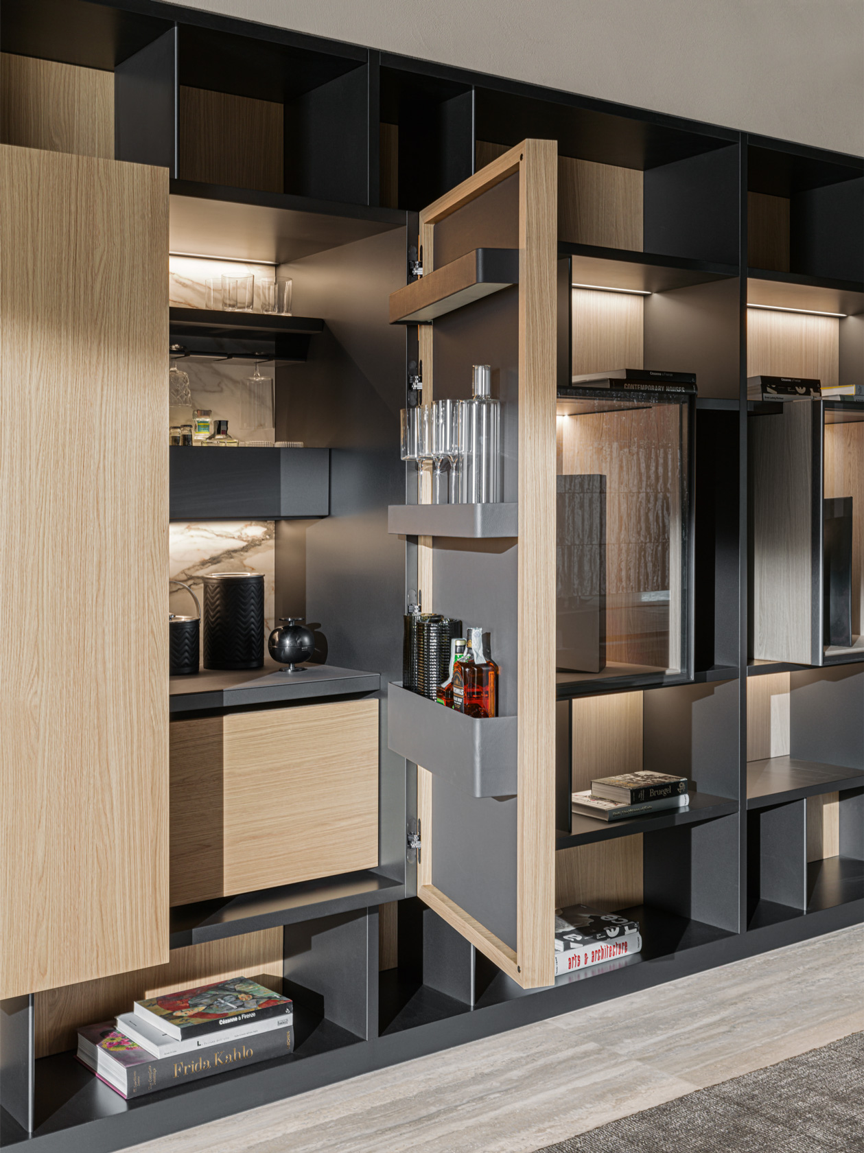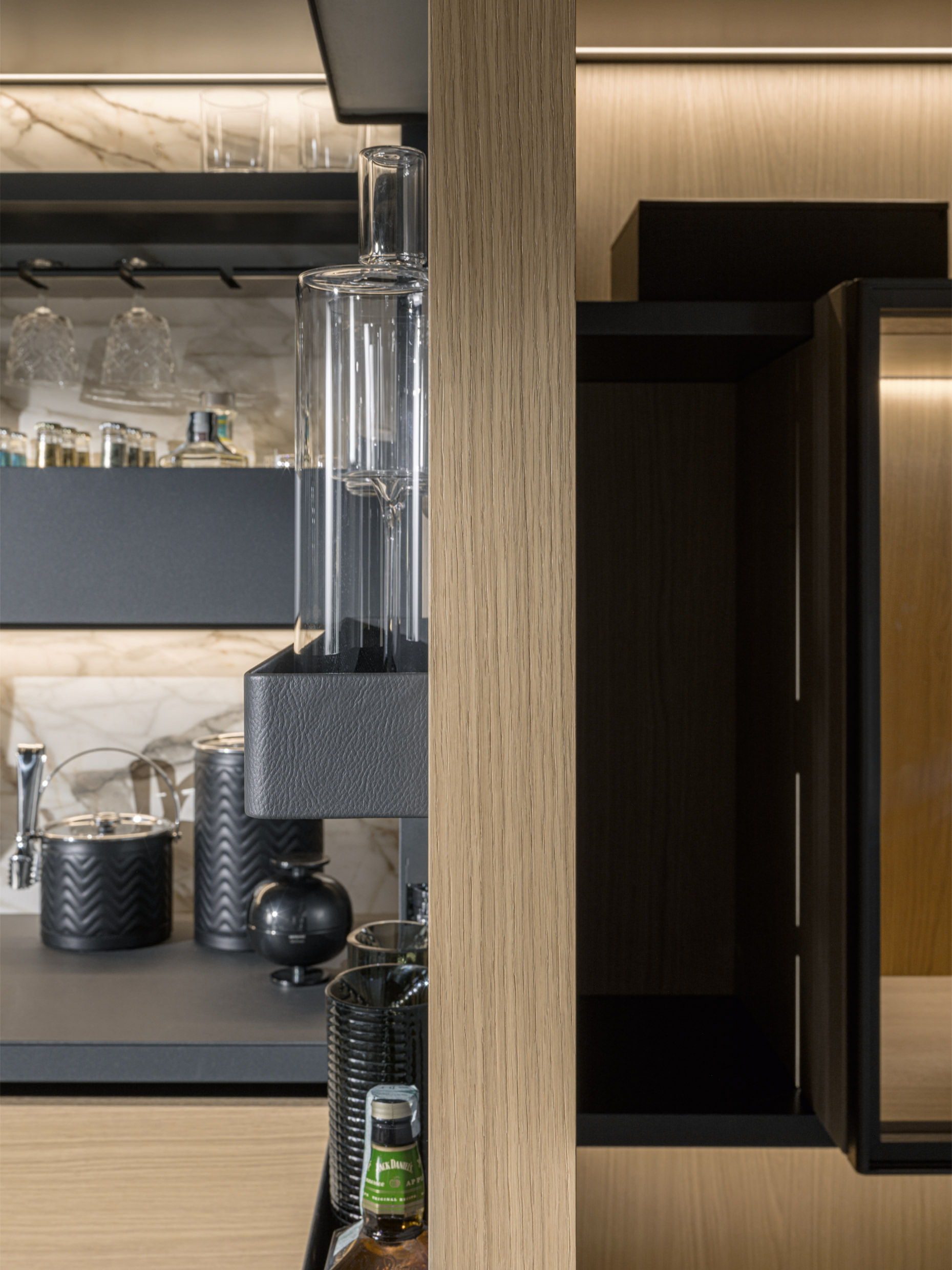 In 2023, Nicola Gallizia introduced a new door design featuring a full-height handle, adding an embellishing profile to the layout. Finishes such as coffee oak and an exclusive customizable 3D effect further enhance the system’s aesthetic range.