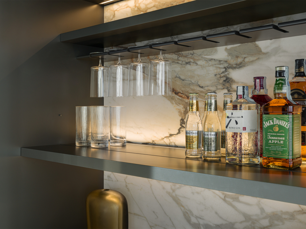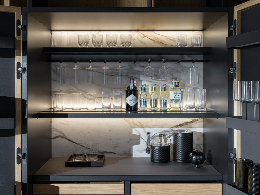 With a top surface and pull-out tray, the Harry’s Bar module provides a practical workspace for bartenders, complete with integrated LED lighting to illuminate the preparation area.
