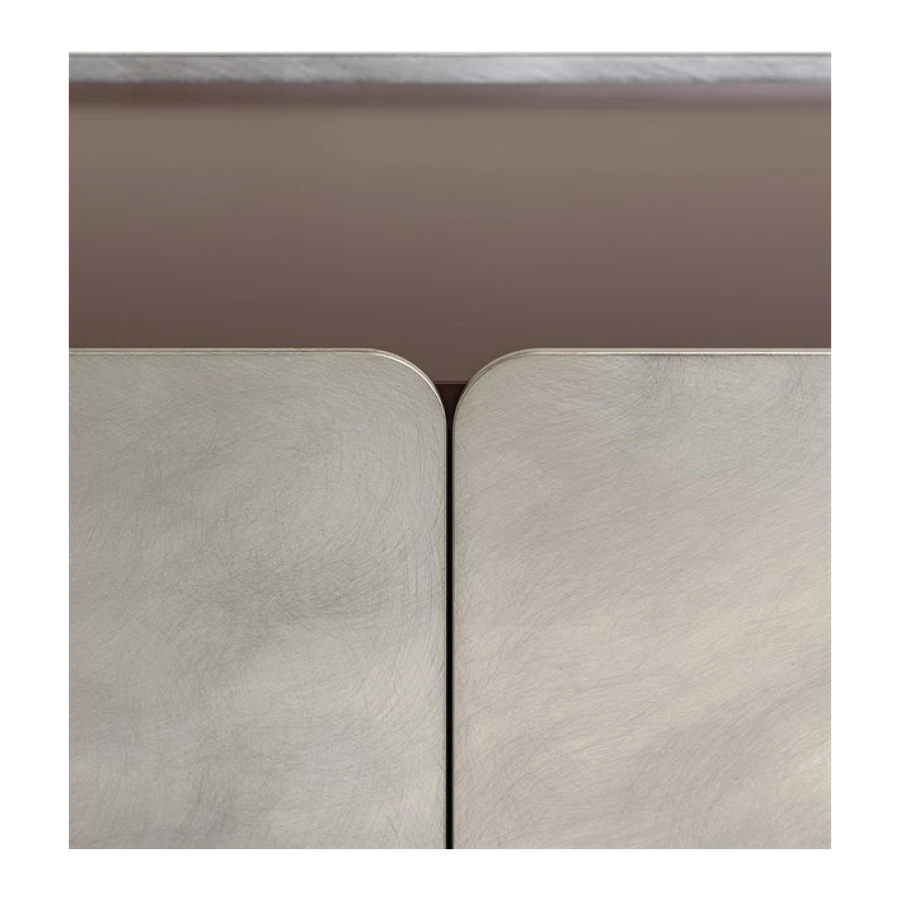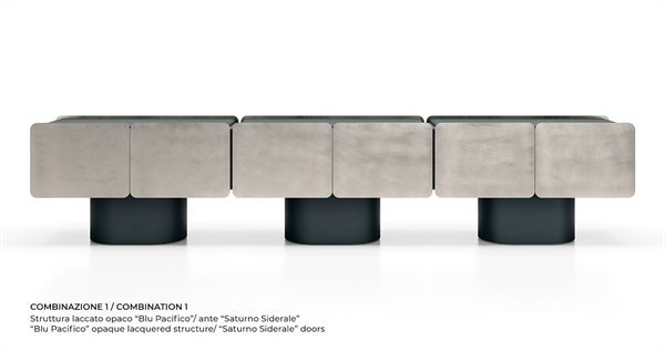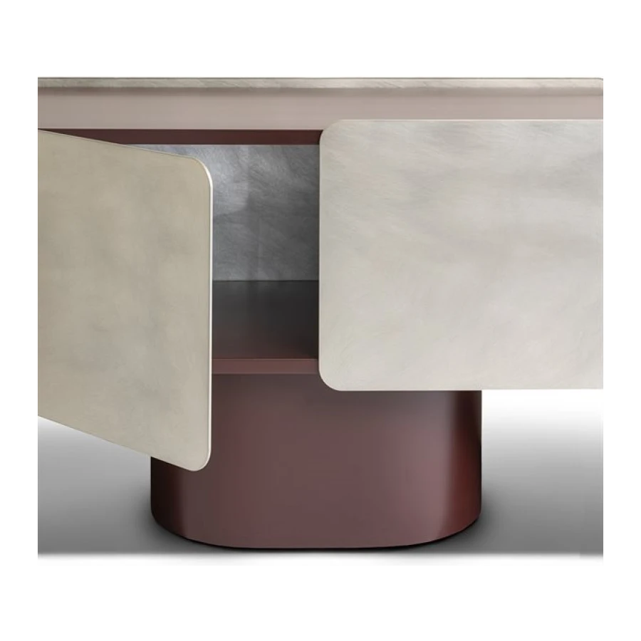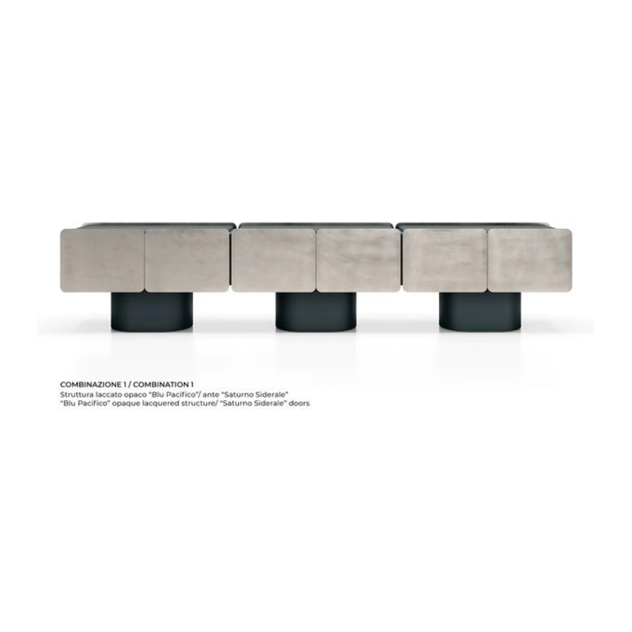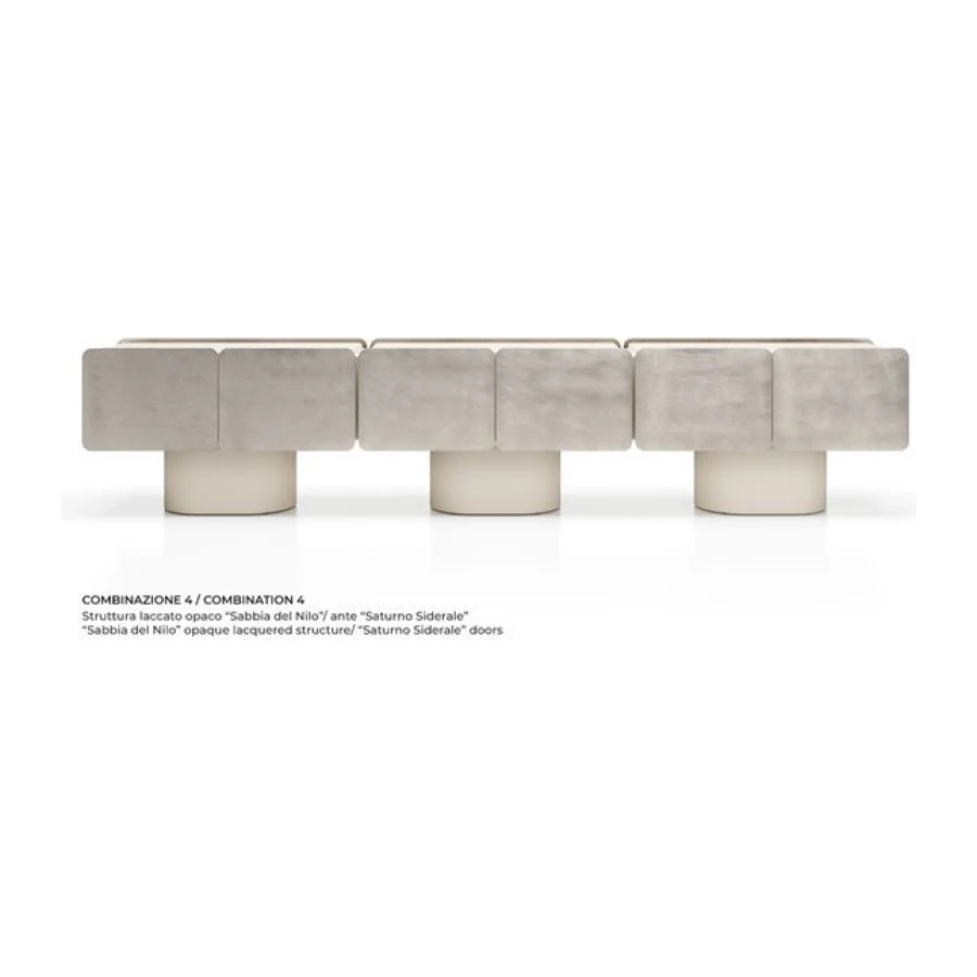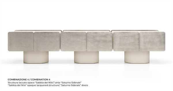 Sideboard in opaque lacquered wood. Available colours: “Bianco Camargue”, “Sabbia del Nilo, “Rosa Jaipur”, “Rosso Persia”, “Bordeaux Etruria”, “Verde Provenza”, “Blu Pacifico”, “Grigio Londra”, “Nero Giza”. Doors and back in 6mm extralight tempered glass covered by aluminium leaf (“Saturno Siderale”), gold leaf, copper leaf (“Rosso Marte”) applied by hand with an exclusive treatment. Also available “total color” version with doors and back in lacquered glass in the same colour as the structure. On request, inside 8mm extralight tempered glass shelf. Multiple compositions can be made upon request.