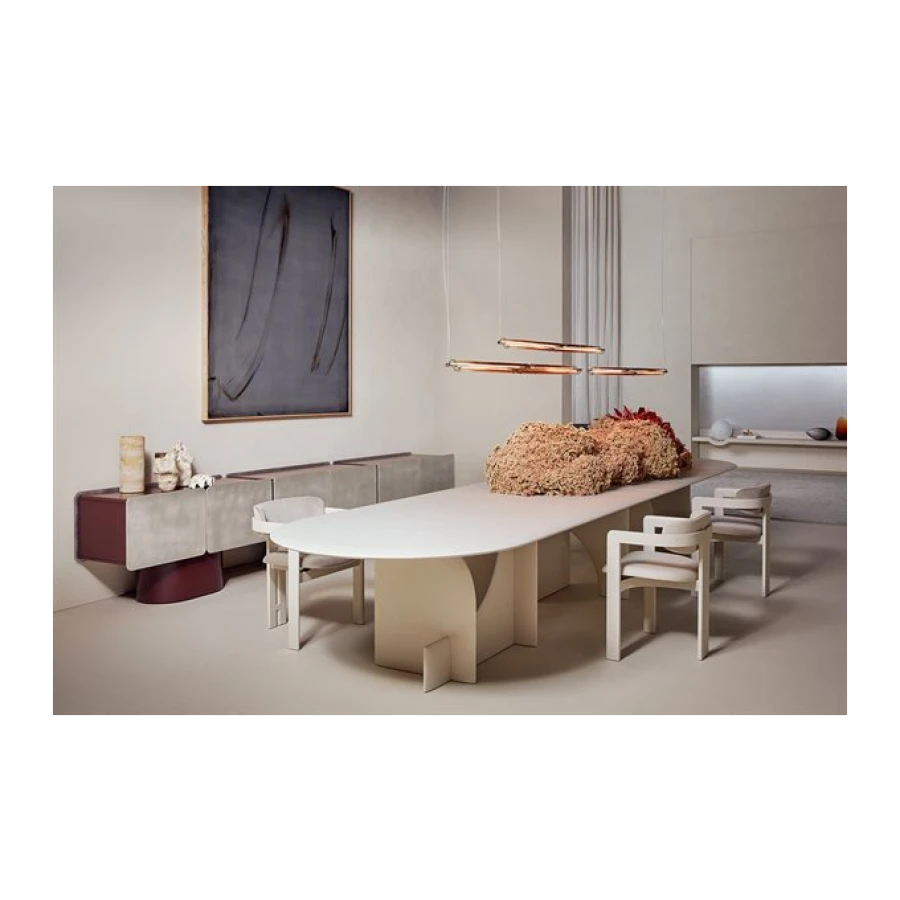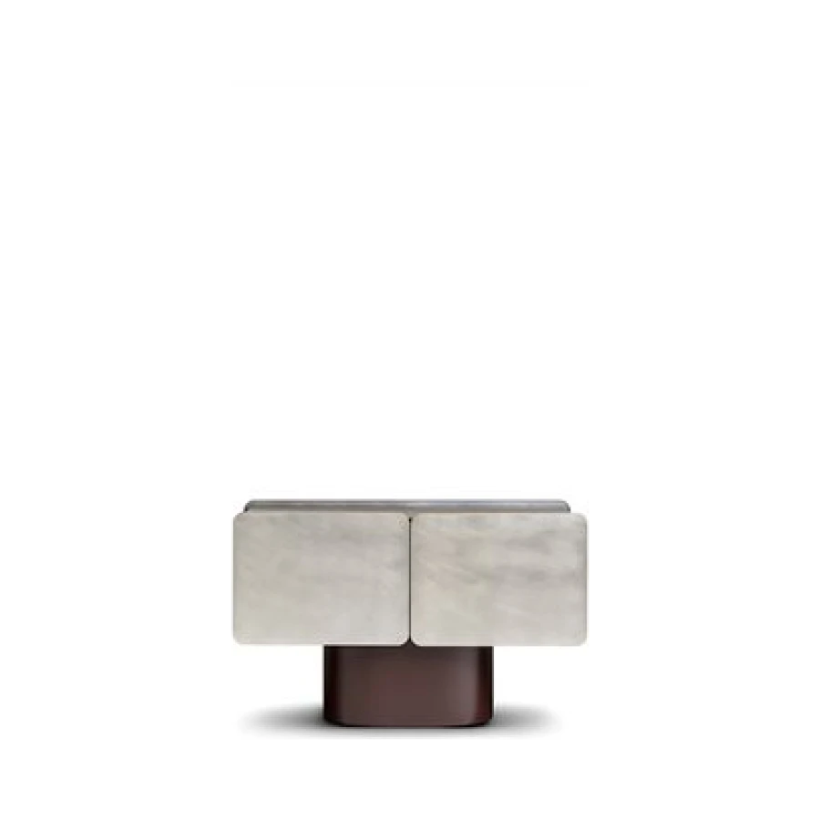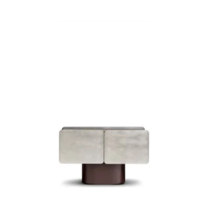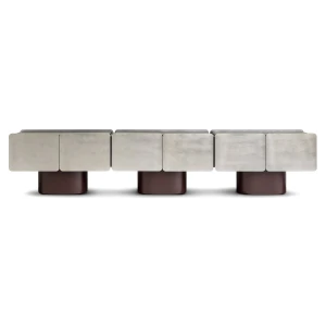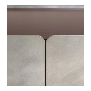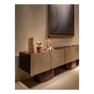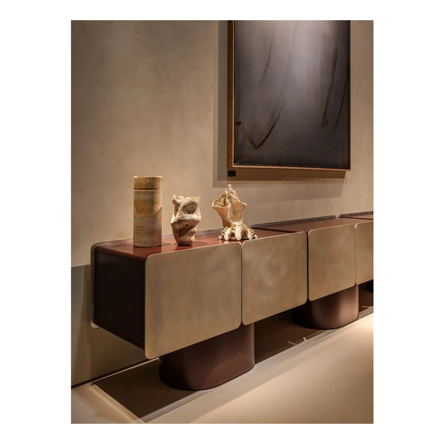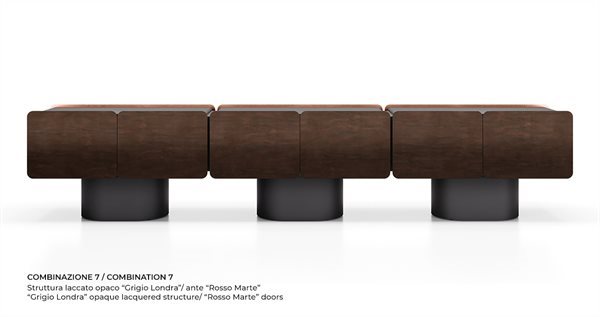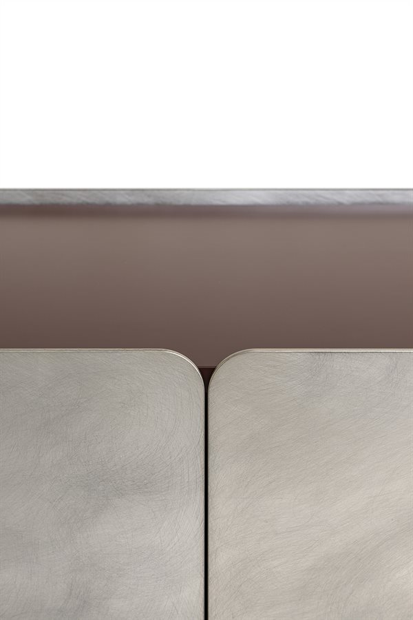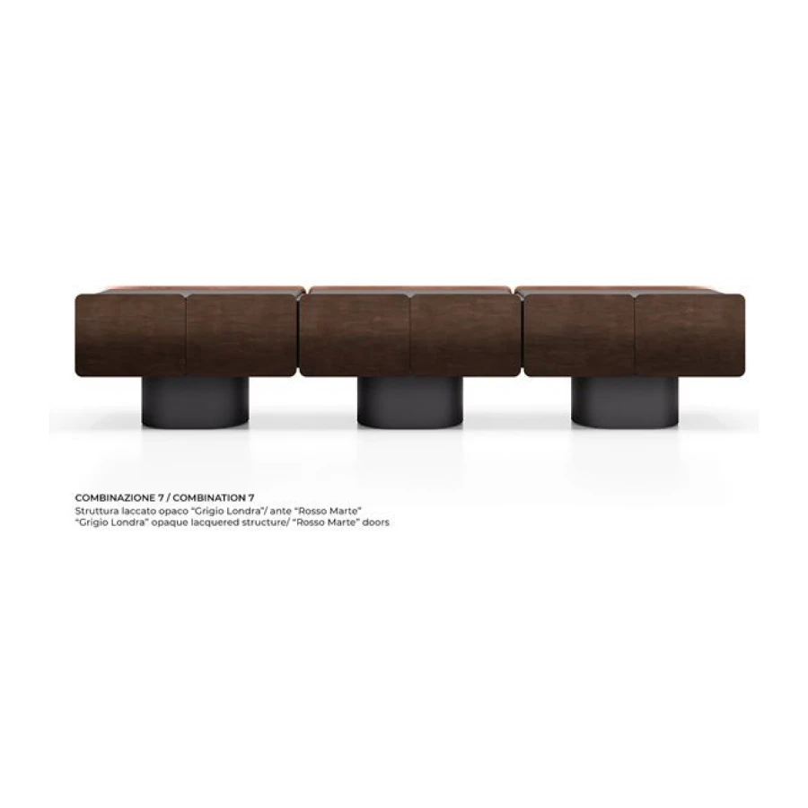 Sideboard in opaque lacquered wood. Available colours: “Bianco Camargue”, “Sabbia del Nilo, “Rosa Jaipur”, “Rosso Persia”, “Bordeaux Etruria”, “Verde Provenza”, “Blu Pacifico”, “Grigio Londra”, “Nero Giza”. Doors and back in 6mm extralight tempered glass covered by aluminium leaf (“Saturno Siderale”), gold leaf, copper leaf (“Rosso Marte”) applied by hand with an exclusive treatment. Also available “total color” version with doors and back in lacquered glass in the same colour as the structure. On request, inside 8mm extralight tempered glass shelf. Multiple compositions can be made upon request.