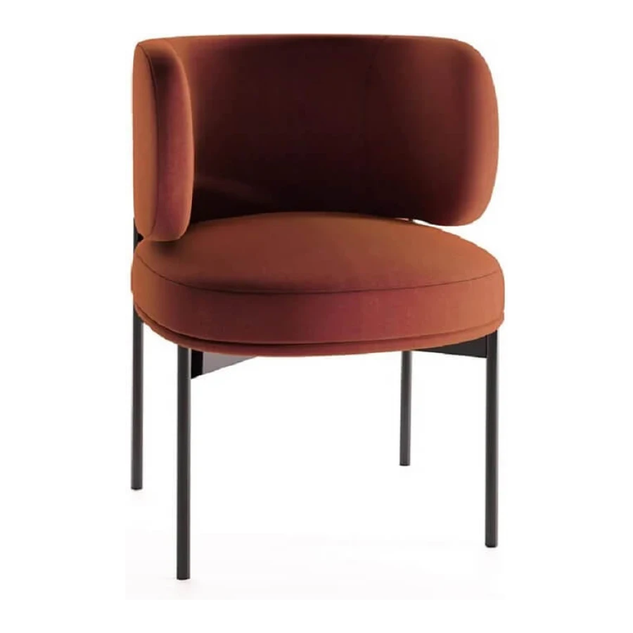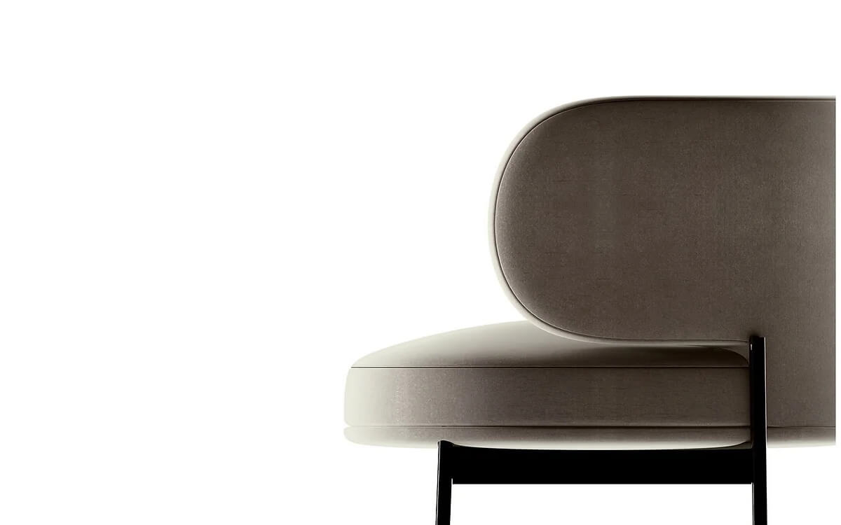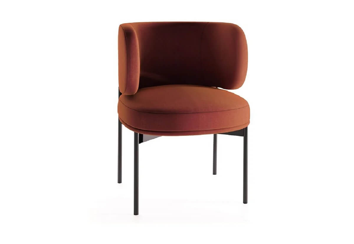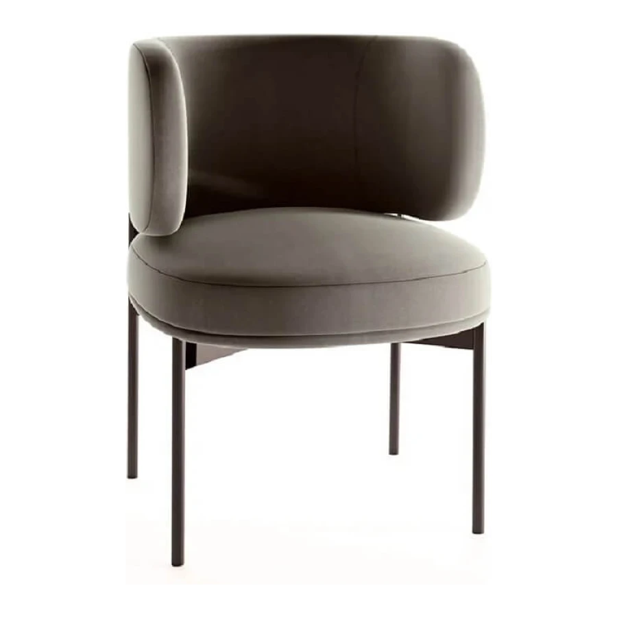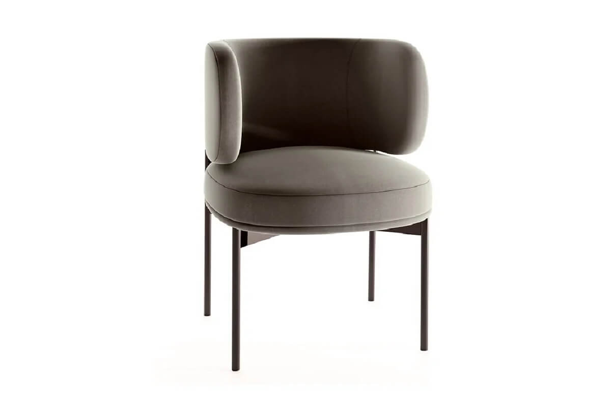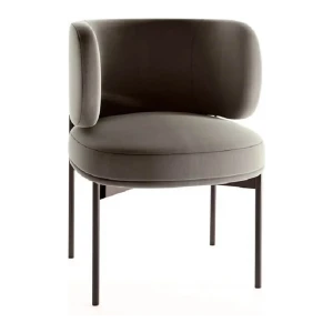 Chair with inside structure in wood and by-products. Padded with fire resistant non-deformable polyurethane foam in different density and fire resistant polyester fibre. Metal base lacquered in the “warm grey” colour. Available covered by fabric or leather as per sample. Not removable cover.