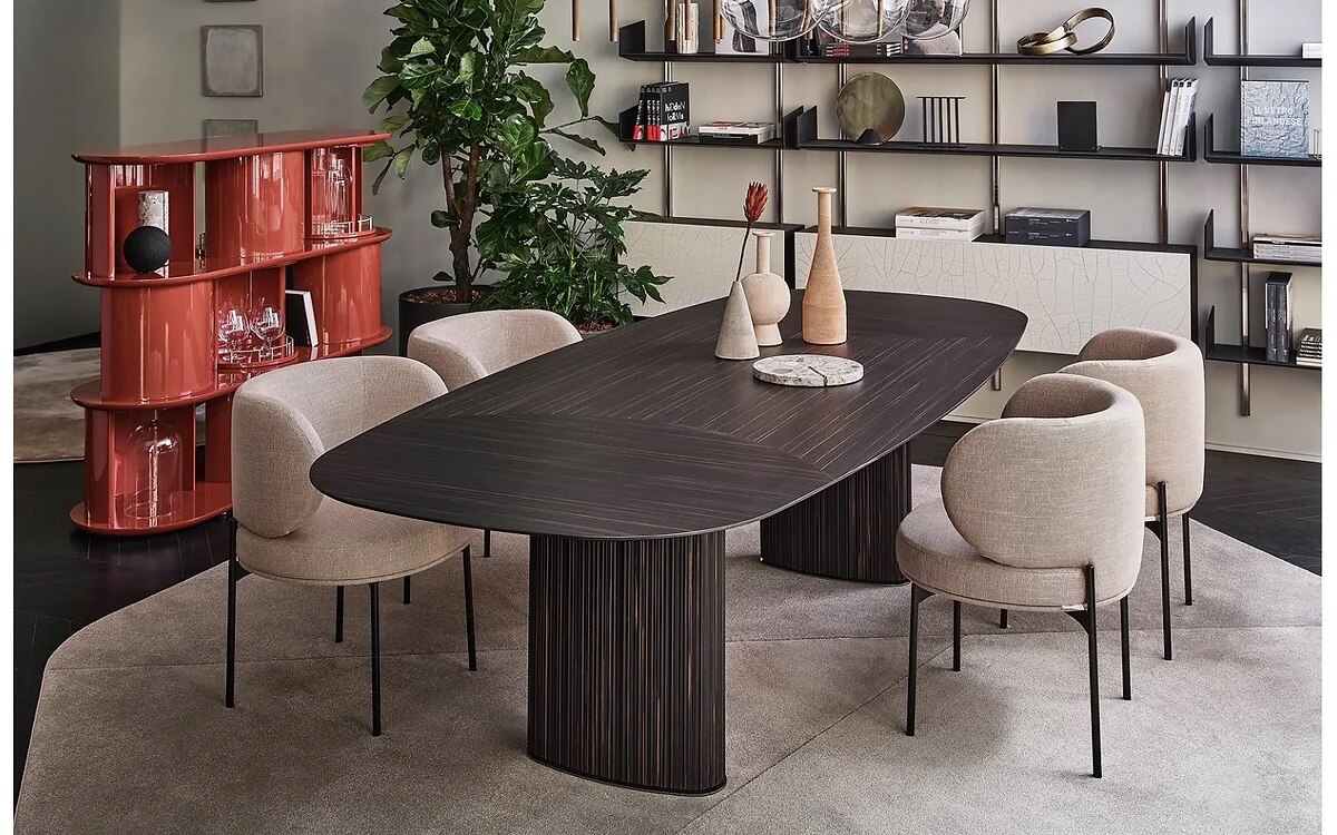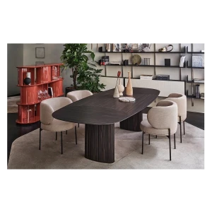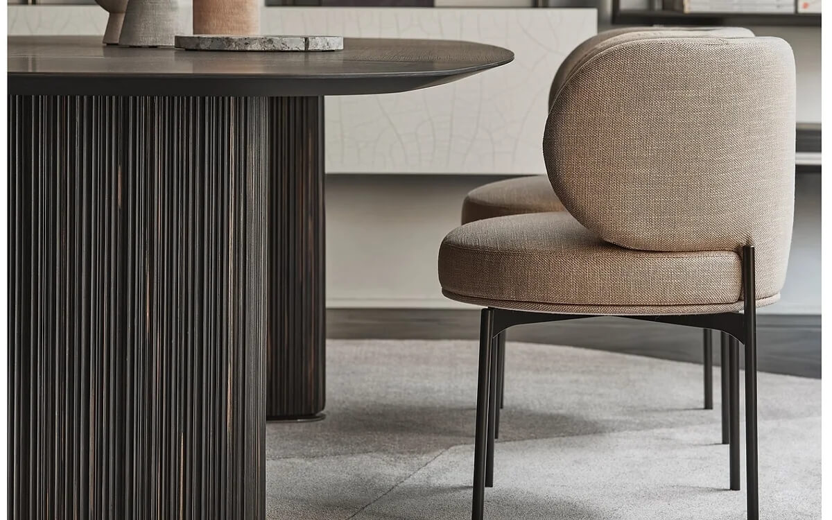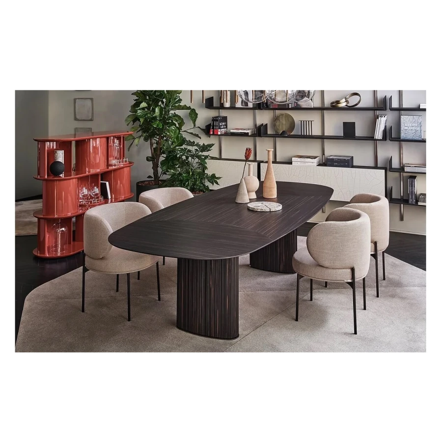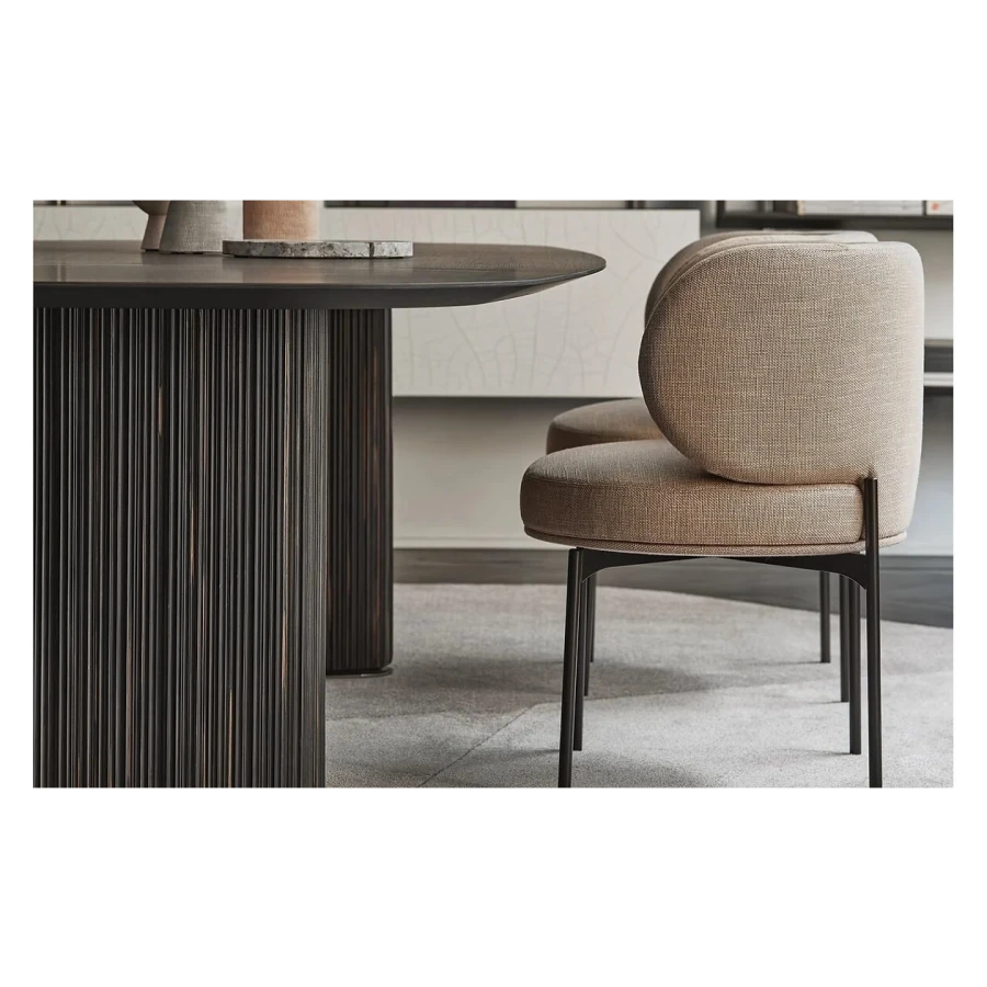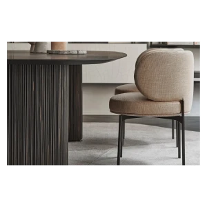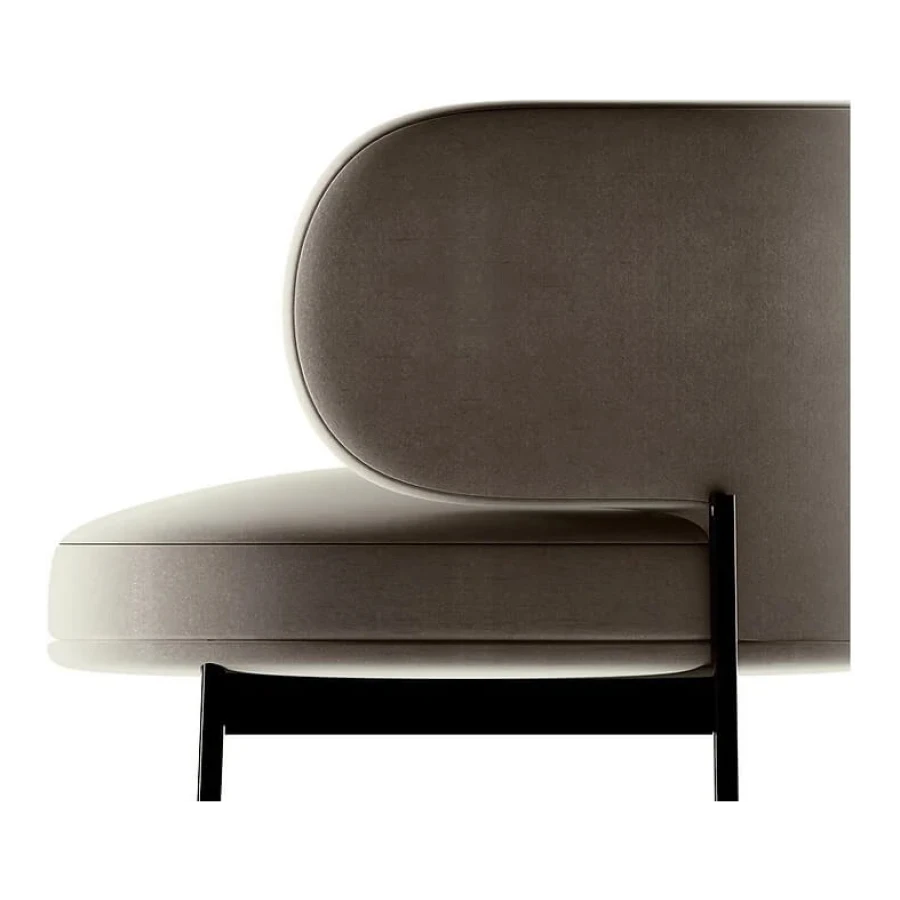 Chair with inside structure in wood and by-products. Padded with fire resistant non-deformable polyurethane foam in different density and fire resistant polyester fibre. Metal base lacquered in the “warm grey” colour. Available covered by fabric or leather as per sample. Not removable cover.