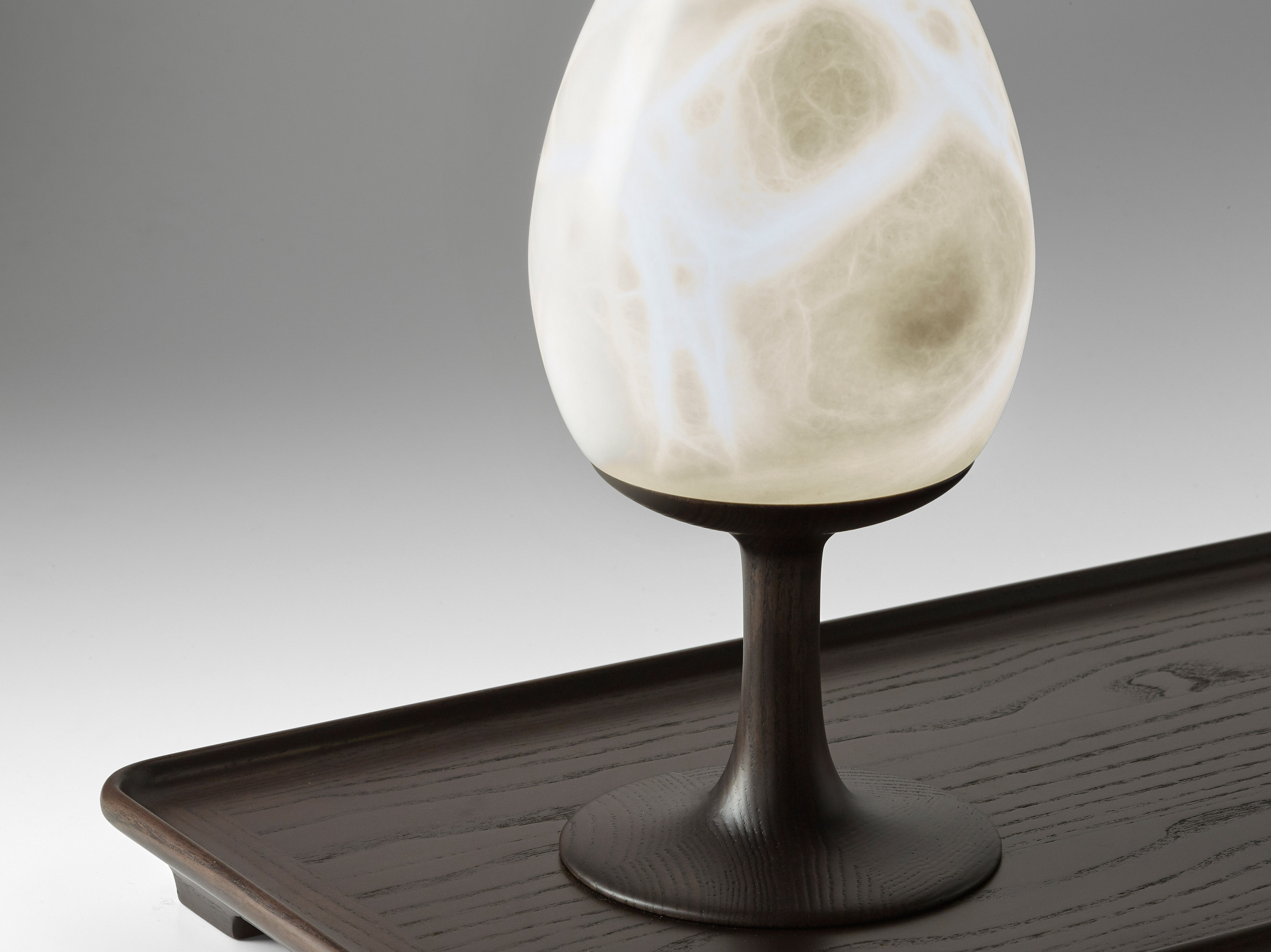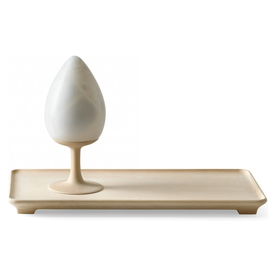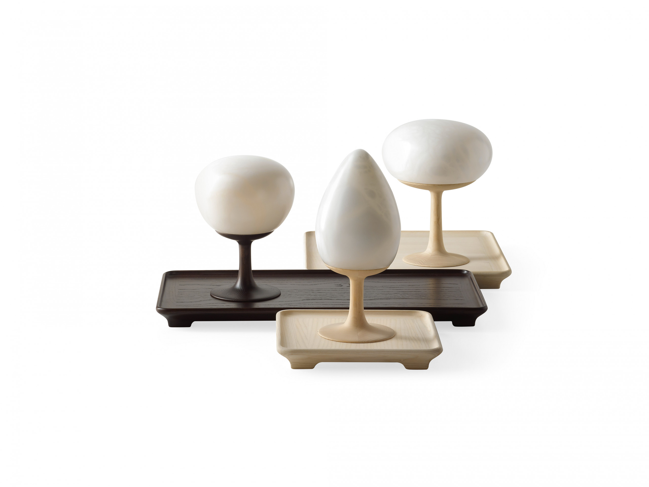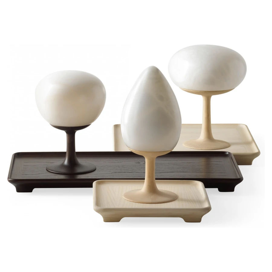 The tray – made of ash wood – features a lip around the edge and four feet that elevate it above the surface below, making its structure leaner and more elegant. On the slightly recessed surface, a tapered mushroom-shaped pillar holds the LED lampshade crafted of Volterra alabaster, a highly valued mineral identifiable by its bright white colour. The lampshade – which emits a warm, pleasant light – is available in a number of configurations which recall that iconic foliage of some typical Tuscan trees: the olive, cypress and the maritime pine. The velvety smooth wood and the flowing forms of the structure make this a sophisticated object both to view and to touch.