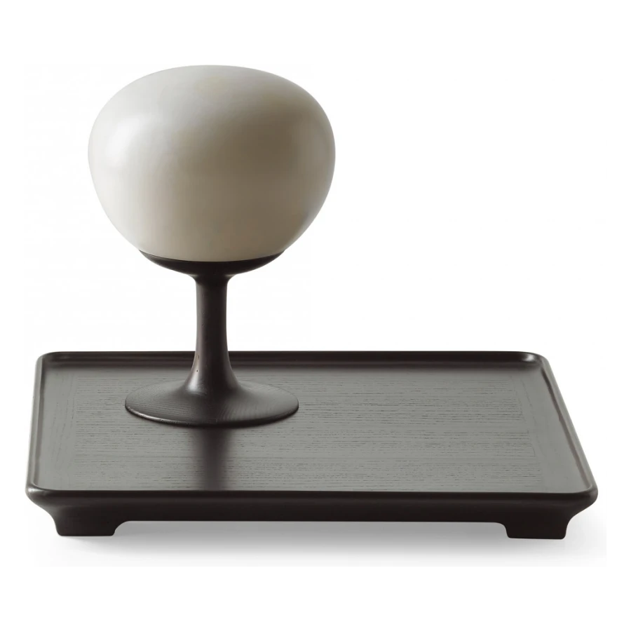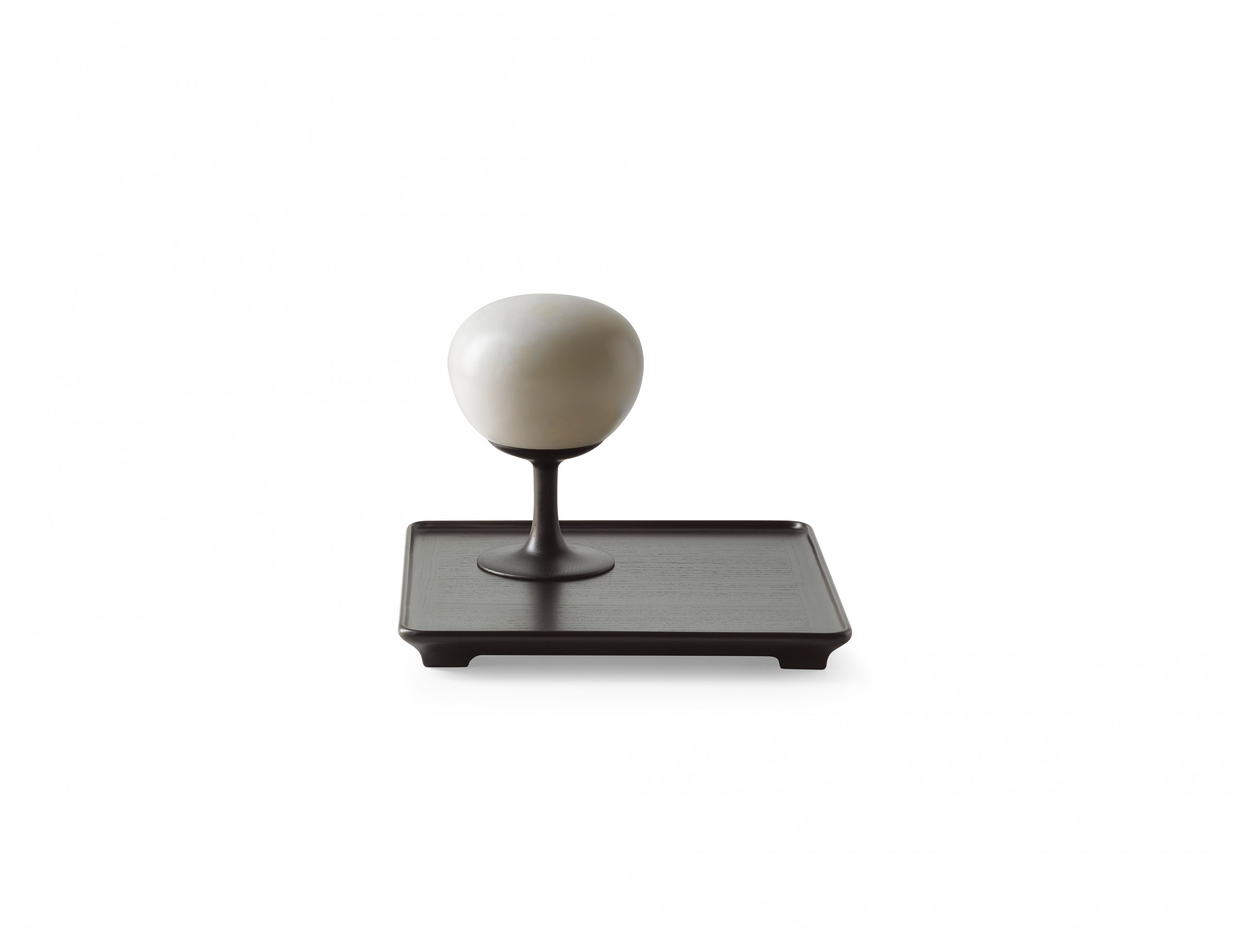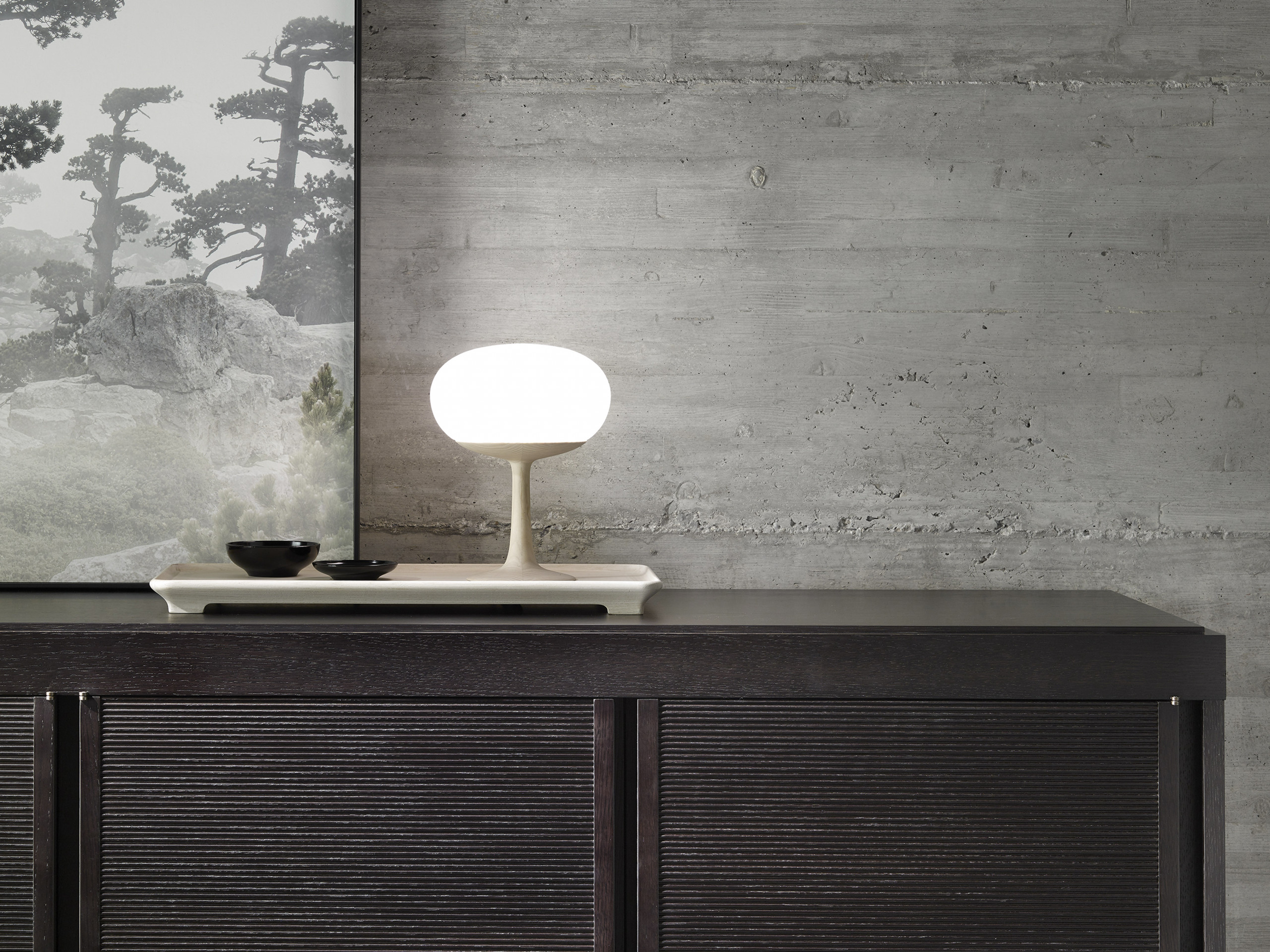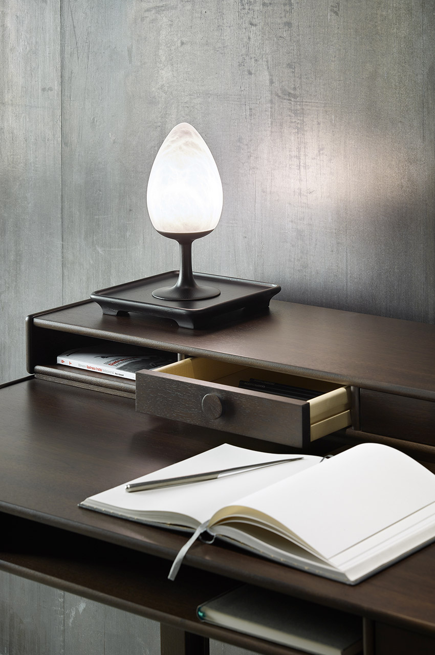 The tray – made of ash wood – features a lip around the edge and four feet that elevate it above the surface below, making its structure leaner and more elegant. On the slightly recessed surface, a tapered mushroom-shaped pillar holds the LED lampshade crafted of Volterra alabaster, a highly valued mineral identifiable by its bright white colour. The lampshade – which emits a warm, pleasant light – is available in a number of configurations which recall that iconic foliage of some typical Tuscan trees: the olive, cypress and the maritime pine. The velvety smooth wood and the flowing forms of the structure make this a sophisticated object both to view and to touch.