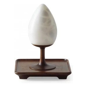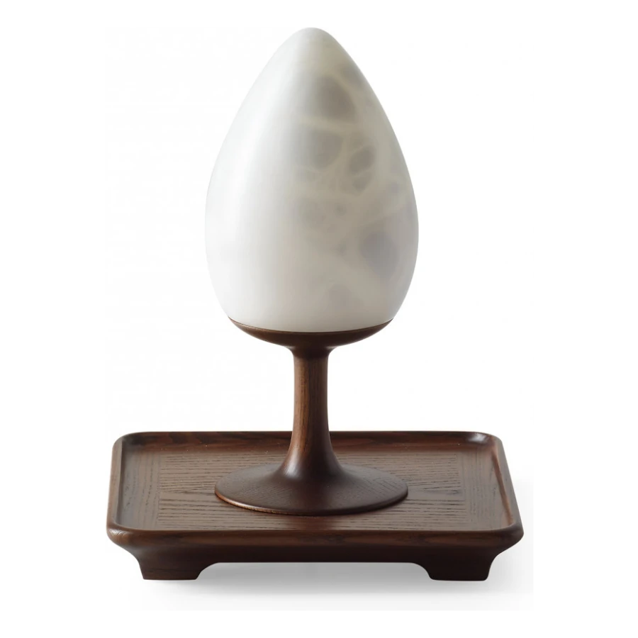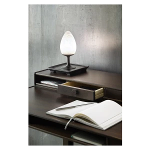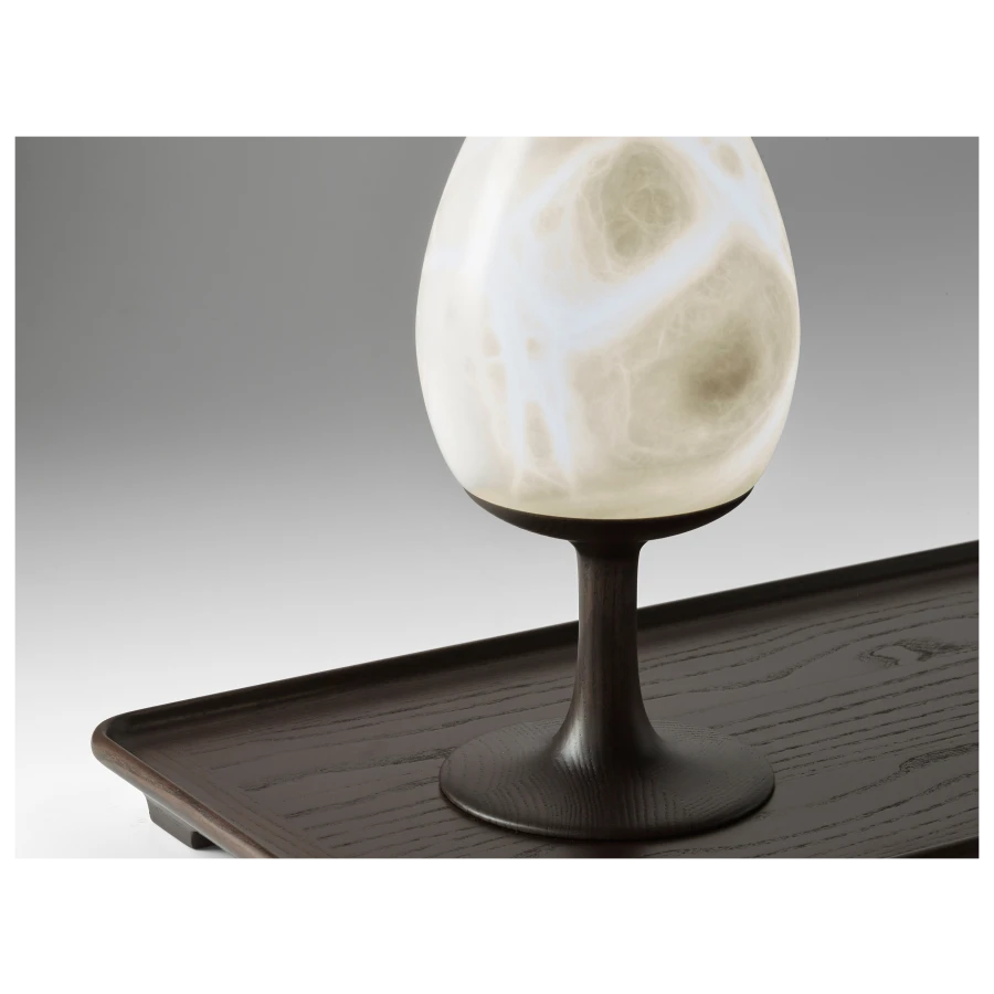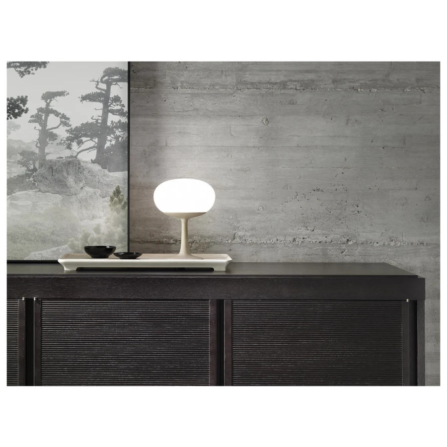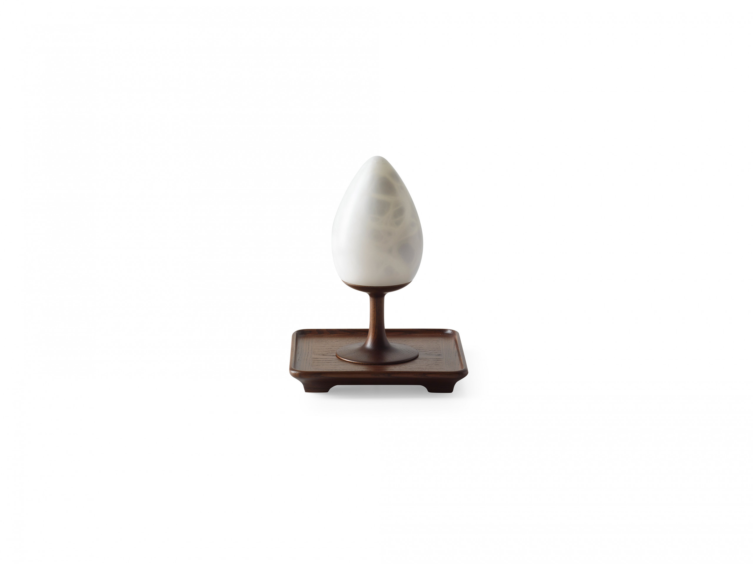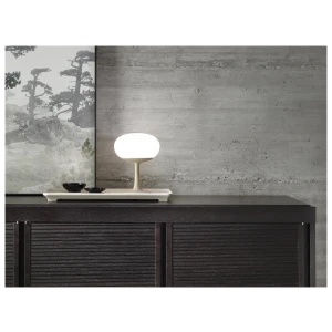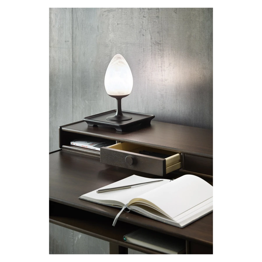 The tray – made of ash wood – features a lip around the edge and four feet that elevate it above the surface below, making its structure leaner and more elegant. On the slightly recessed surface, a tapered mushroom-shaped pillar holds the LED lampshade crafted of Volterra alabaster, a highly valued mineral identifiable by its bright white colour. The lampshade – which emits a warm, pleasant light – is available in a number of configurations which recall that iconic foliage of some typical Tuscan trees: the olive, cypress and the maritime pine. The velvety smooth wood and the flowing forms of the structure make this a sophisticated object both to view and to touch.