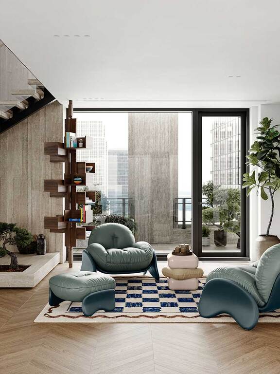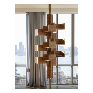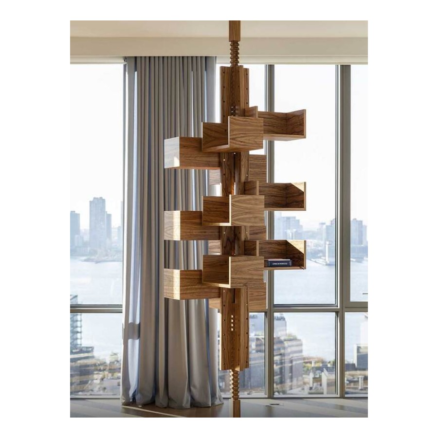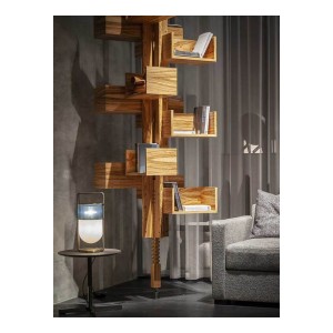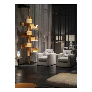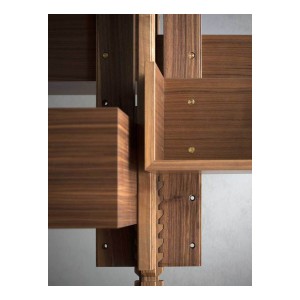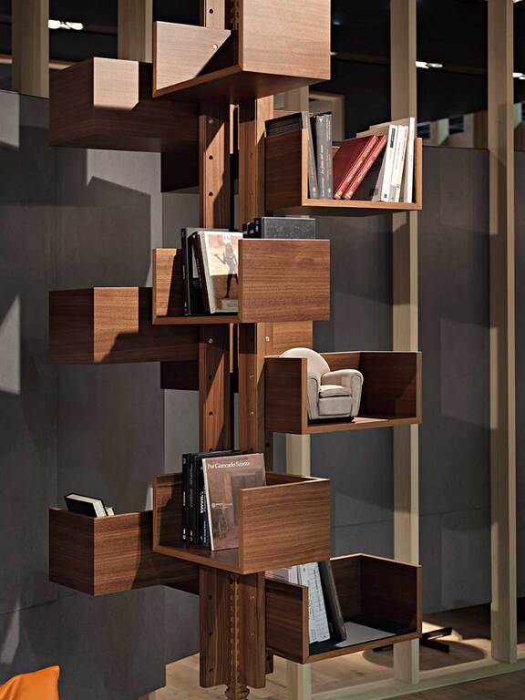 The structure is distinctive both for its intricate cabinet work and its sculpted appearance, which ensures that it is the centrepiece of the room. The supporting structure of the Albero bookcase is in solid Canaletto walnut. It consists of two notched columns, with a special rack joint, and four vertical posts with regular perforations allowing for the mounting of twelve shelves. The latter are in MDF with wood veneer. The caps, at the ceiling and on the floor, are attached to the ends of the toothed supports. The top cap is inserted in a “cup” anchored to the ceiling. The bottom cap grips the floor with a non-slip rubber. The bookcase is held securely in position by four metal locknuts in the caps. The fixing elements (caps and cup) have an antiqued burnished steel finish. The signature of the designer and the Poltrona Frau logo are laser engraved on the lower toothed support. The Albero bookcase can rotate 360°. Upon request and for an additional fee, the shelf surfaces can be embellished and protected with a 4 mm-thick Cuoio Saddle leather insert with tone-on-tone dyed edge. The insert has hand markings around the edge and is branded with the Poltrona Frau logo.