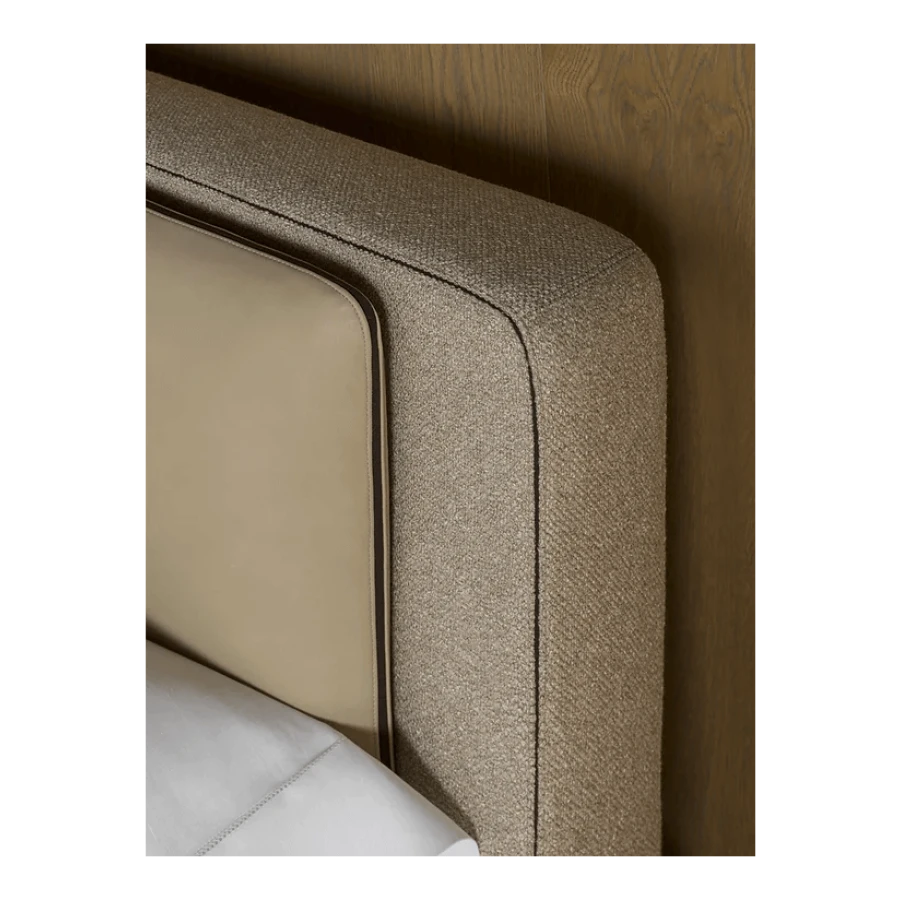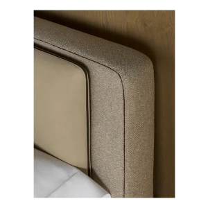 Designed as an isolated element, totally autonomous and self-sufficient, able to fit in with all kinds of bedroom furniture, Aldgate presents carefully designed details and soft, delicate and snug lines. Its heart is a container with rounded edges, unholstered in textiles or in leather and with sartorial finishes, embellished by a surrounding pewter frame that incorporates the bed, which can be positioned at different heights, and the rectangular backrest that recalls a monumental access road to the city. That too is rounded and it features two comfy cushions to lean back on.