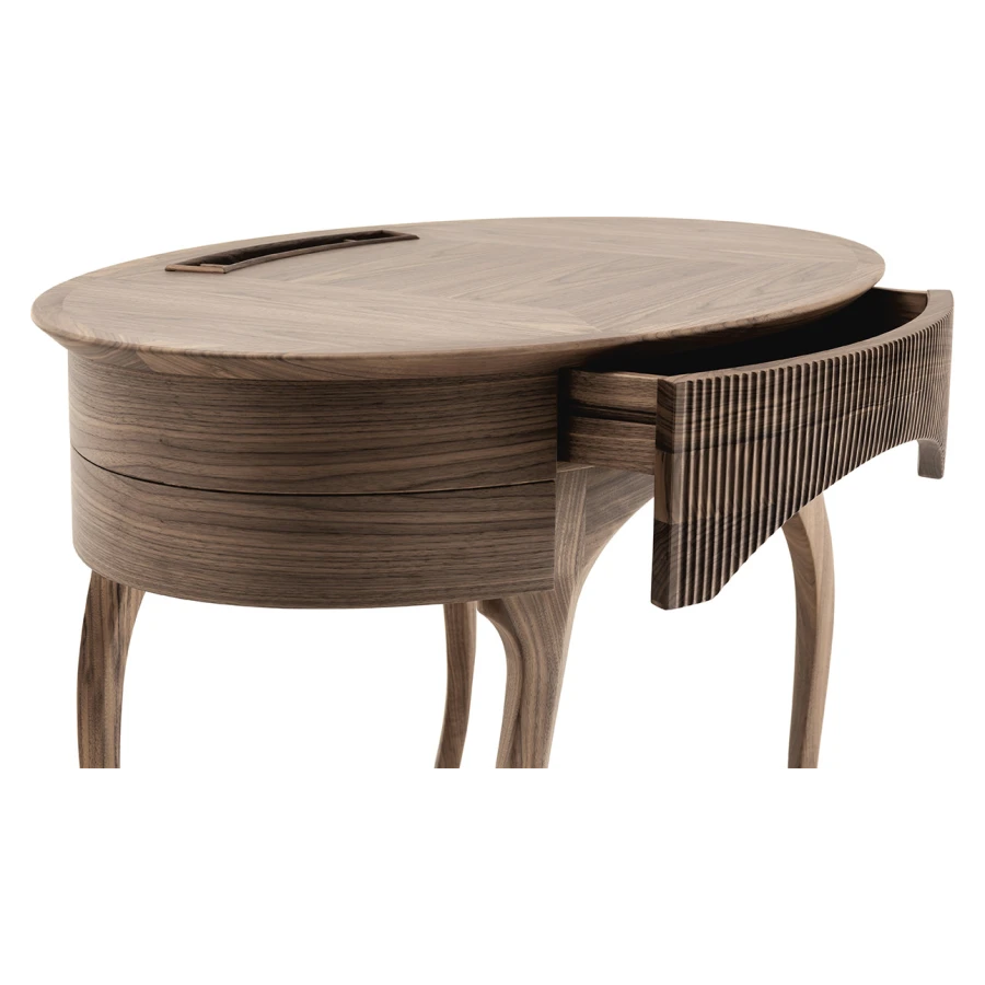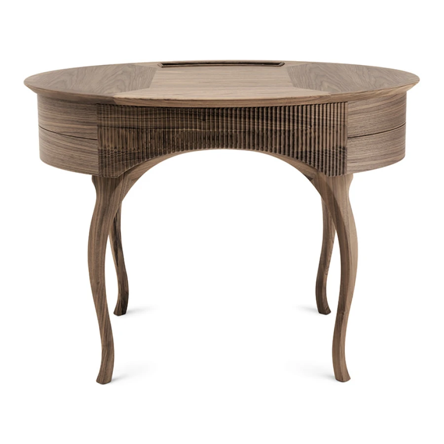With its graceful and rounded shapes, the small desk can be placed in any environment, from the living room to the bedroom. Made of solid American walnut and veneered plywood, the desk’s small dimensions do not prevent it from satisfying every storage requirement, thanks to the central drawer and the swivelling side drawers.