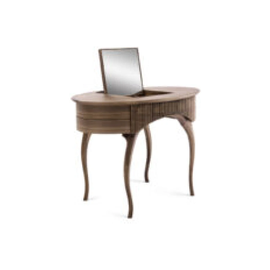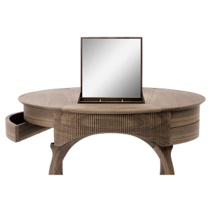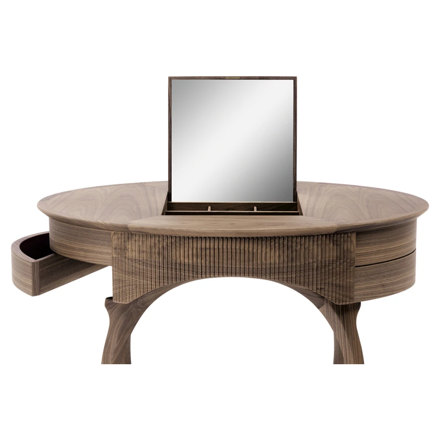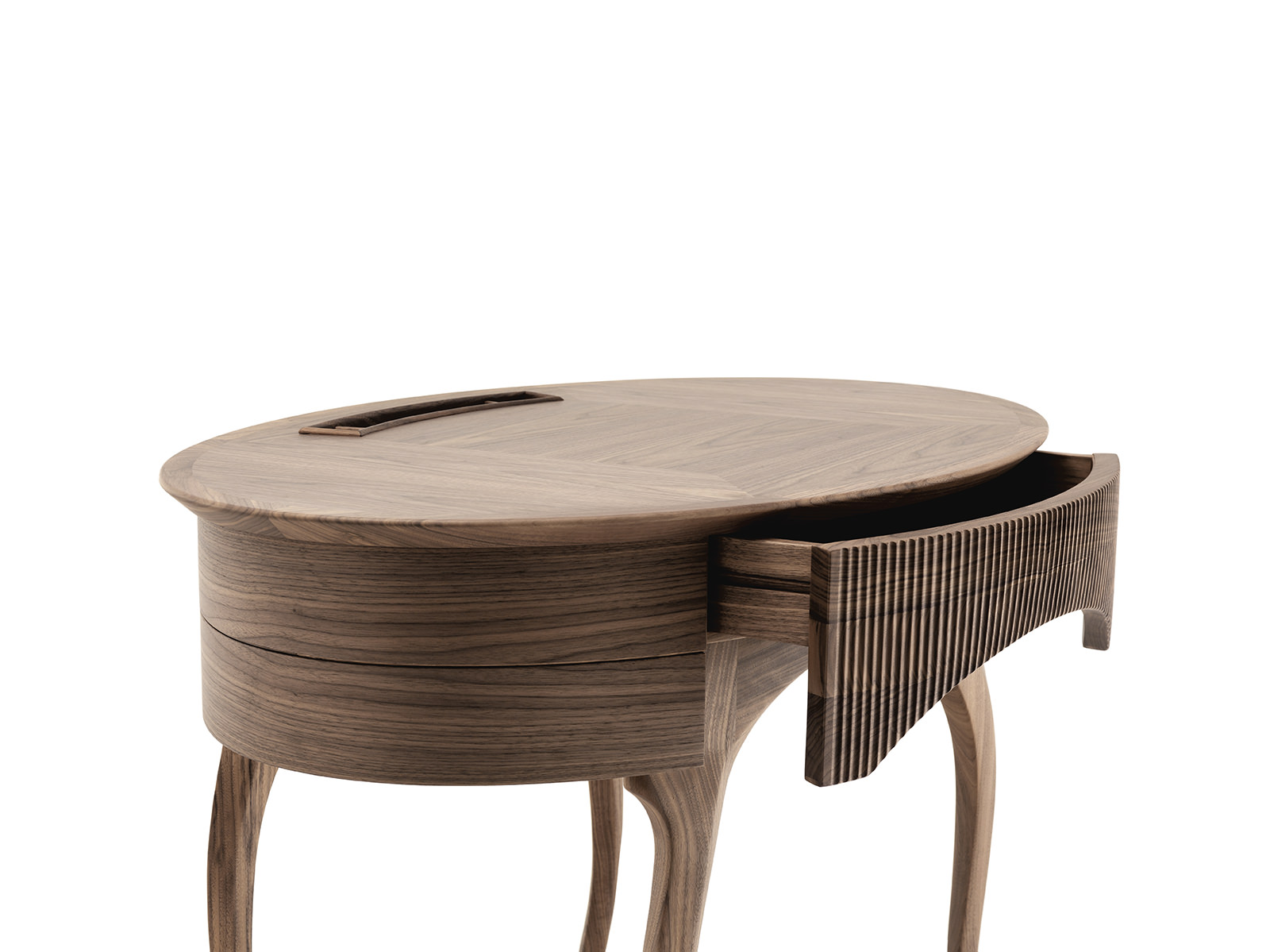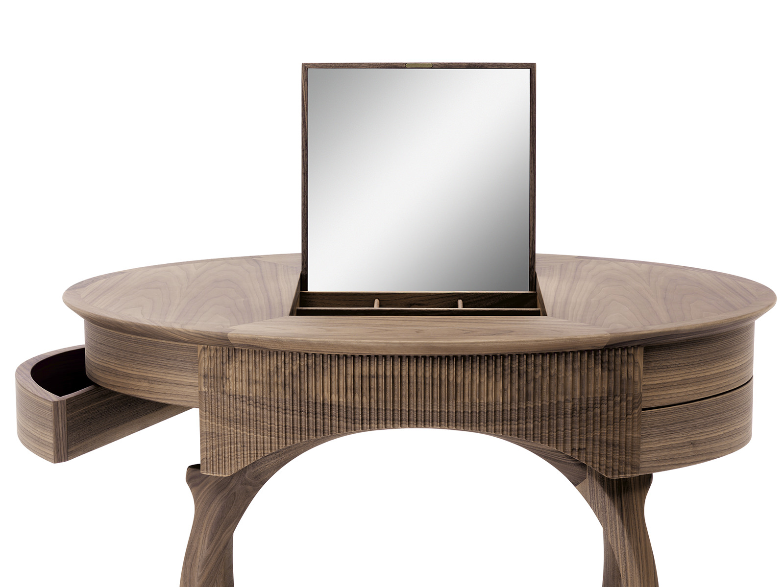 After 10 years, given its success, Arabella shows her vain side, transforming into Toilette. Produced in solid American walnut and veneered plywood, it has a central top which, when tipped upwards, becomes a mirror and displays the internal wooden dividers. The revolving side drawers remain unchanged. A design that becomes even more functional when the dressing table is equipped with a LED light under the folding top.