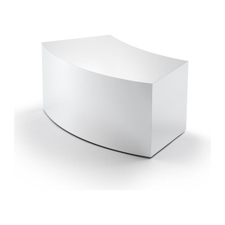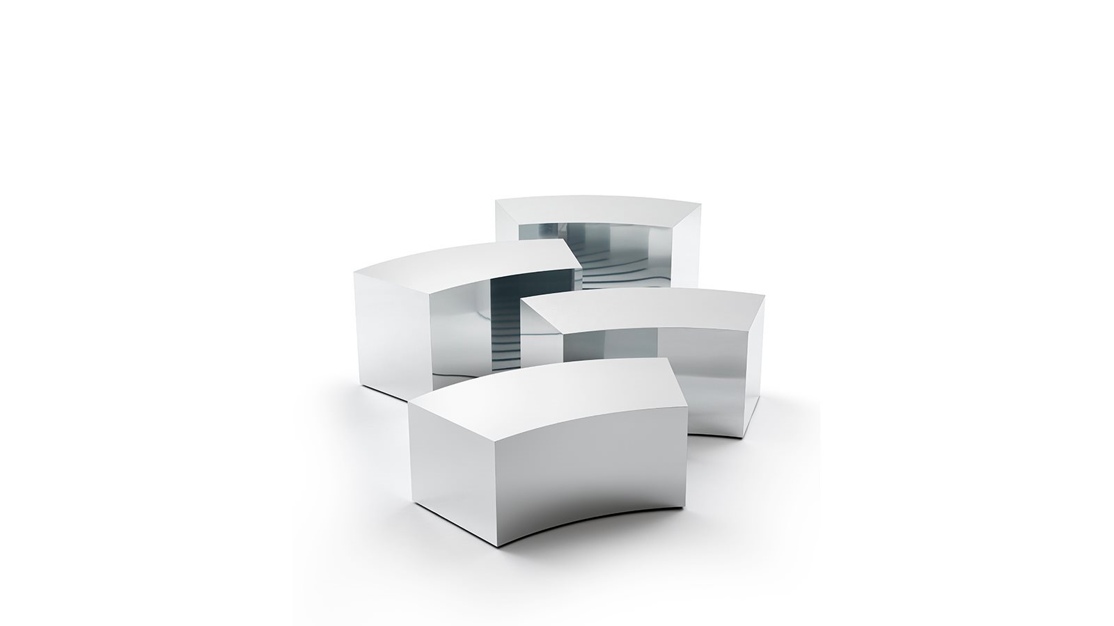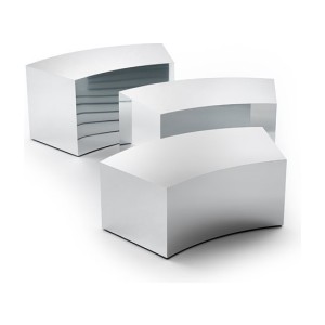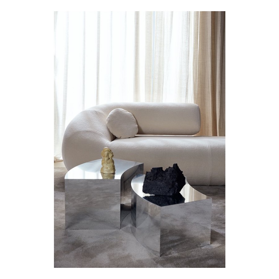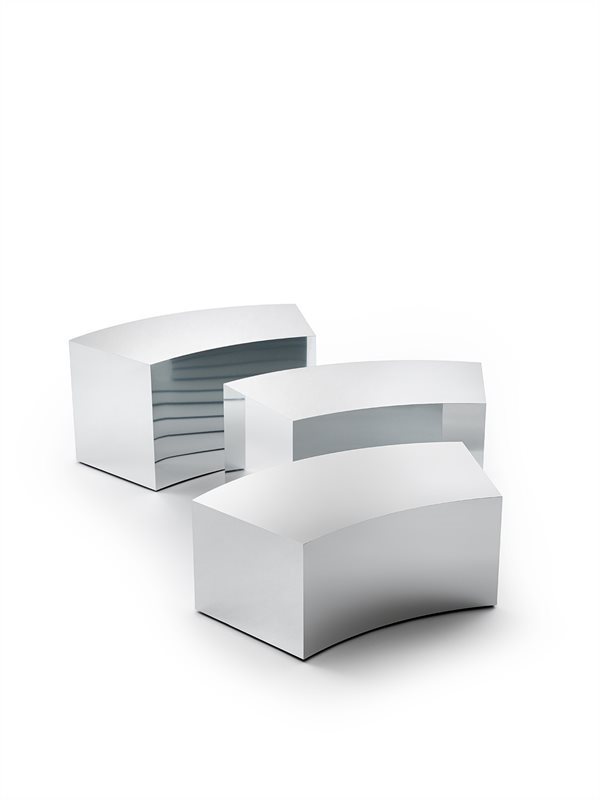Side table made of glossy honeycomb aluminum panels. Mounted on castors.