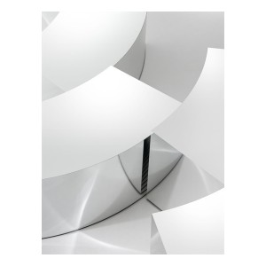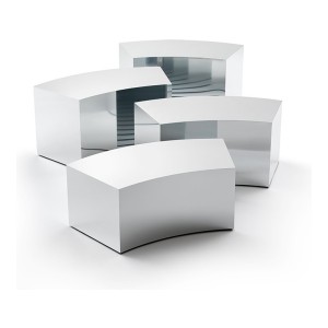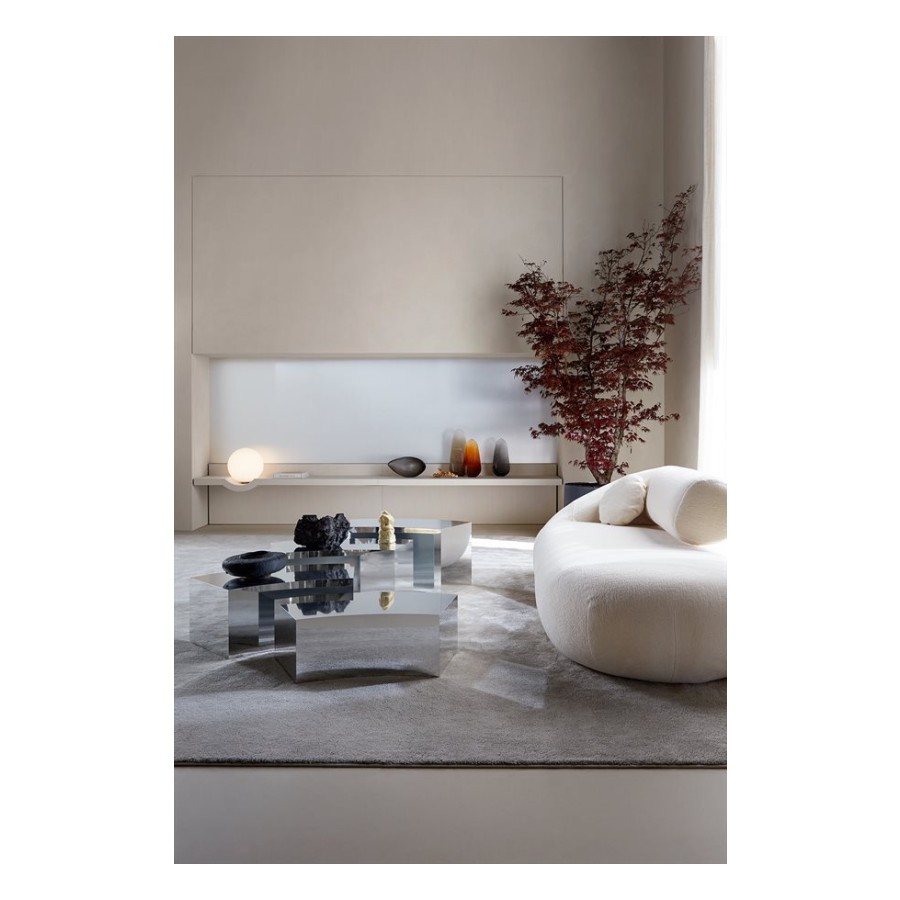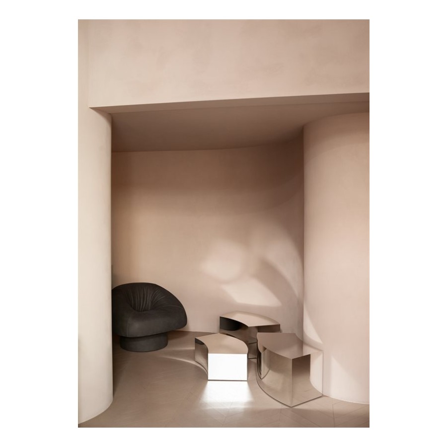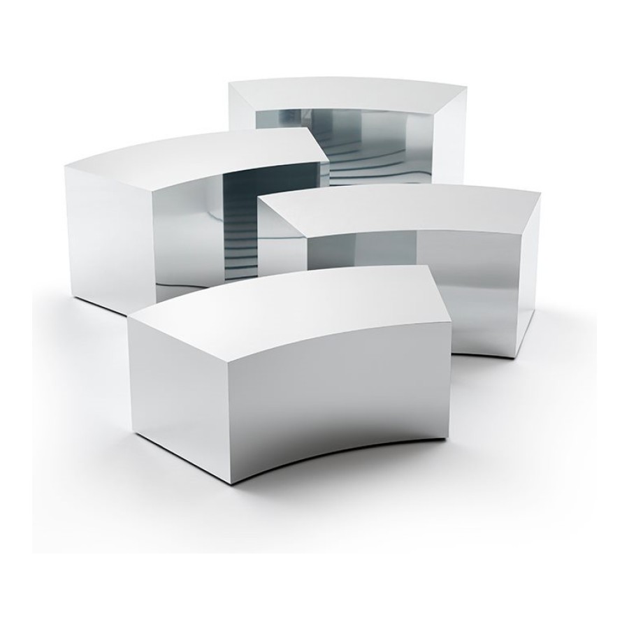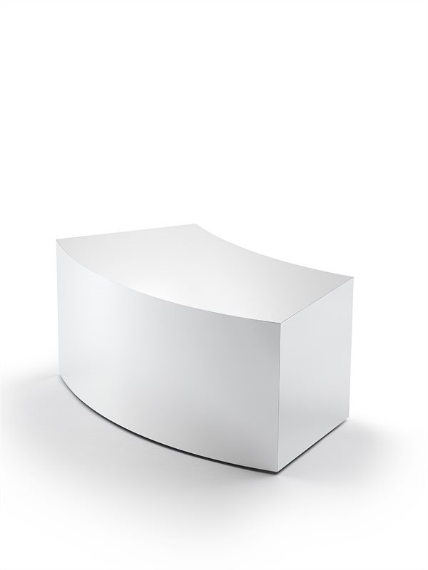 Side table made of glossy honeycomb aluminum panels. Mounted on castors.