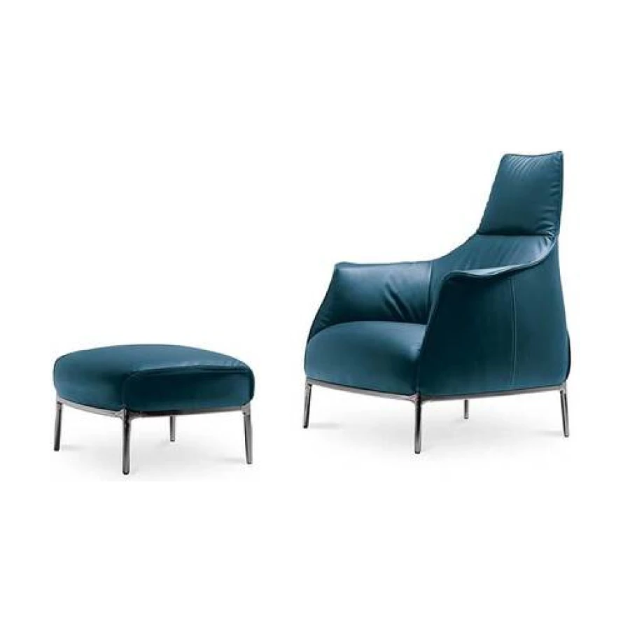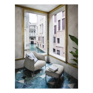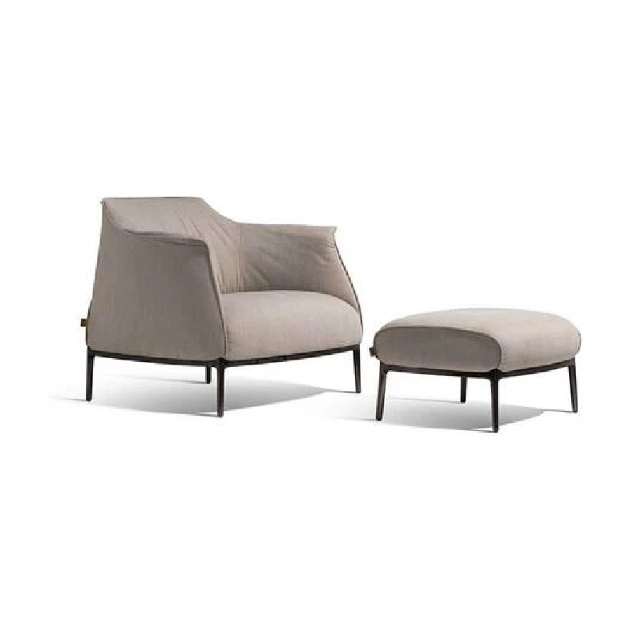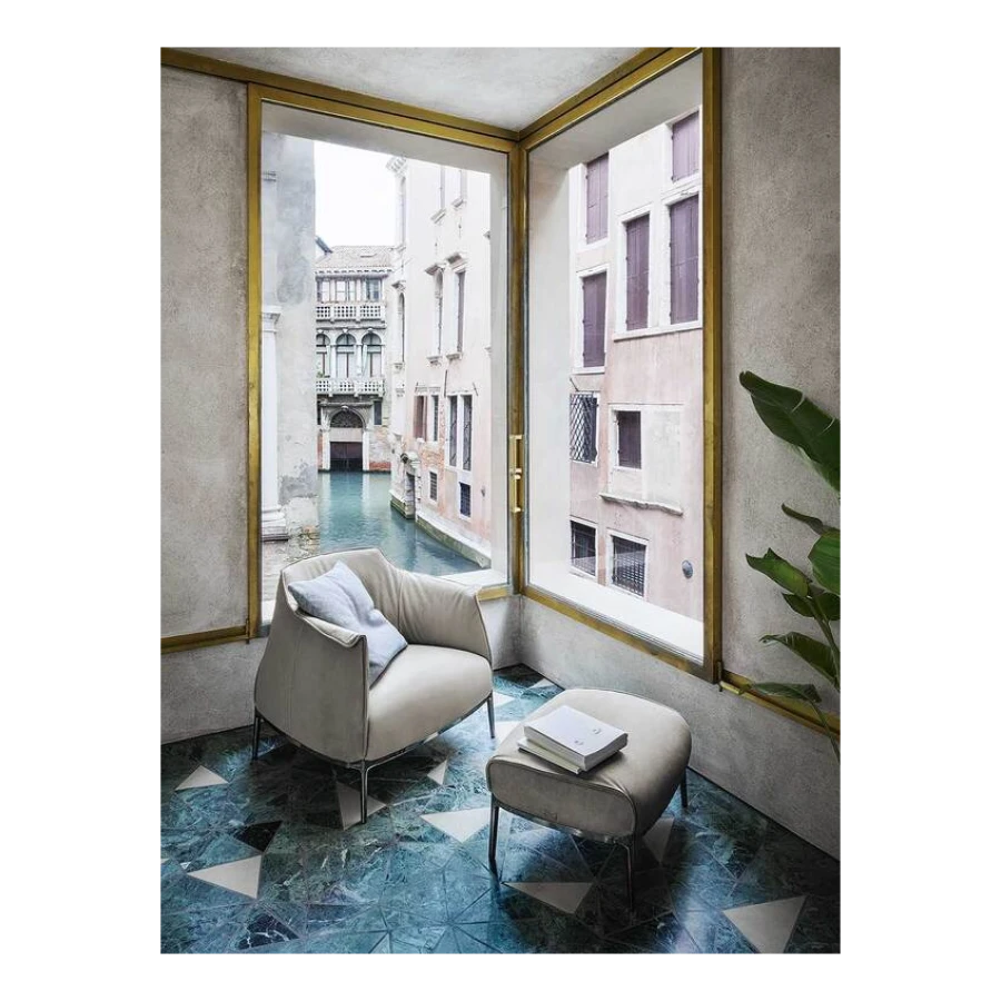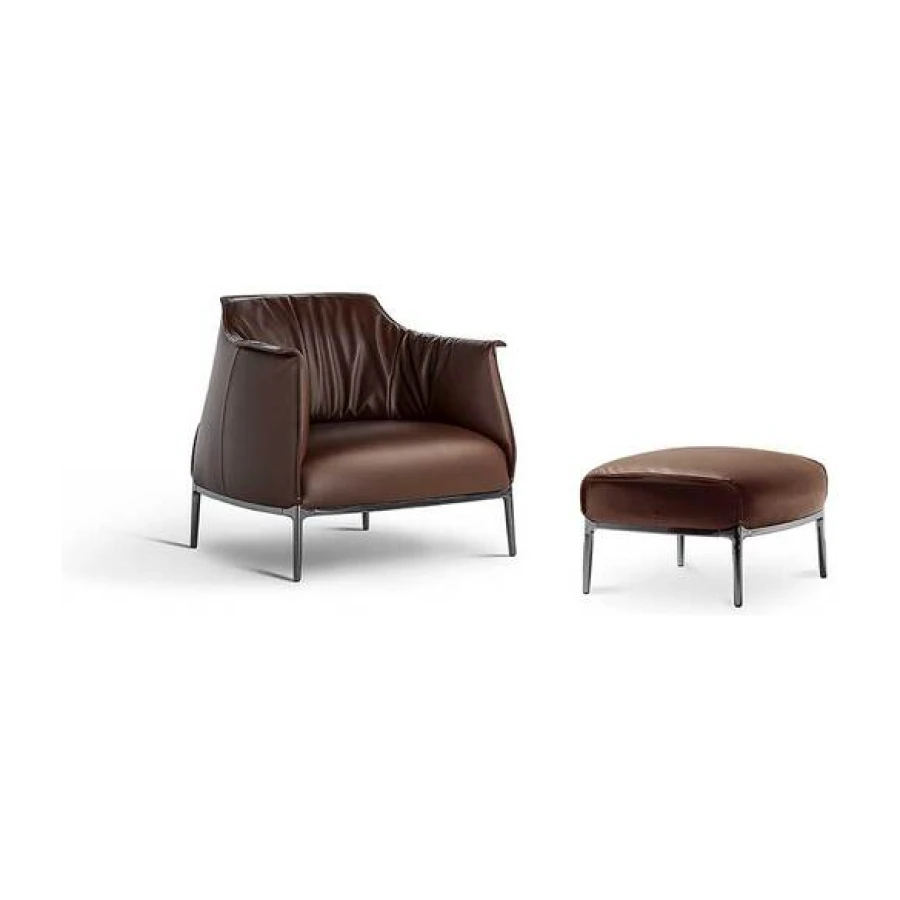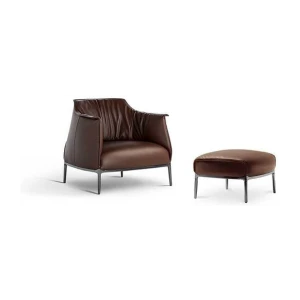 The Archibald pouf is available with upholstery in Pelle Frau® leather or removable fabric, with contrasting stitching in the leather version and tone-on-tone for the fabric one. The supporting structure is made of steel, while the padding is polyurethane foam, with polyester wadding applied to the areas where extra comfort is needed. The base consists of four cast aluminum feet and tubular steel frame with various finishes available. Springing is provided by elastic straps.