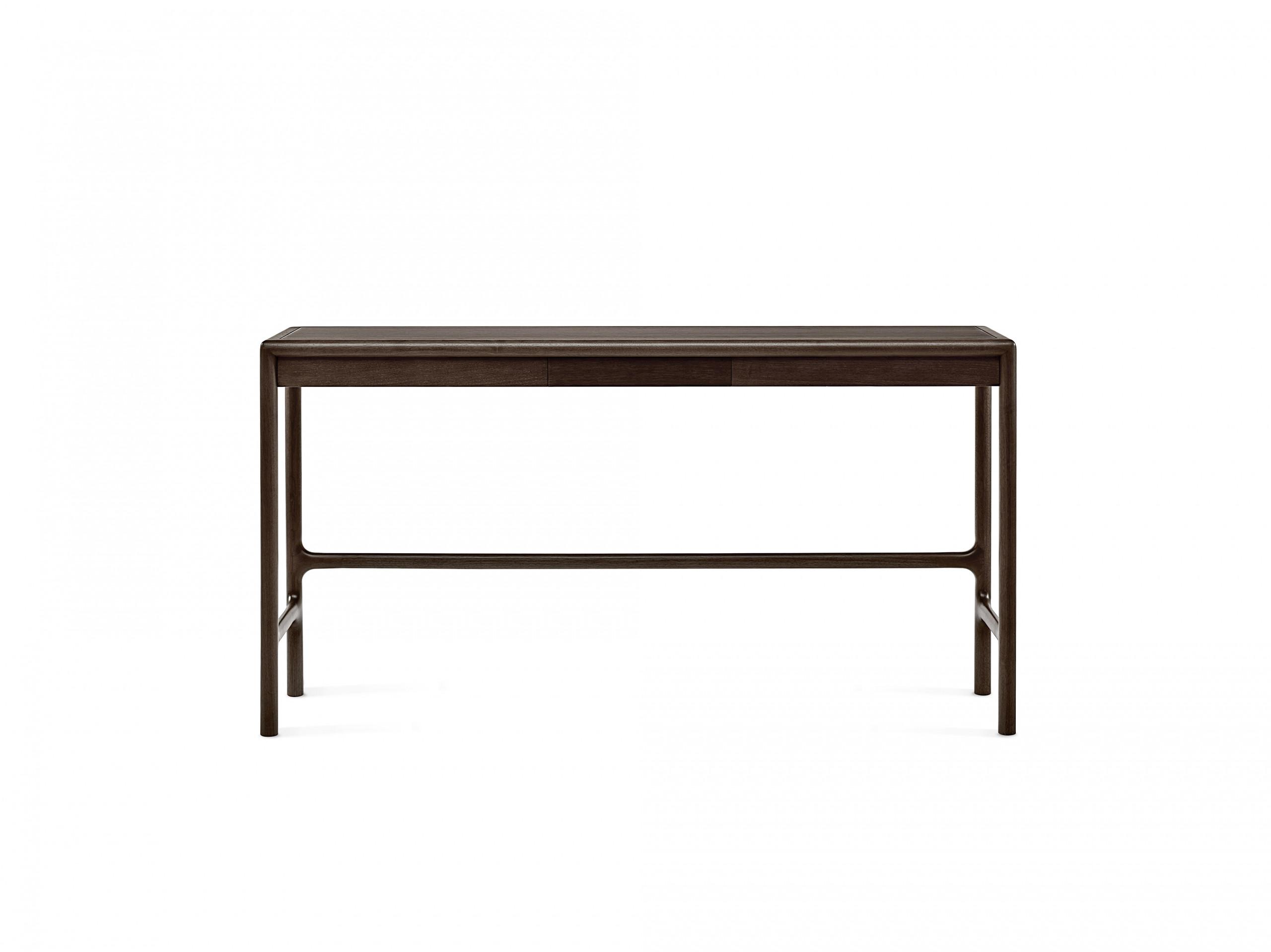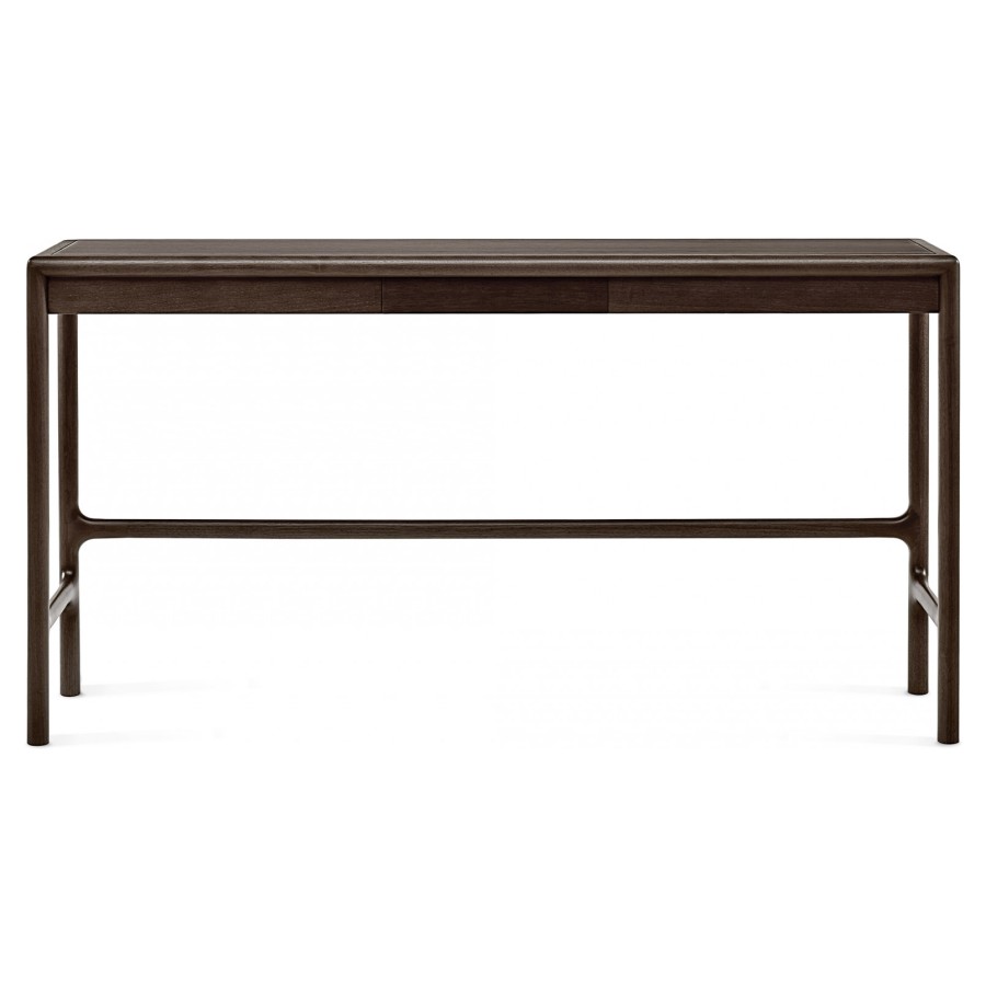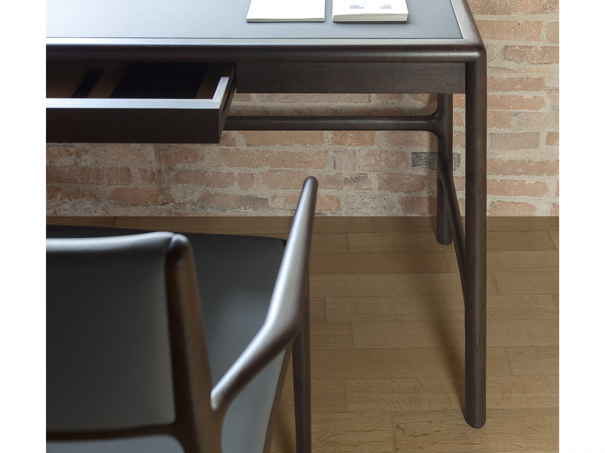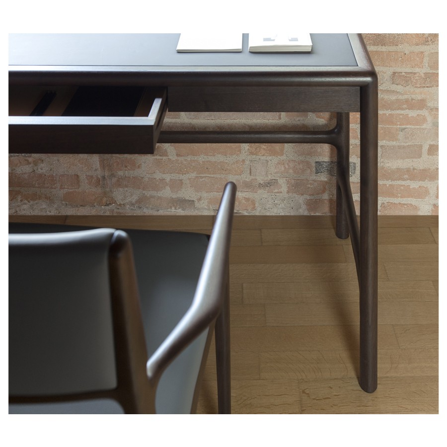 Conceived in 2013 with very small dimensions, it seems to be designed for the new dynamics of domestic living. Made of solid American walnut and veneered plywood, it has a round section that characterizes the legs and crosspieces. A stylistic solution also evident on the top frame, which can be covered in wood or leather.