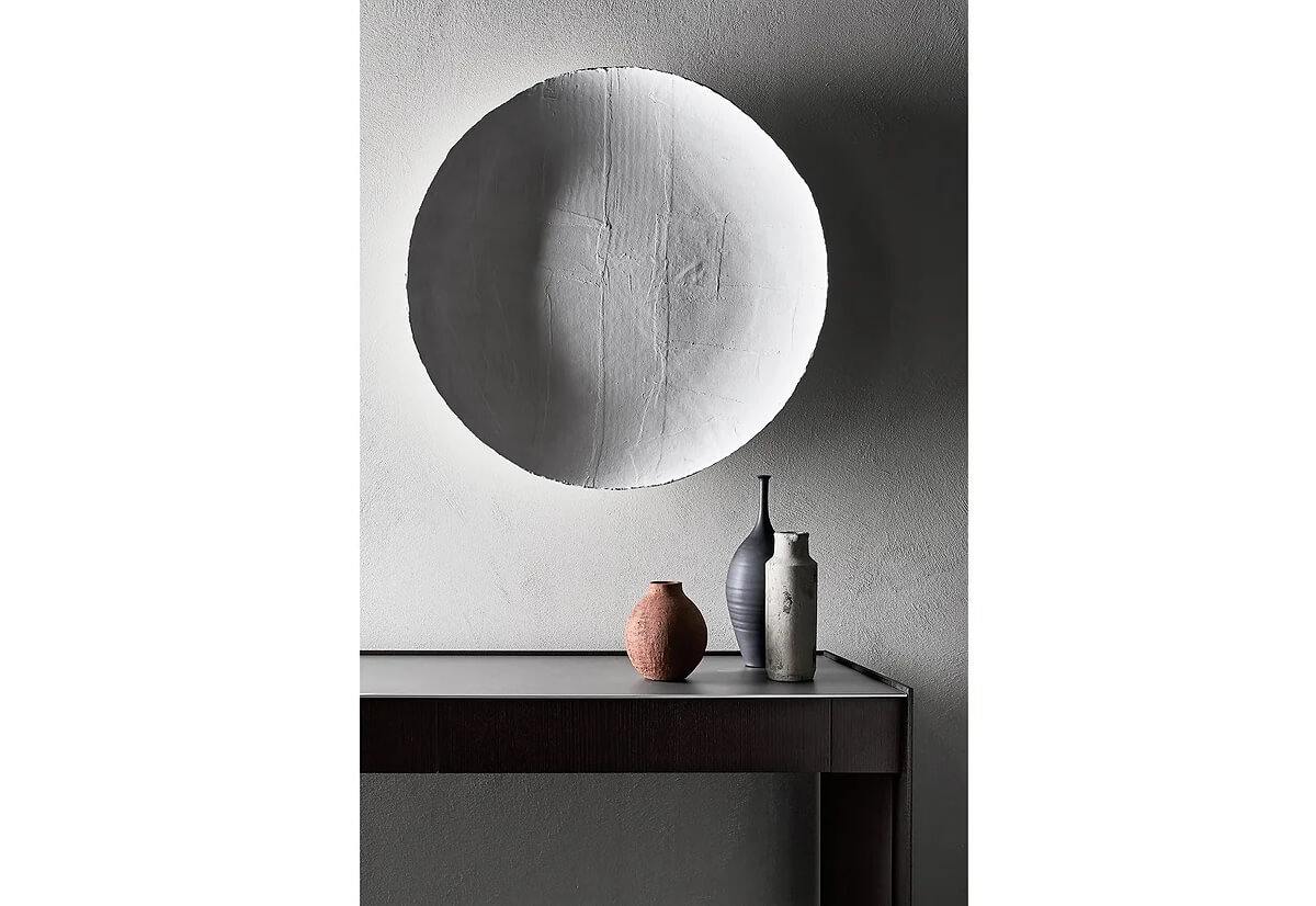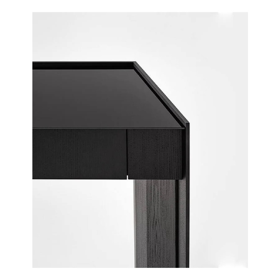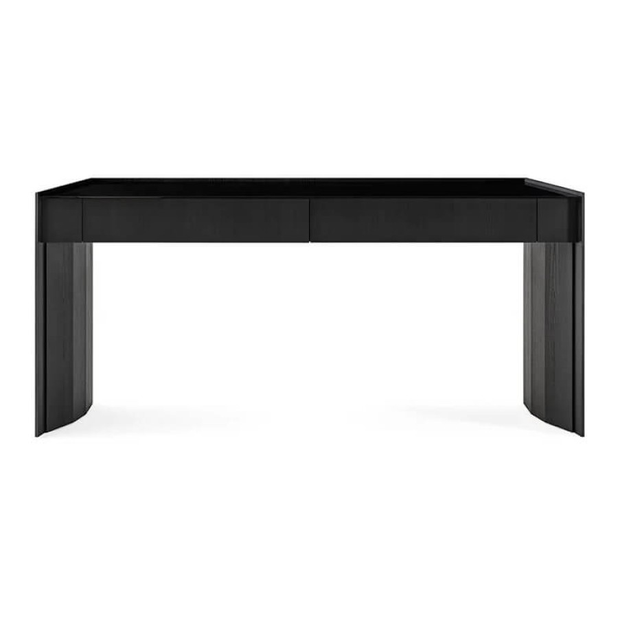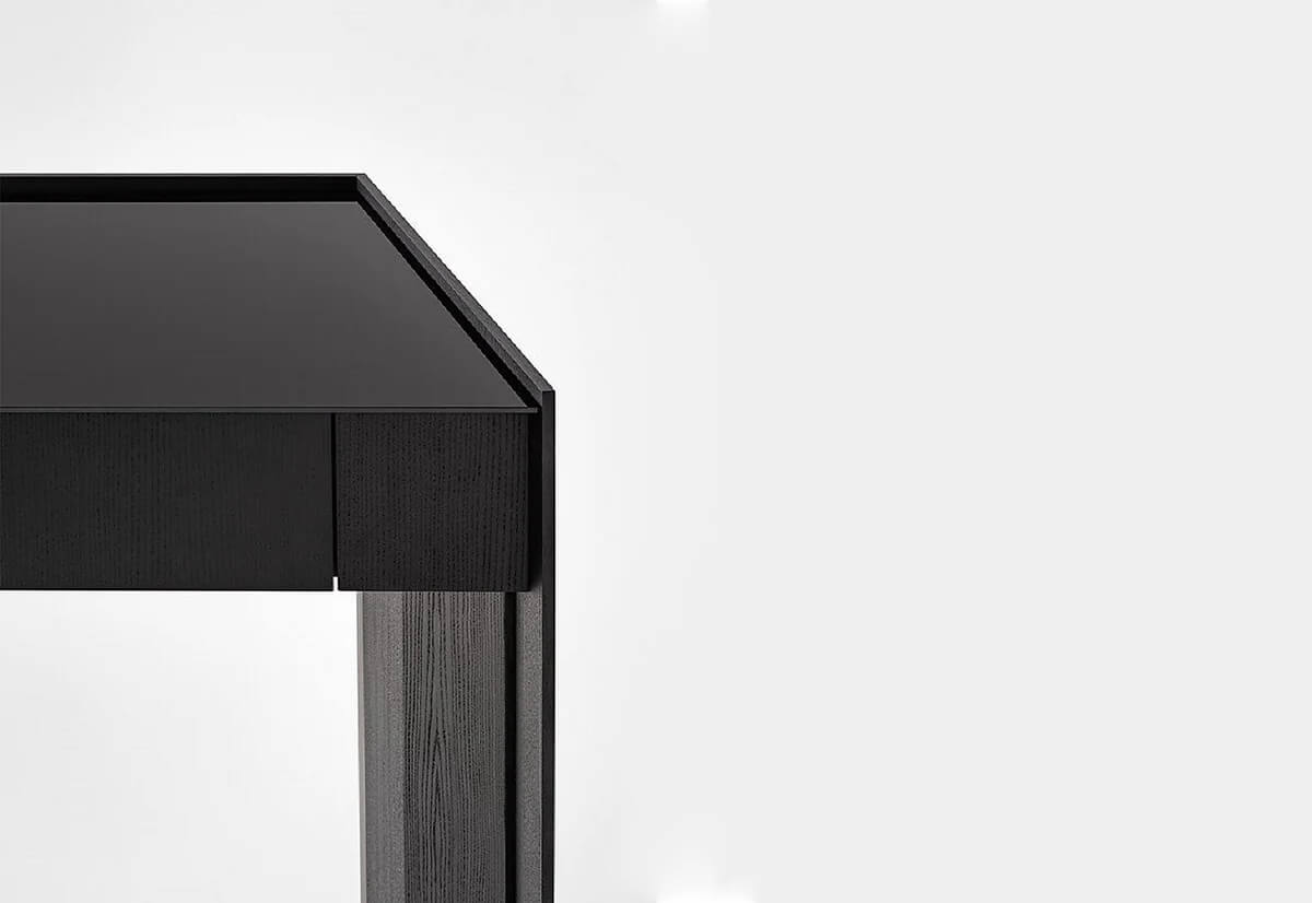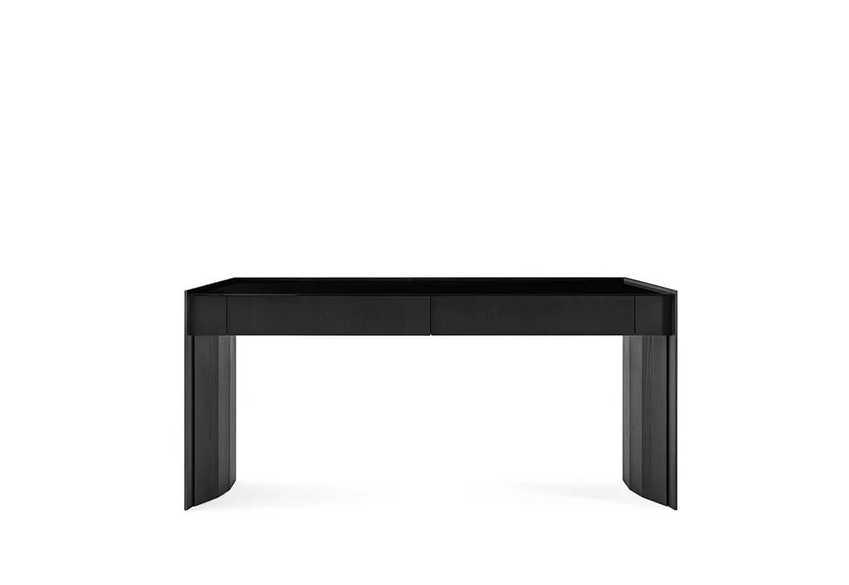 Console in black open pore lacquered ash. 6mm bright black painted glass top. Also available painted with the exclusive brushed “Cashmere” finish in the gold grey or anthracite colours. Total pull-out drawers with suede sand 006 bottom.