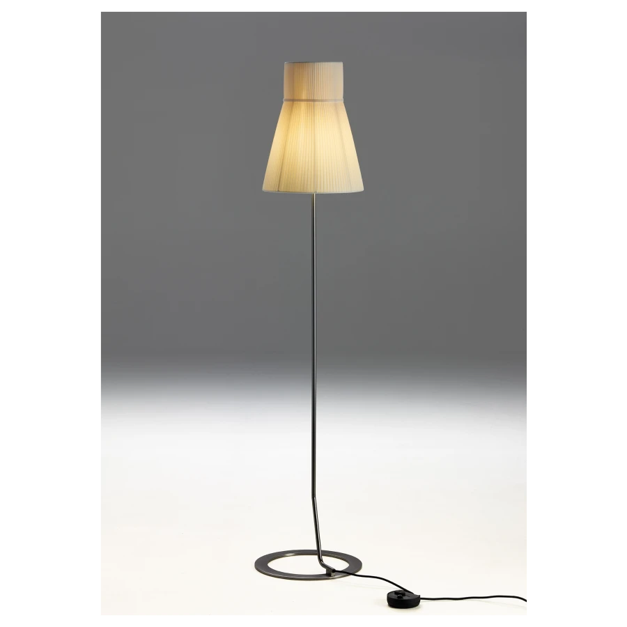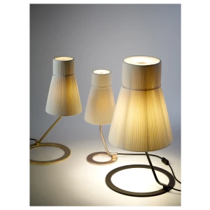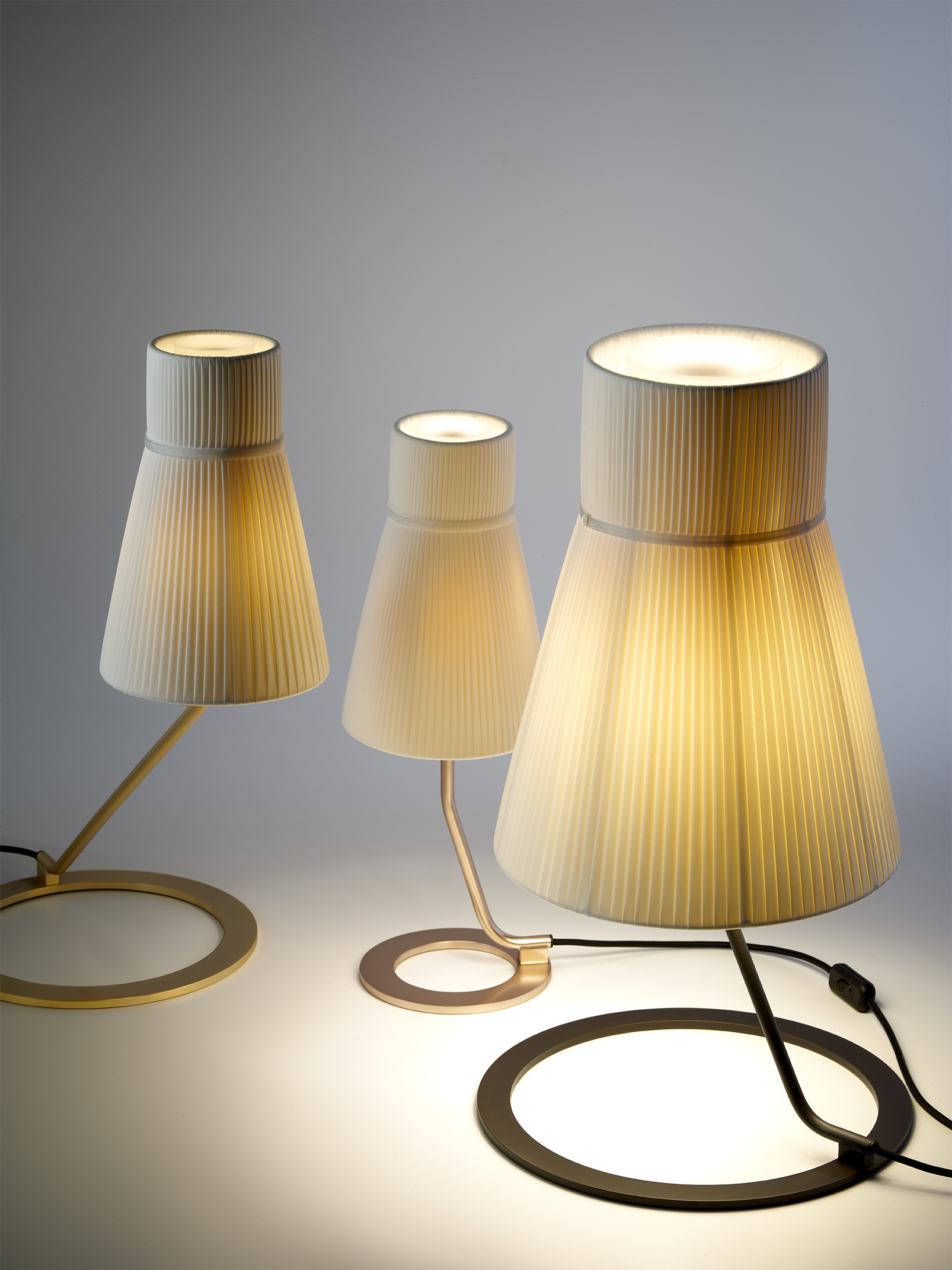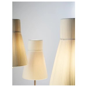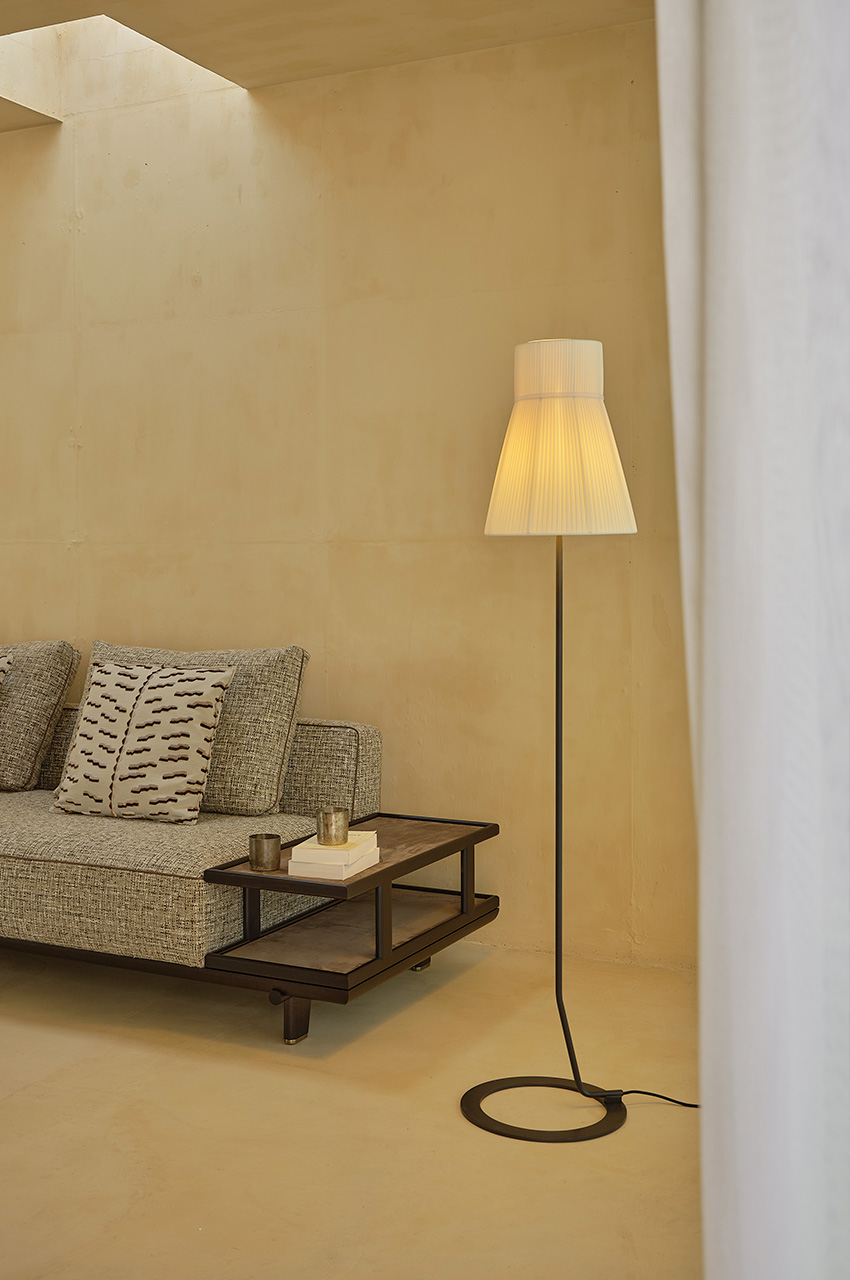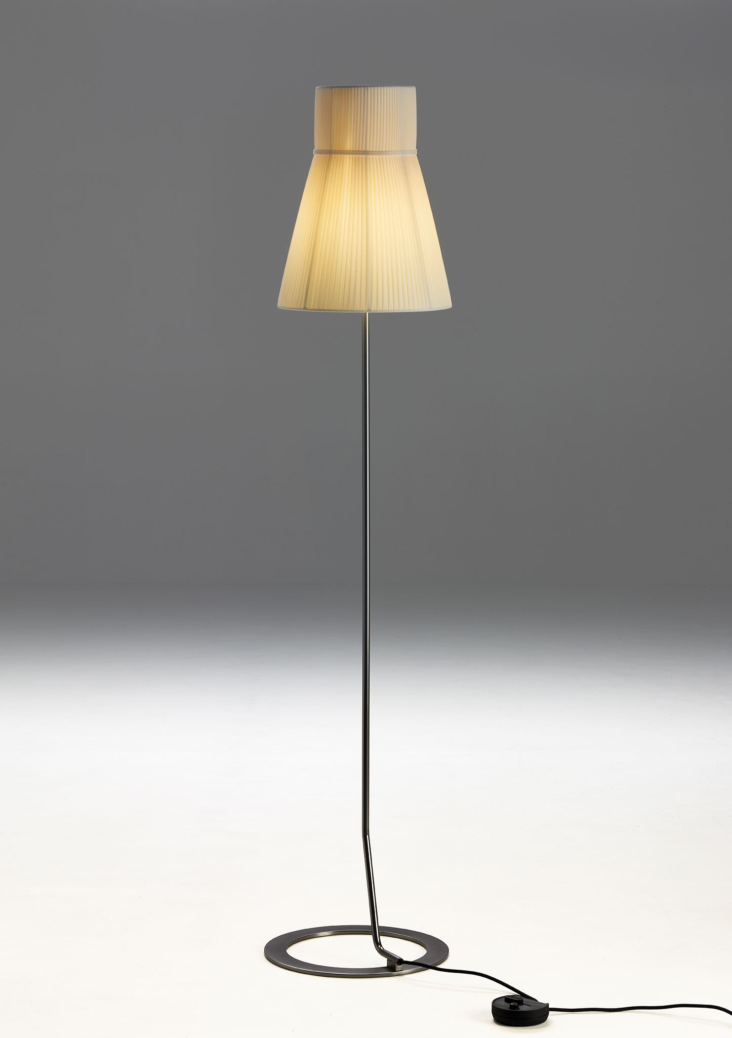 Audrey is a collection comprising bedside lamps, desk lamps, table lamps and floor standing fixtures. Their simple linear structure consists of a metal shaft resting on which is a lampshade in pleated fabric and white frosted glass whose original shape recalls that of a hat used by British actress Audrey Hepburn. The lampshade ribbon is in tone-on-tone velvet with a mother-of-pearl button.