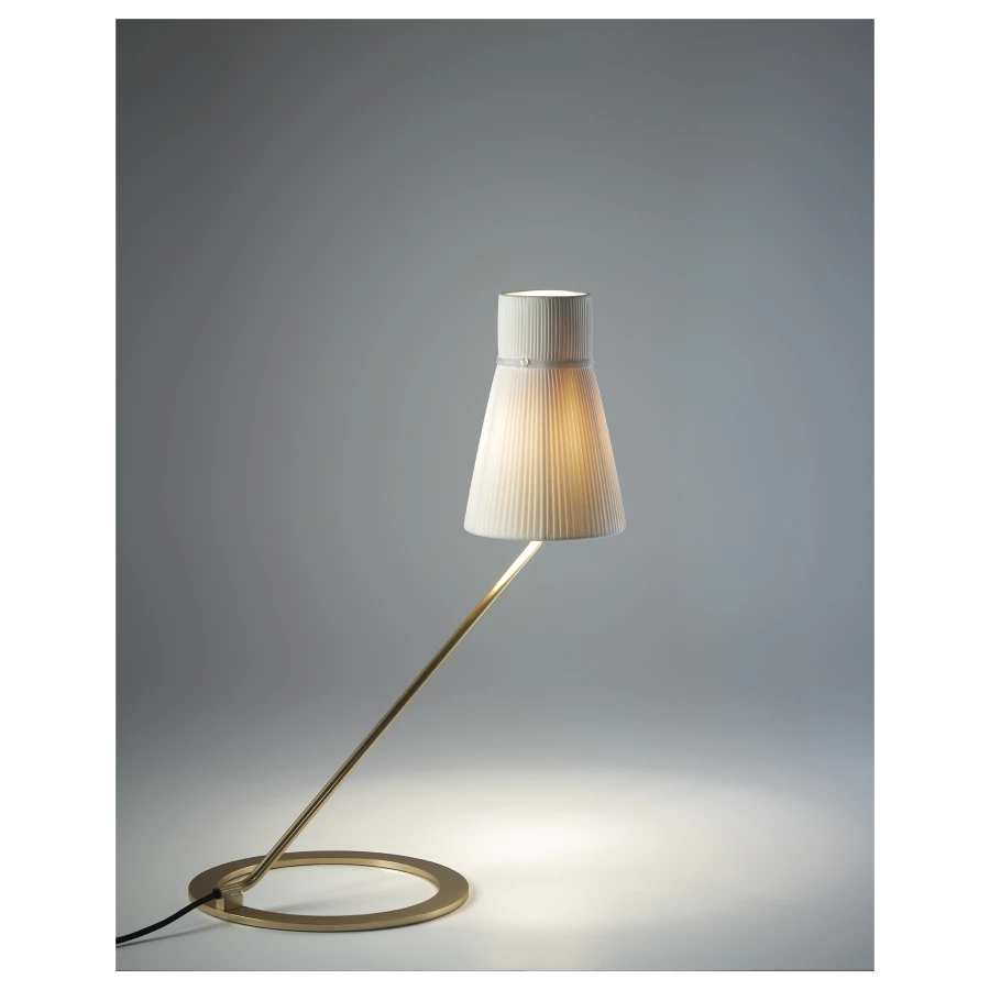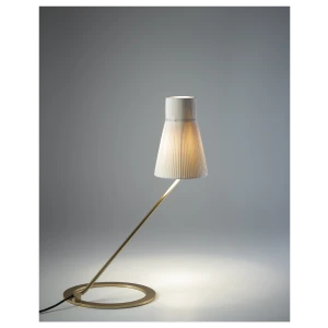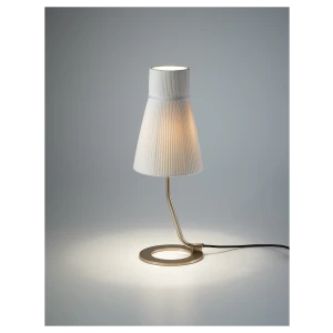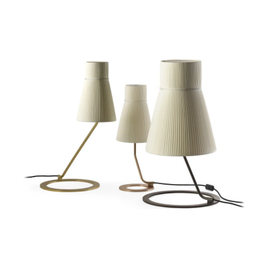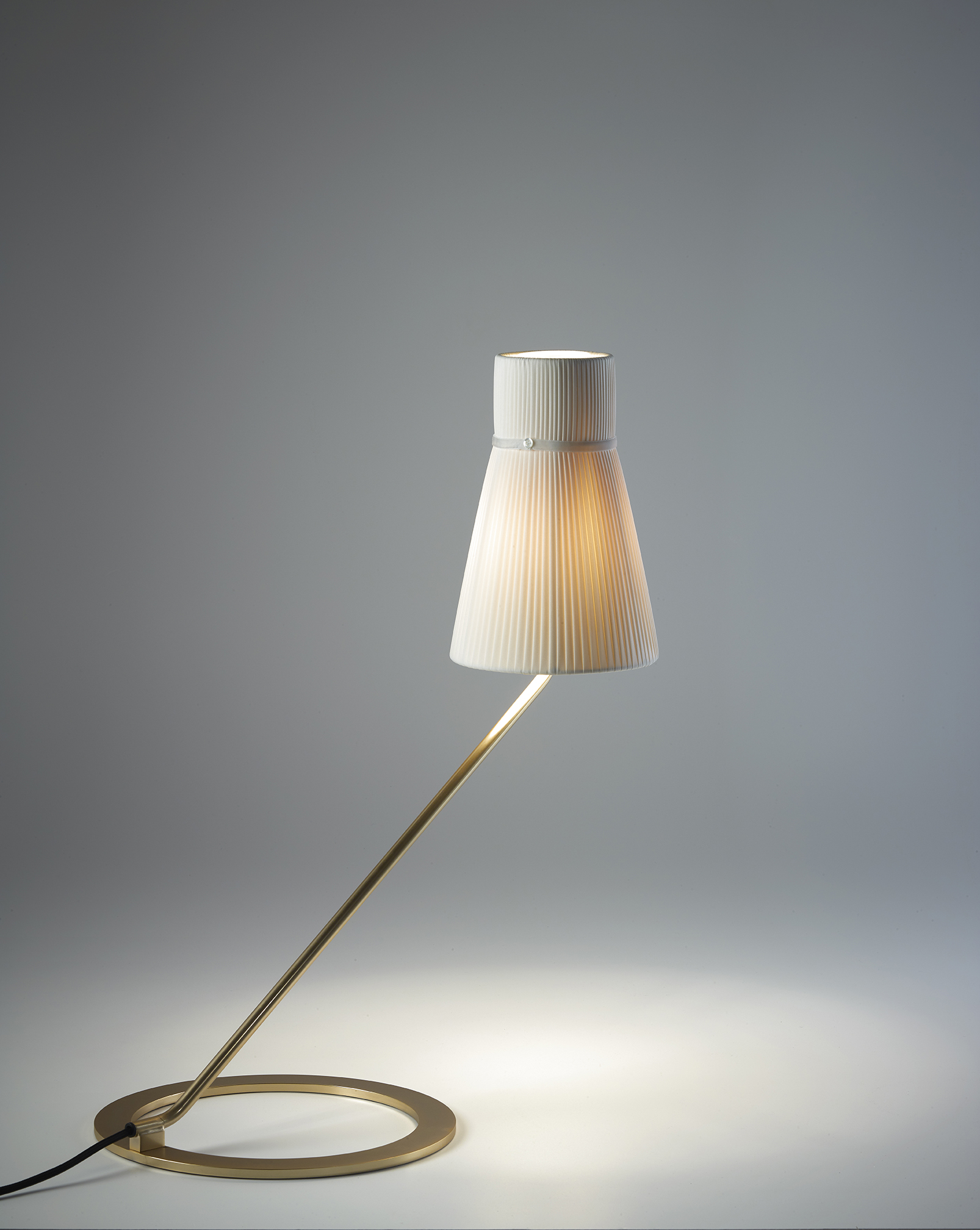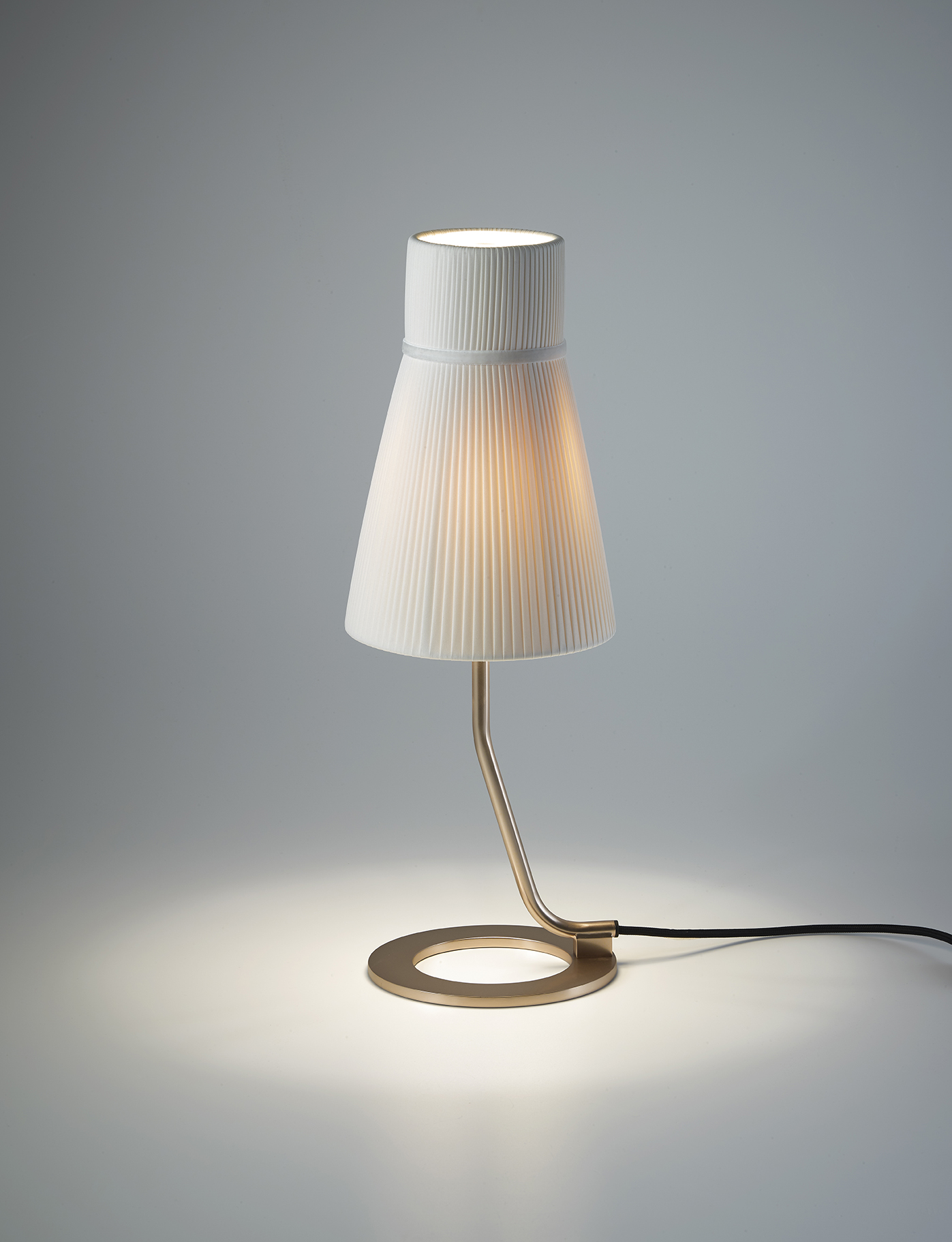 Audrey is a collection comprising bedside lamps, desk lamps, table lamps and floor standing fixtures. Their simple linear structure consists of a metal shaft resting on which is a lampshade in pleated fabric and white frosted glass whose original shape recalls that of a hat used by British actress Audrey Hepburn. The lampshade ribbon is in tone-on-tone velvet with a mother-of-pearl button.