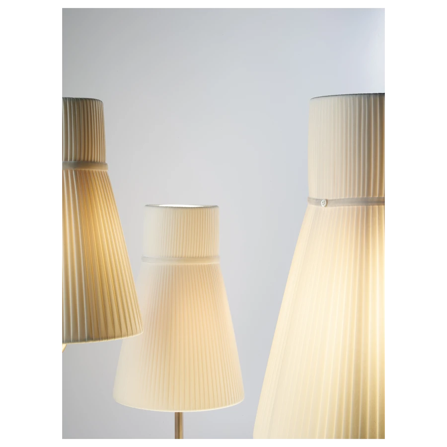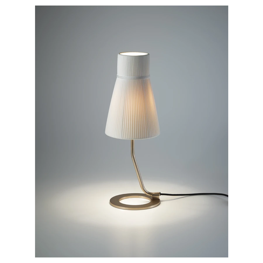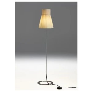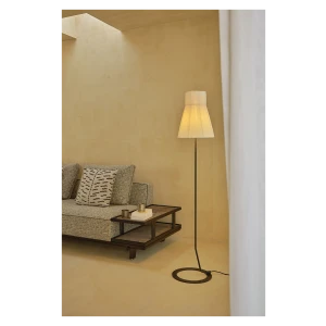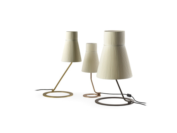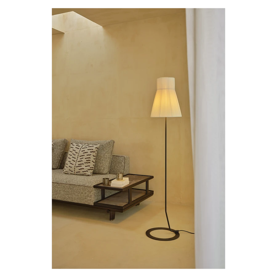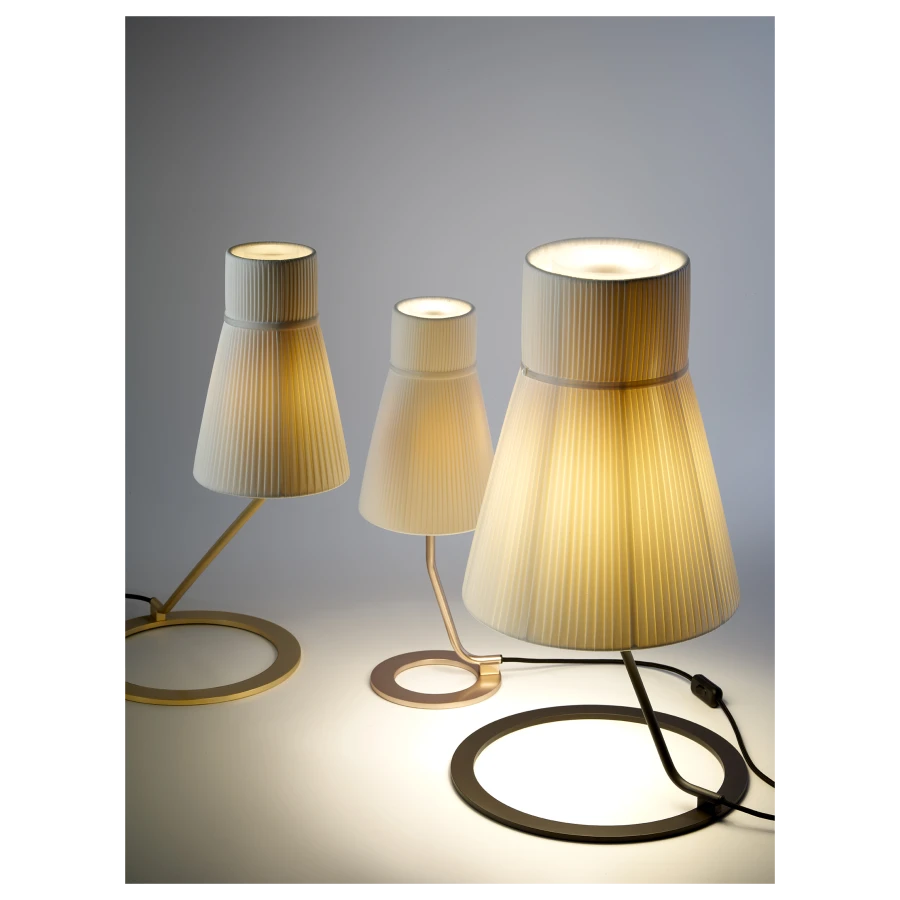 Audrey is a collection comprising bedside lamps, desk lamps, table lamps and floor standing fixtures. Their simple linear structure consists of a metal shaft resting on which is a lampshade in pleated fabric and white frosted glass whose original shape recalls that of a hat used by British actress Audrey Hepburn. The lampshade ribbon is in tone-on-tone velvet with a mother-of-pearl button.