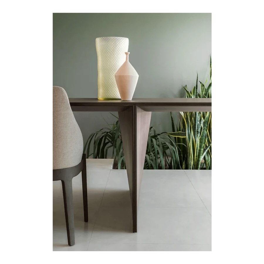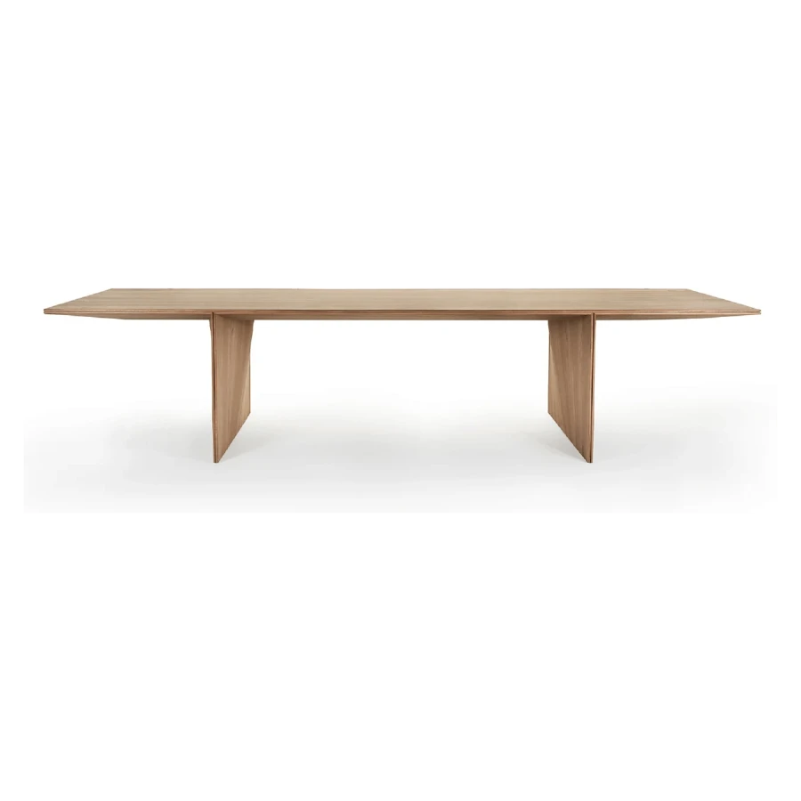 The geometry allows the end sections to cantilever up to one metre out on either side, while remaining stable and rigid. The entire table is made from timber, save the fixing elements, and the sculpted legs taper from a wider section at the top for support to a thin line towards the floor. The table is available in walnut and eucalyptus finishes and off-the-shelf versions come in three standard sizes – 2.9, 3.4 and 3.8 metres.