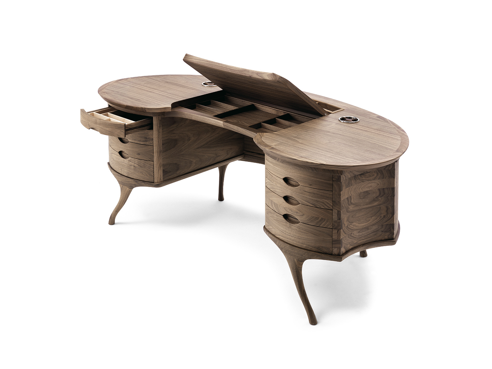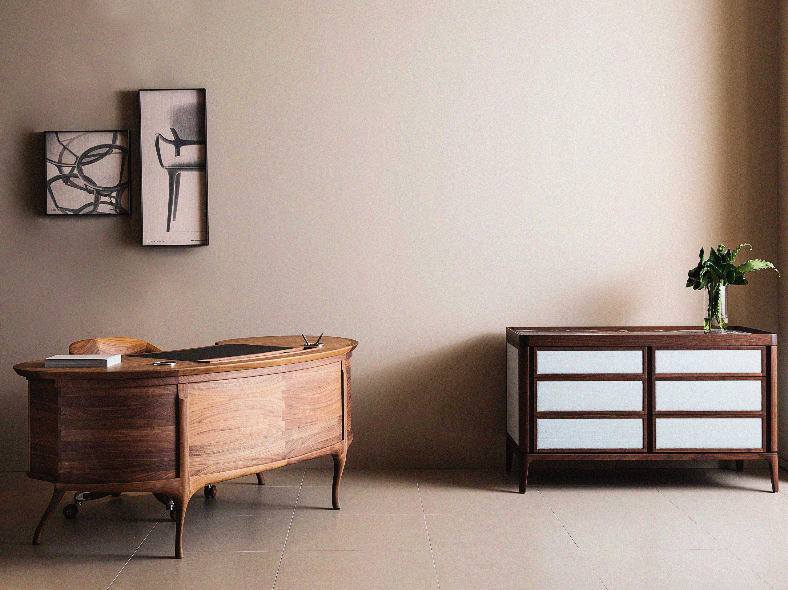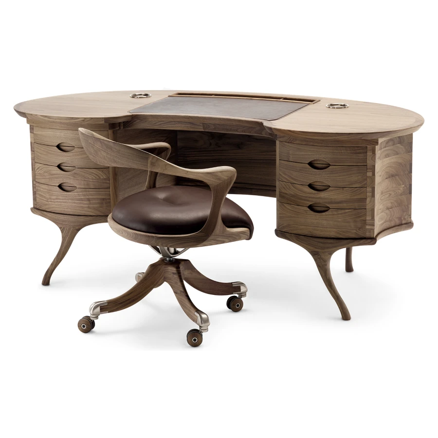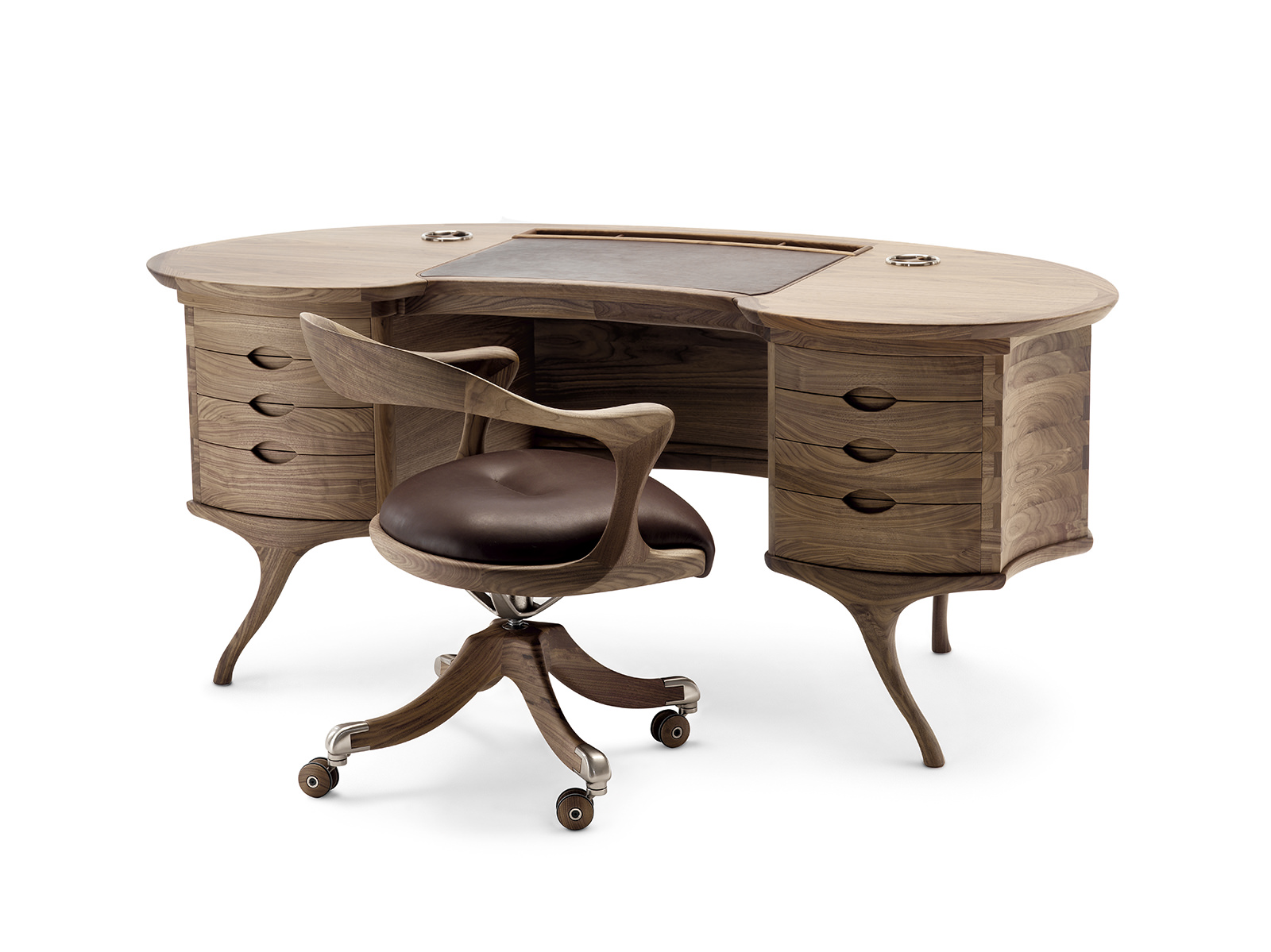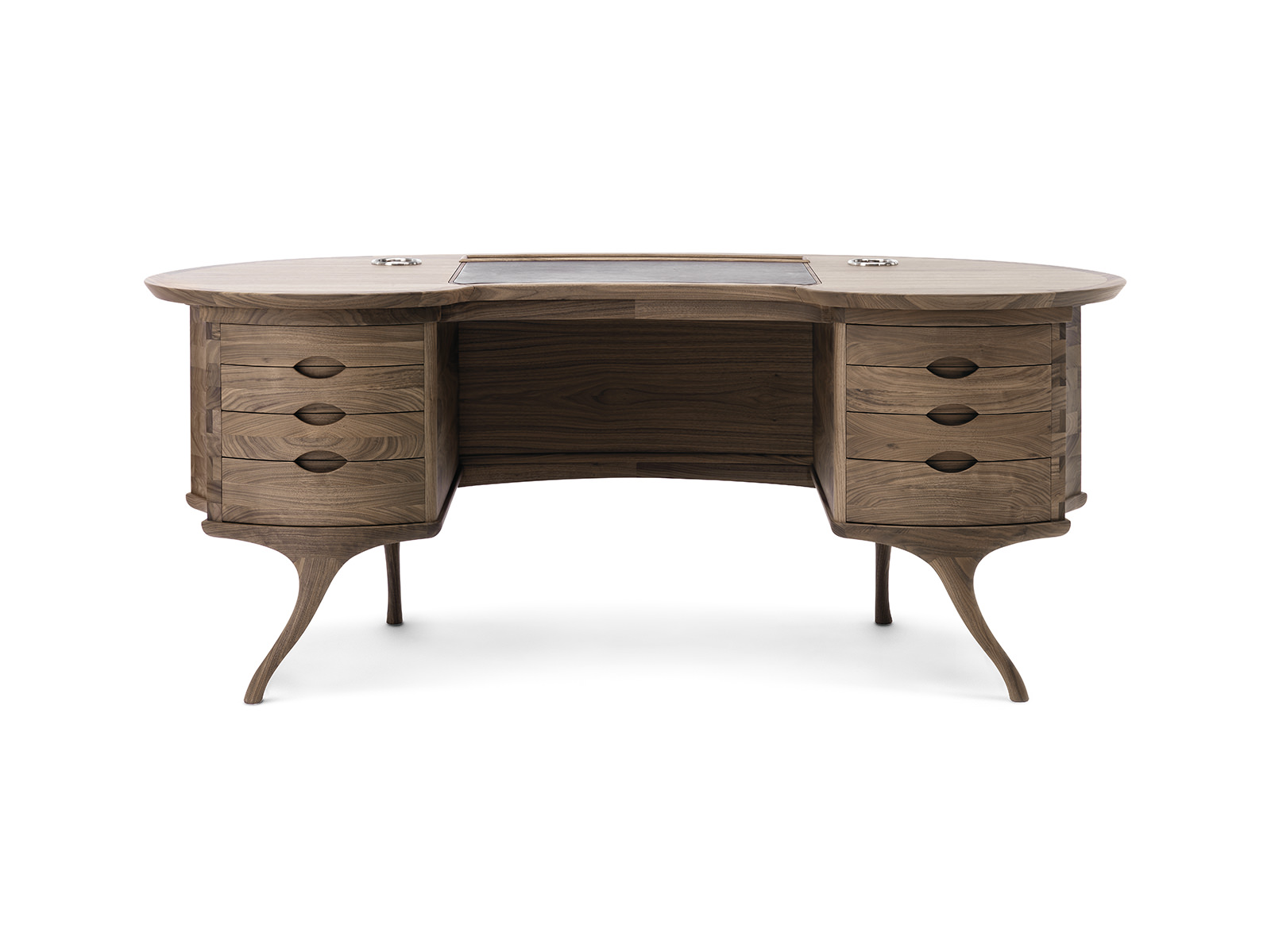 Just like Bean, which is created with solid American walnut. Every single phase is carried out with respect for woodworking traditions and with attention to the smallest details: it takes more than two weeks to assemble its 346 parts, which are glued together without screws. It then takes twelve hours for finishing and eight for painting, a process that surpasses some of the dynamics of mass production: to this day each piece is subject to visual and manual inspections to verify the accuracy of the joints, such as by passing millimetre-thick sheets between the drawers to check the tolerances. The large top, which can be opened, has a leather working pad and the interior is divided into sections. It is made of veneered multilayer poplar with a leaf thickness of 1mm: a distinctive feature that gives the product value and durability compared to the 5/10 or 6/10 mm veneers that are commonly used. It features a built-in storage compartment, with beam trays in brushed nickel brass placed on the side. The set is completed by the eight side drawers (4 each side), the first of which is organized with internal dividers in maple. Available in two sizes, Bean can be customized with a kit that includes internal drawers and dividers in maple wood, drawer bottoms in saddle-leather, and details with a burnished brass finish and custom nameplate. Pairing it with the Marlowe chair makes a classy combination.