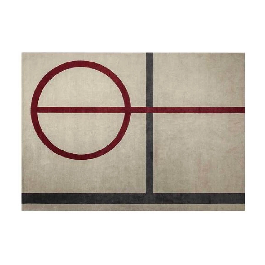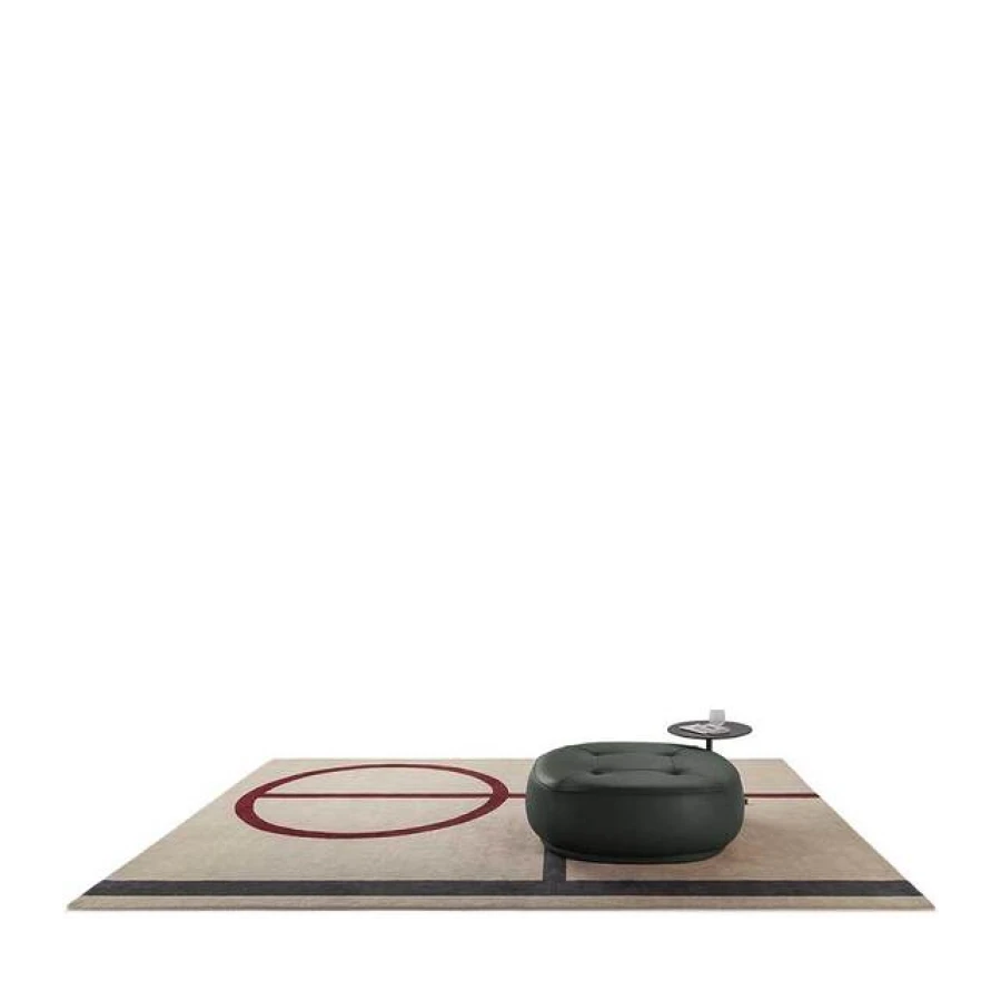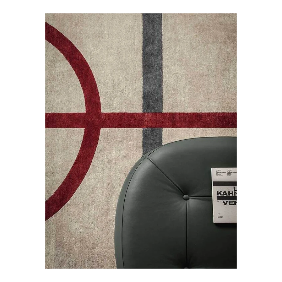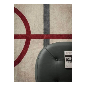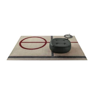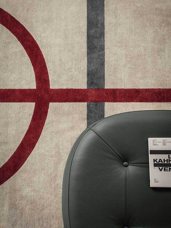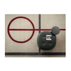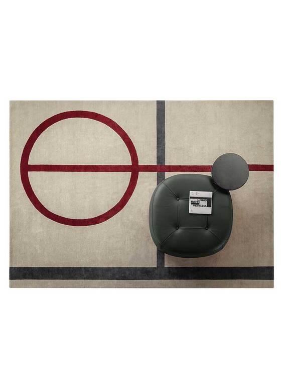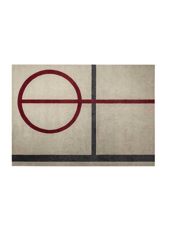 Billie has a rigorous, almost constructivist design that takes up most of the surface of the rug. The graphic is seemingly straightforward, consisting of a few elements highly calibrated in every single detail. Just two graphics on a neutral background: one an intense red, formed by a circle and a vertical line, and the other in anthracite coal grey and made up of two perpendicular lines. The result is a rug with strong formal balance and notable visual impact. In order to respect the original project and proportions, Billie is available in just one size, 250X350 cm, and one colour variant. It is refined with a hand-stitched woollen trim on all four sides.