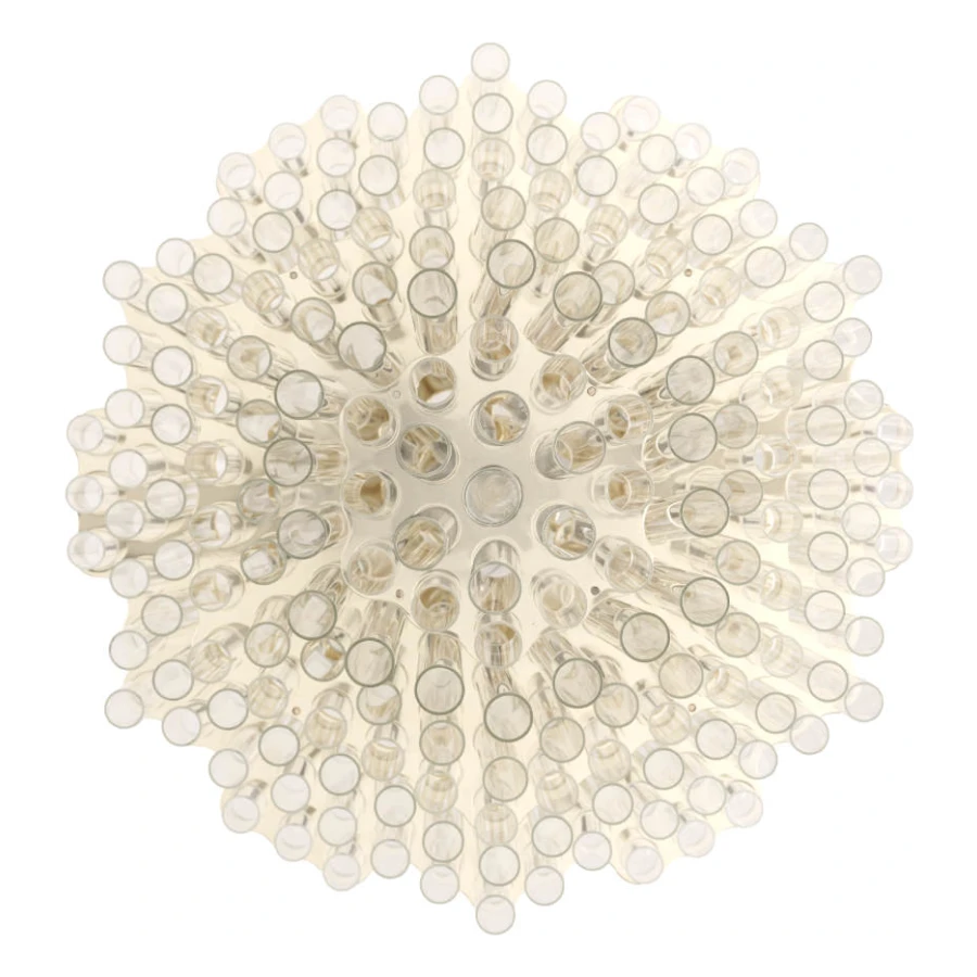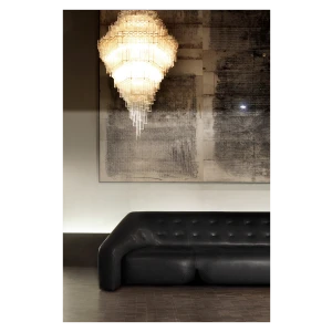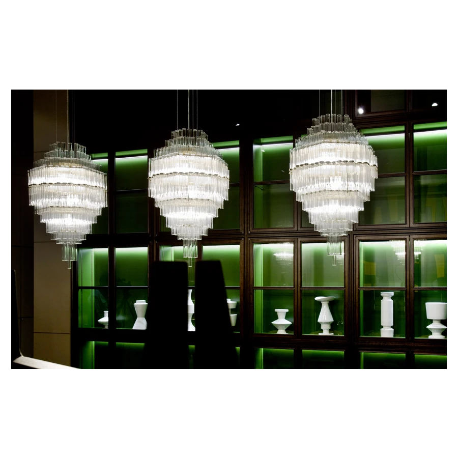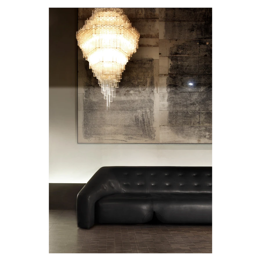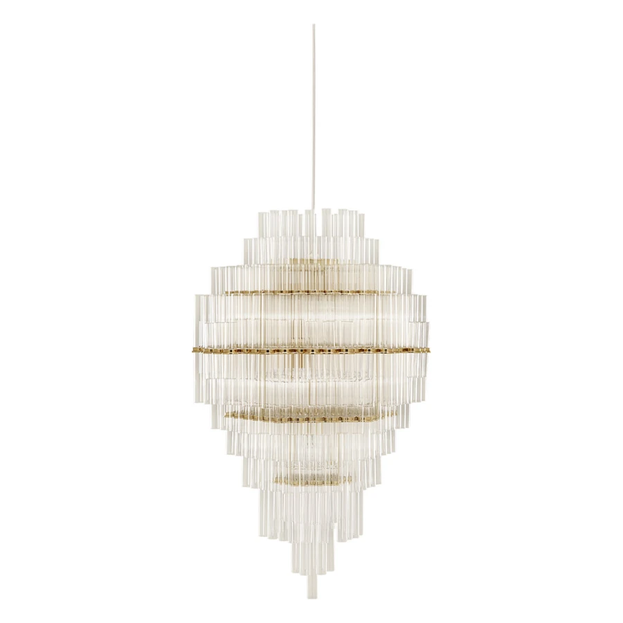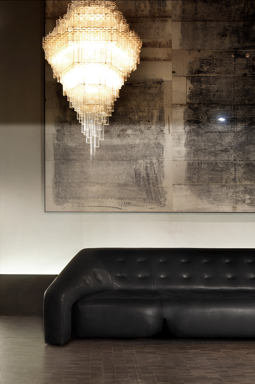 In collaboration with the DRIFT studio, Ceccotti Collezioni experiments with new manufacturing techniques, adopting an advanced production process. The aim is to create a design with strong architectural and emotional impact. Conceived in 2012, Blass is a striking pendant light. The structure, in polished brass, is quite complex. Five hundred Pyrex tubes (20 mm diameter) form a cascade. These are attached to a stainless steel frame which is laser cut and then brass plated. The result is an object that harmoniously lights up the room, encouraging you to look upwards.