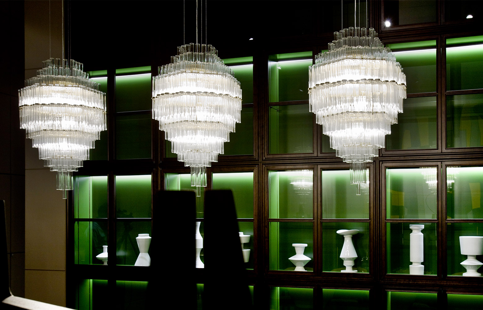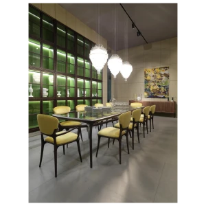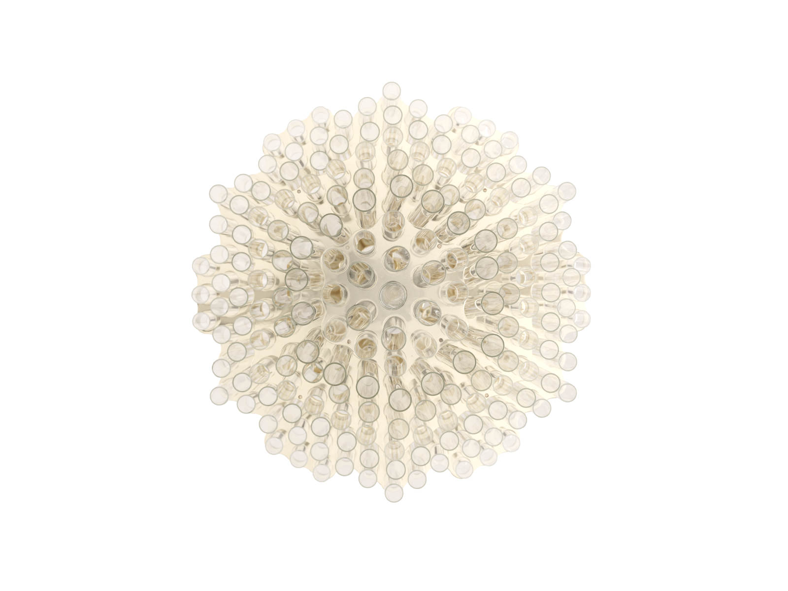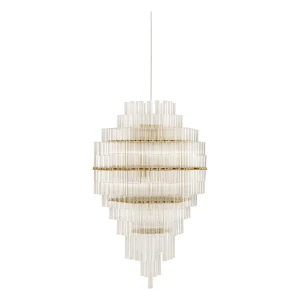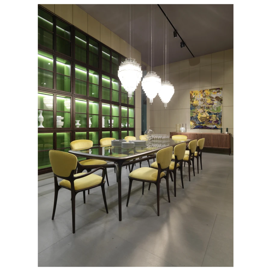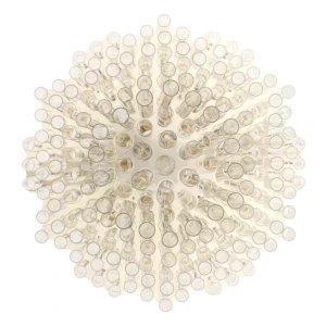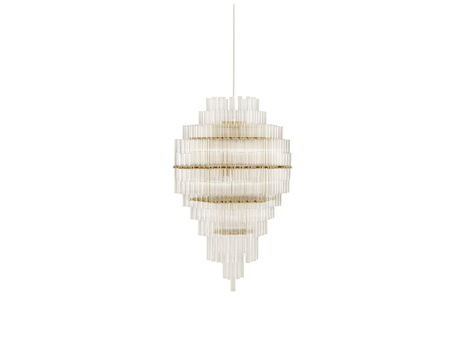 In collaboration with the DRIFT studio, Ceccotti Collezioni experiments with new manufacturing techniques, adopting an advanced production process. The aim is to create a design with strong architectural and emotional impact. Conceived in 2012, Blass is a striking pendant light. The structure, in polished brass, is quite complex. Five hundred Pyrex tubes (20 mm diameter) form a cascade. These are attached to a stainless steel frame which is laser cut and then brass plated. The result is an object that harmoniously lights up the room, encouraging you to look upwards.