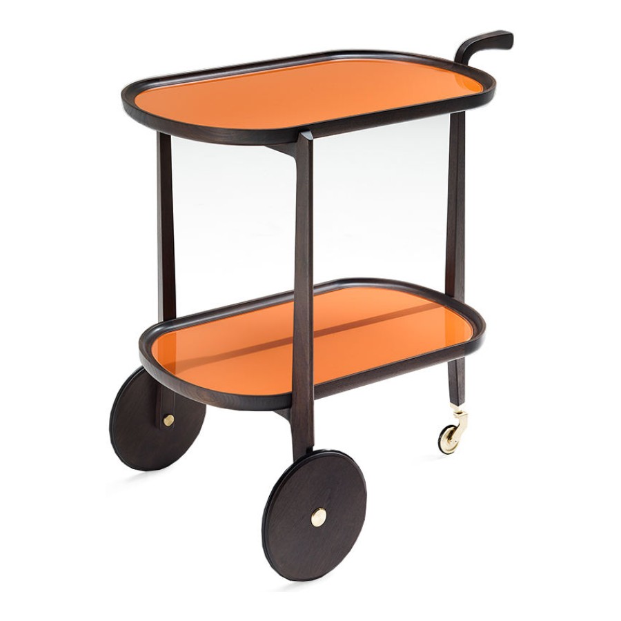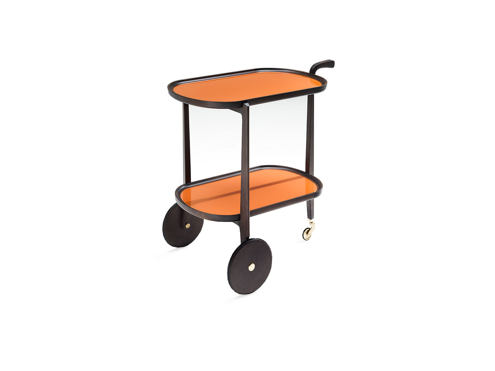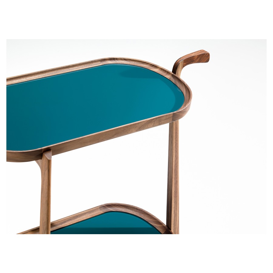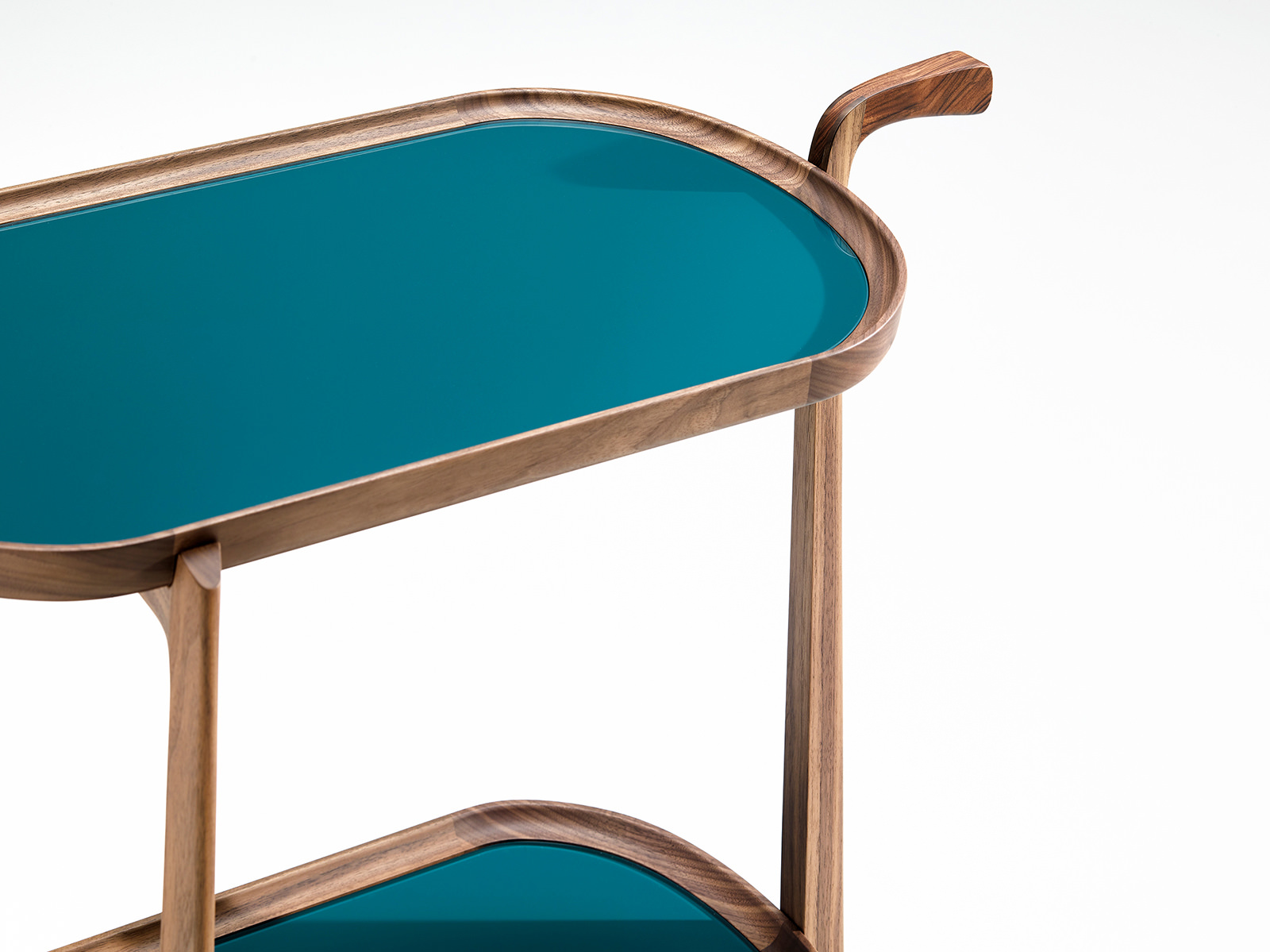 The frame consists of three sleek American walnut uprights which terminate with three castors. The front two castors are in wood and large in diameter while the back castor is in brass and smaller in size. Bloody Mary has two surfaces, the upper one removable like a tray. The surfaces are made of wood or with the inner part in coloured glass. In the latter version, the customer chooses the colour palette directly from the various original shades available. Versatile, the trolley is suitable for both domestic environments and refined contract settings. The wooden handle makes it easy to move, as well as embellishing its aesthetic appearance. Synonymous with conviviality and enjoyment, Bloody Mary is guaranteed to get people talking.