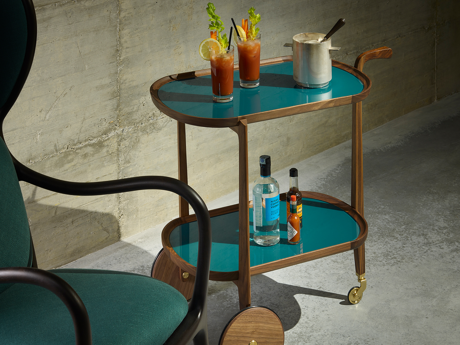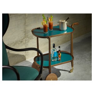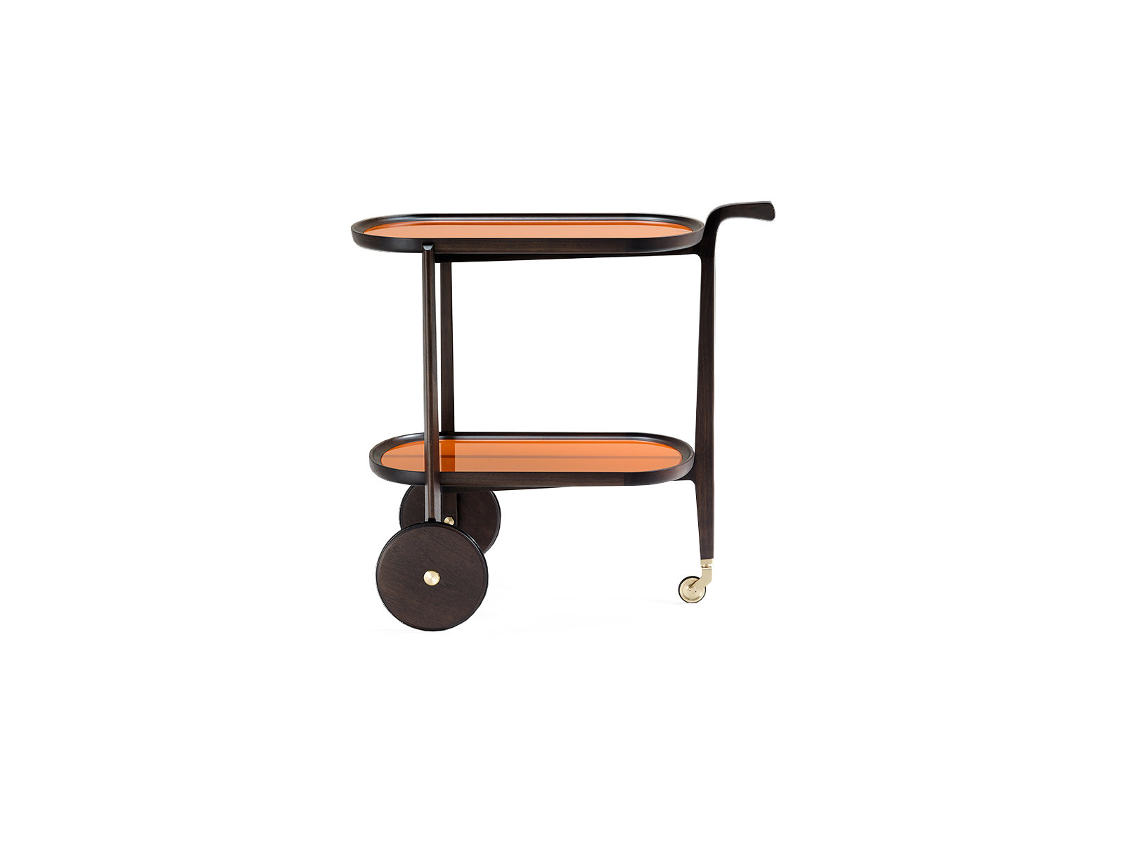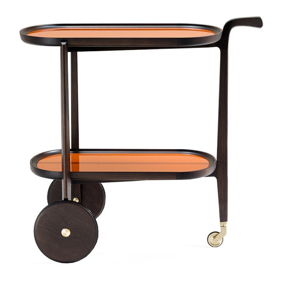 The frame consists of three sleek American walnut uprights which terminate with three castors. The front two castors are in wood and large in diameter while the back castor is in brass and smaller in size. Bloody Mary has two surfaces, the upper one removable like a tray. The surfaces are made of wood or with the inner part in coloured glass. In the latter version, the customer chooses the colour palette directly from the various original shades available. Versatile, the trolley is suitable for both domestic environments and refined contract settings. The wooden handle makes it easy to move, as well as embellishing its aesthetic appearance. Synonymous with conviviality and enjoyment, Bloody Mary is guaranteed to get people talking.