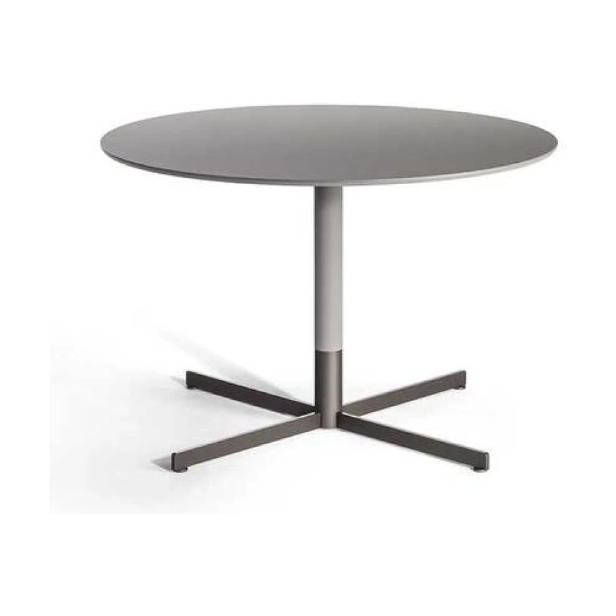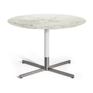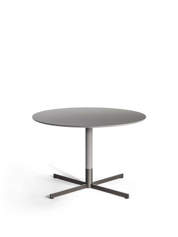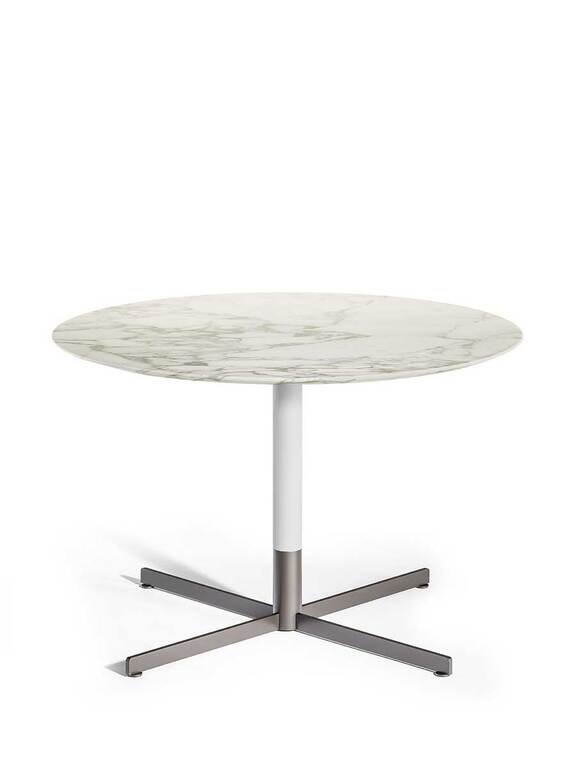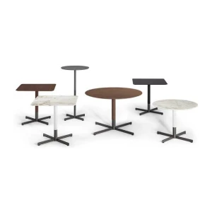 The six Bob Bistrot side tables can have a round table top, in various diameters, or a square table top. The tops are available in Fenix NTM® in the colours Grigio Londra or Nero Ingo, in birch plywood with Canaletto Walnut veneer, or in Calacatta gold marble (with a glossy finish to which a transparent polyester paint is applied to increase its surface resistance, or a semi-glossy finish for a natural result). The Bob Bistrot side tables have a cross-shaped base in burnished brushed steel and available in different heights. The top part of the leg has a steel structure equipped with a steel collar which can be veneered in Canaletto walnut or painted white, grey or black.