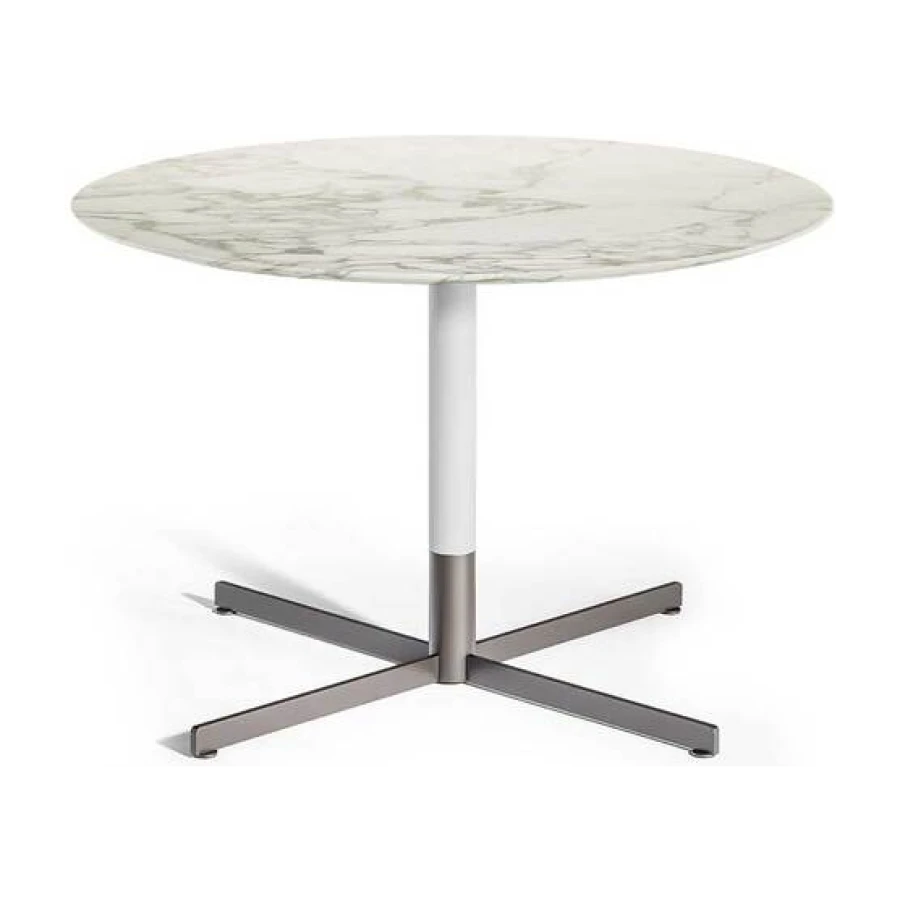 Top: Calacatta gold marble, Collar: painted white, Base: burnished brushed steel