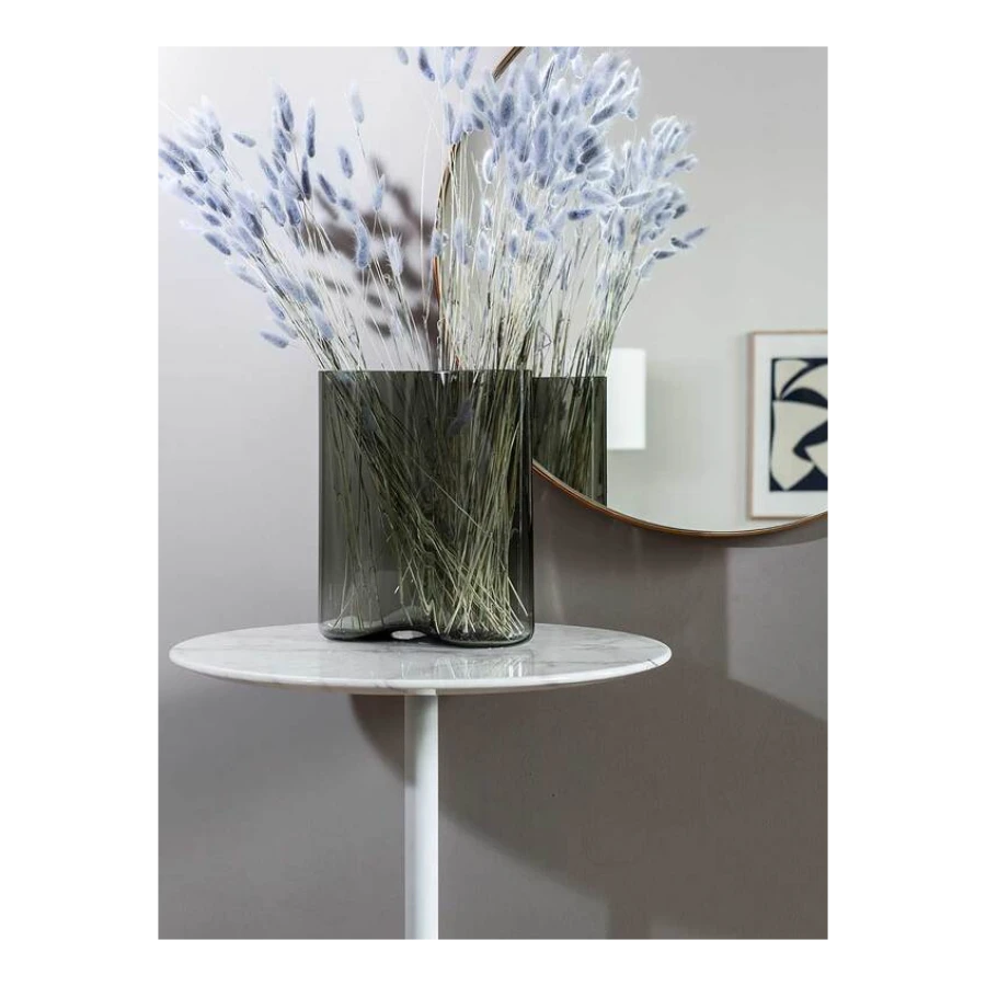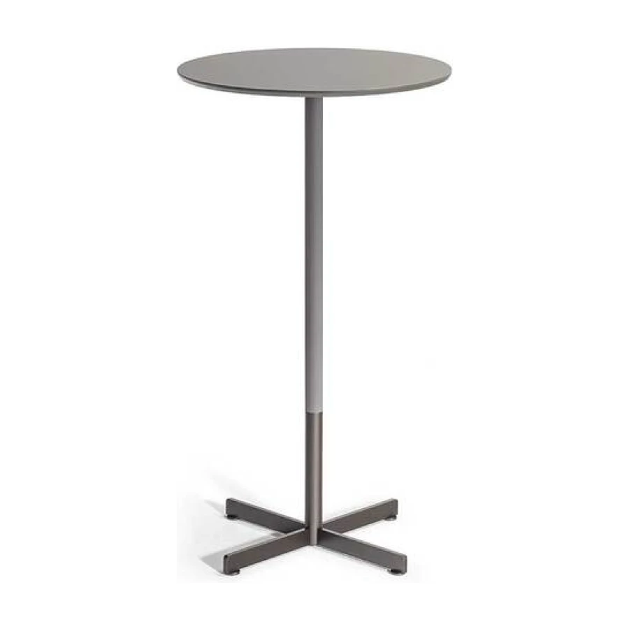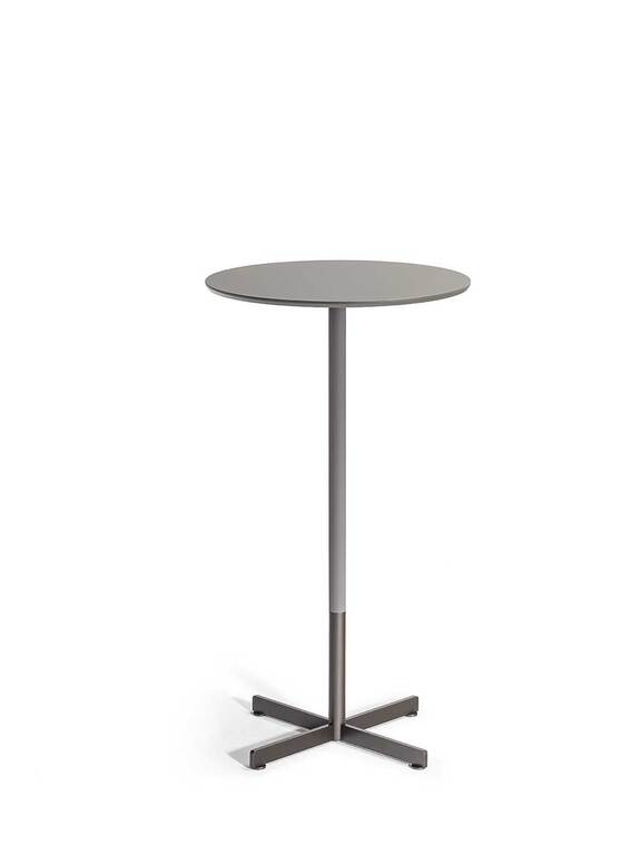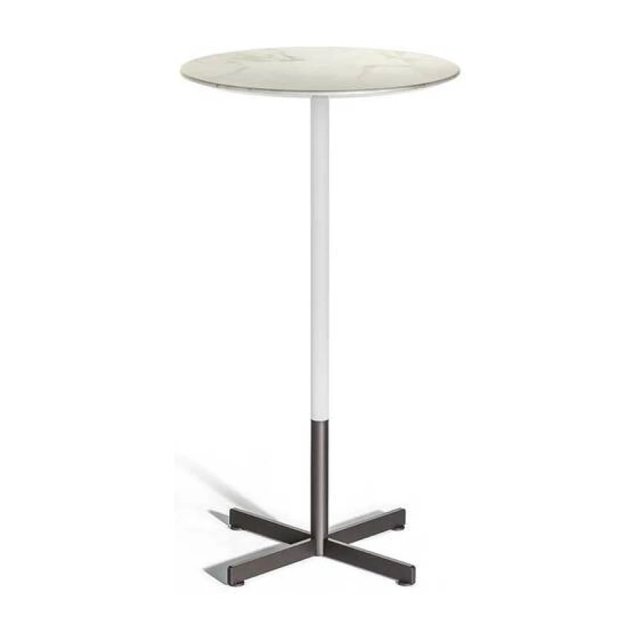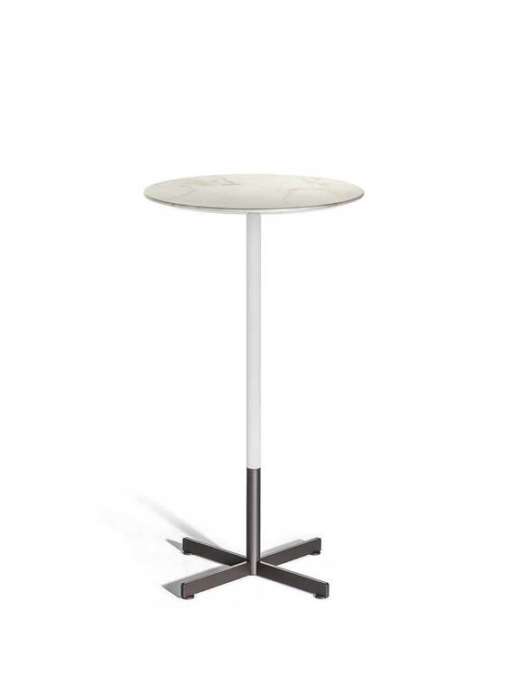 The six Bob Bistrot side tables can have a round table top, in various diameters, or a square table top. The tops are available in Fenix NTM® in the colours Grigio Londra or Nero Ingo, in birch plywood with Canaletto Walnut veneer, or in Calacatta gold marble (with a glossy finish to which a transparent polyester paint is applied to increase its surface resistance, or a semi-glossy finish for a natural result). The Bob Bistrot side tables have a cross-shaped base in burnished brushed steel and available in different heights. The top part of the leg has a steel structure equipped with a steel collar which can be veneered in Canaletto walnut or painted white, grey or black.