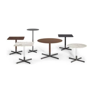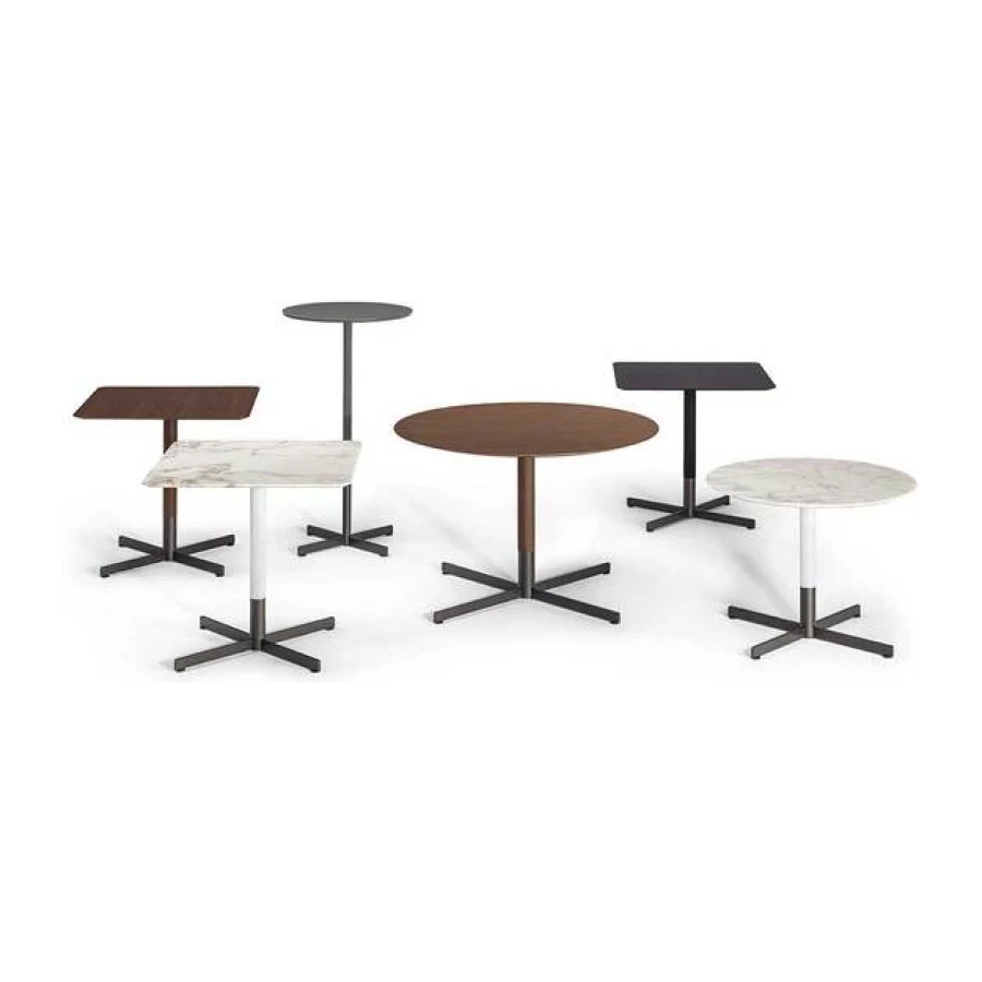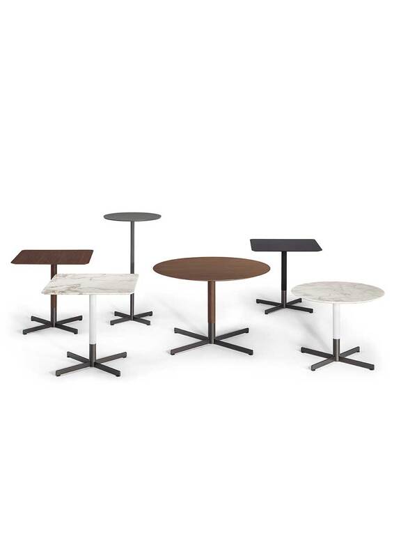 The six Bob Bistrot side tables can have a round table top, in various diameters, or a square table top. The tops are available in Fenix NTM® in the colours Grigio Londra or Nero Ingo, in birch plywood with Canaletto Walnut veneer, or in Calacatta gold marble (with a glossy finish to which a transparent polyester paint is applied to increase its surface resistance, or a semi-glossy finish for a natural result). The Bob Bistrot side tables have a cross-shaped base in burnished brushed steel and available in different heights. The top part of the leg has a steel structure equipped with a steel collar which can be veneered in Canaletto walnut or painted white, grey or black.