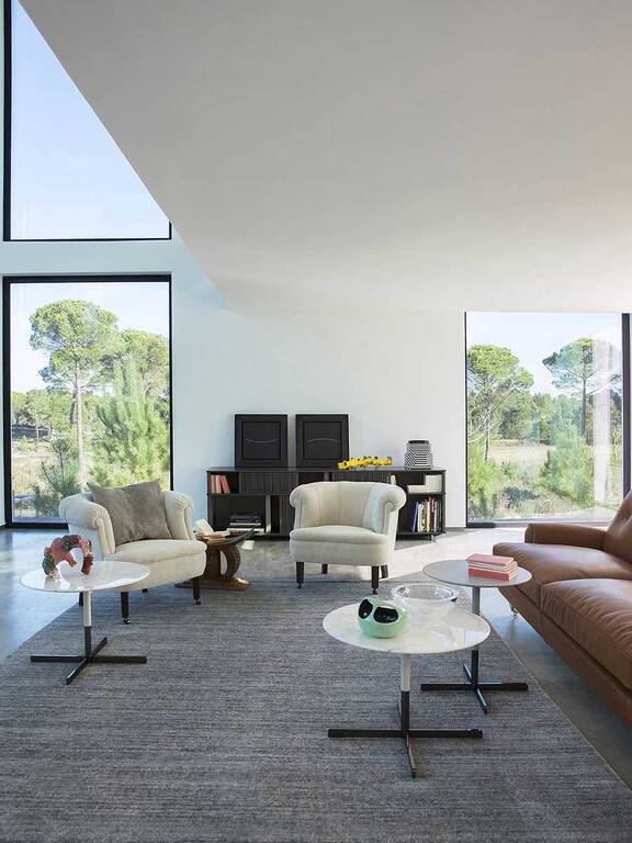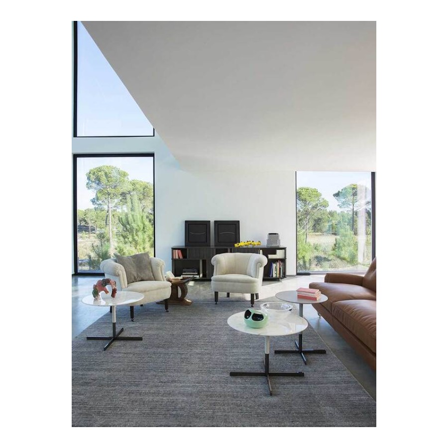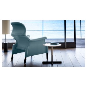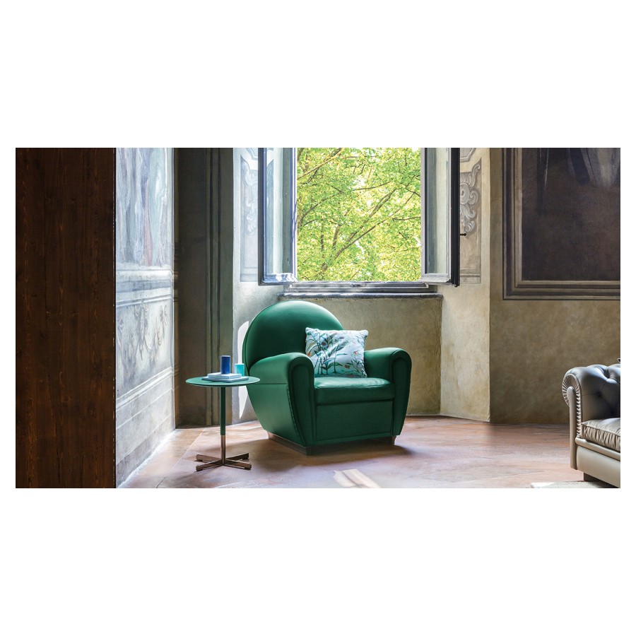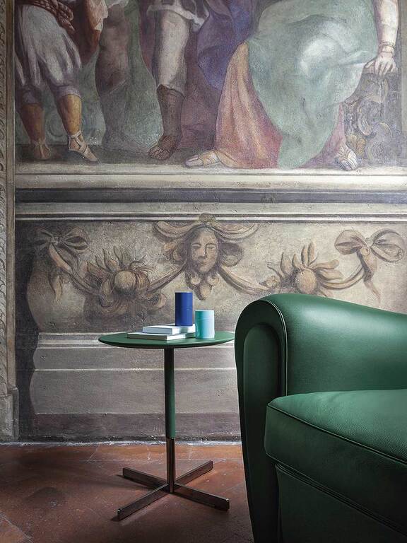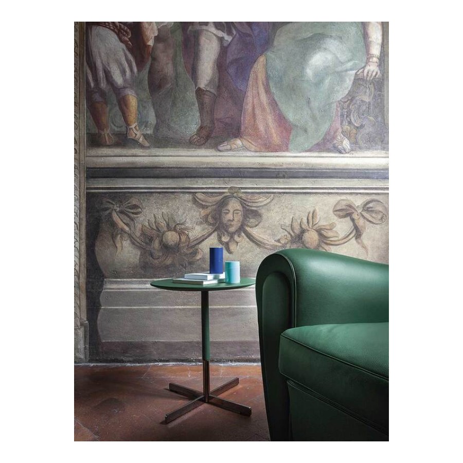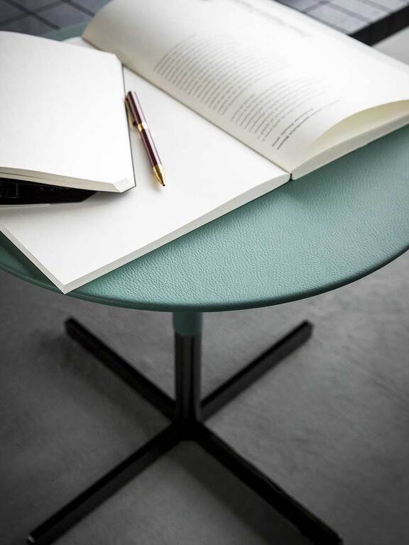 The Bob side tables have a steel base that is available in the gunmetal grey, ruthenium, brushed burnished and Canaletto walnut finishes (that latter is only available in the versions with top in leather or marble). The top is available in Pelle Frau® leather, birch plywood with Canaletto walnut veneer, Emperador marble or Calacatta gold marble (polished or semi-polished) (except for the ø 110 model). The upper part of leg always matches the finish of the table top. In the variants with marble top the upper part of the leg is upholstered in matching coloured leather.