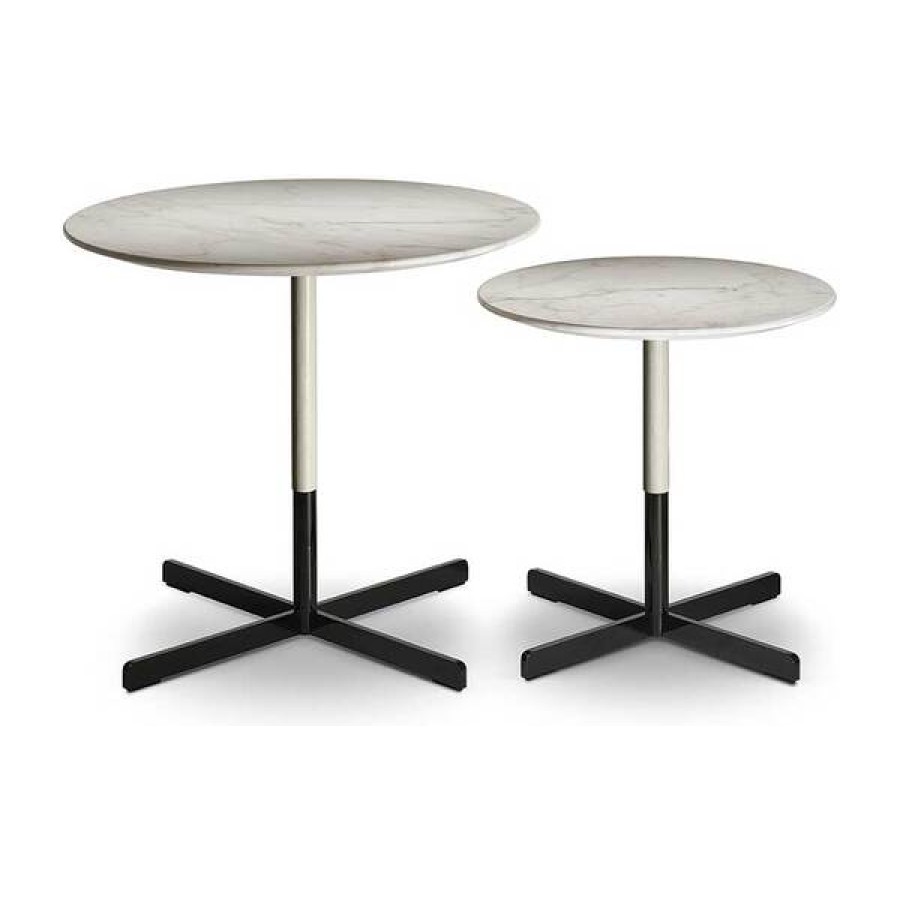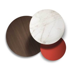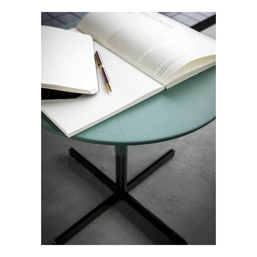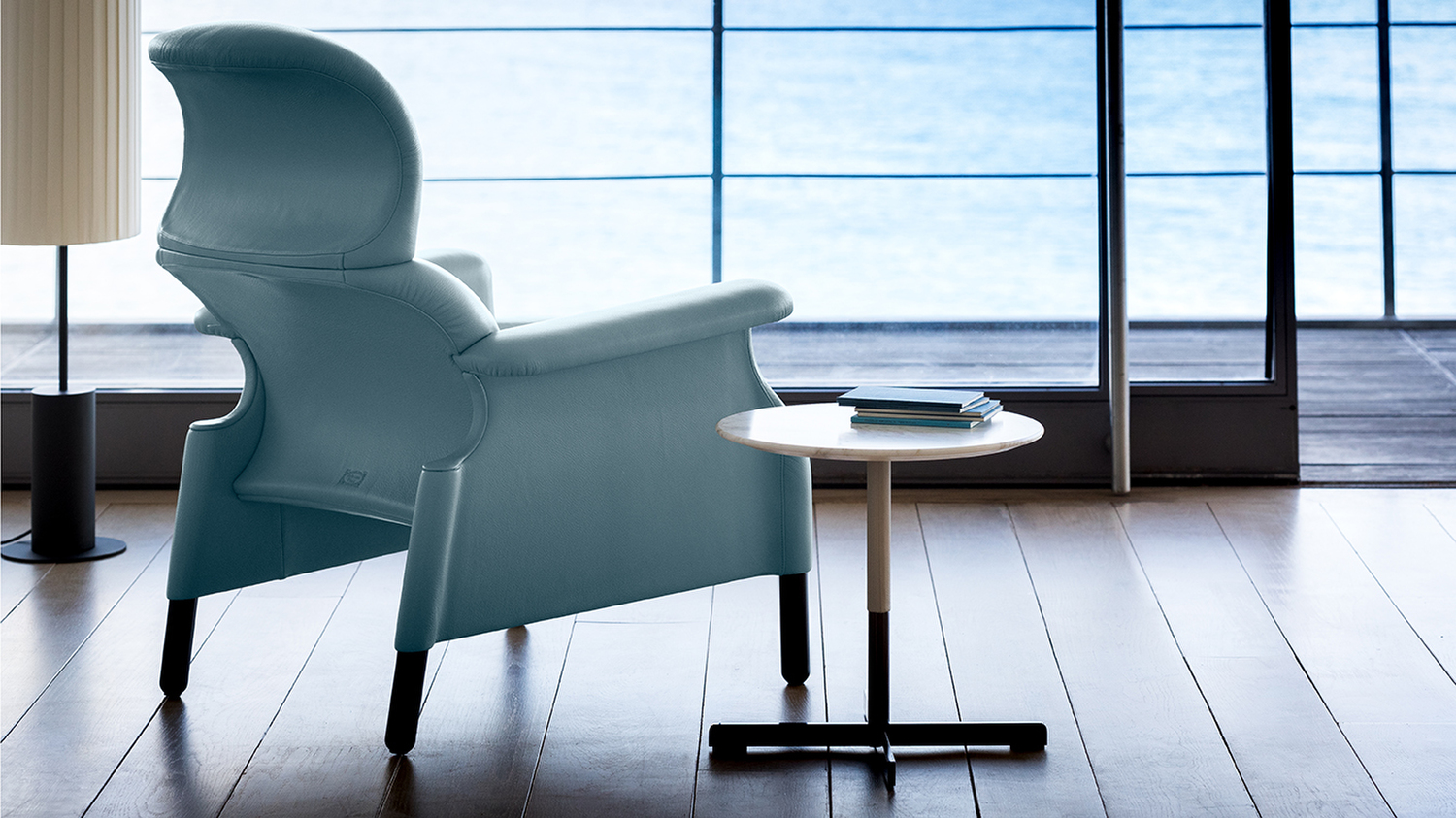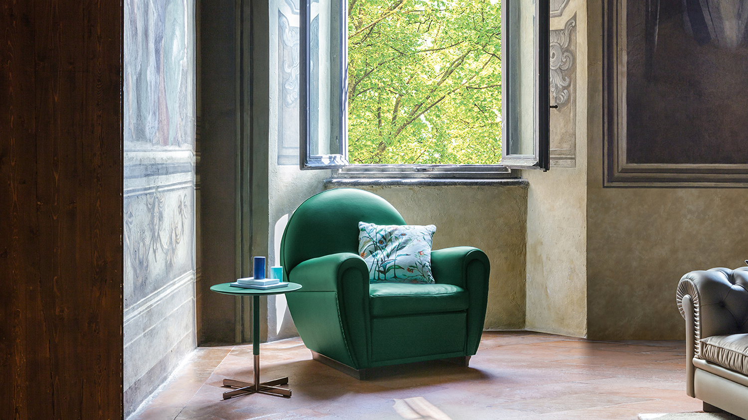 The Bob side tables have a steel base that is available in the gunmetal grey, ruthenium, brushed burnished and Canaletto walnut finishes (that latter is only available in the versions with top in leather or marble). The top is available in Pelle Frau® leather, birch plywood with Canaletto walnut veneer, Emperador marble or Calacatta gold marble (polished or semi-polished) (except for the ø 110 model). The upper part of leg always matches the finish of the table top. In the variants with marble top the upper part of the leg is upholstered in matching coloured leather.