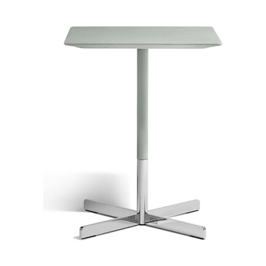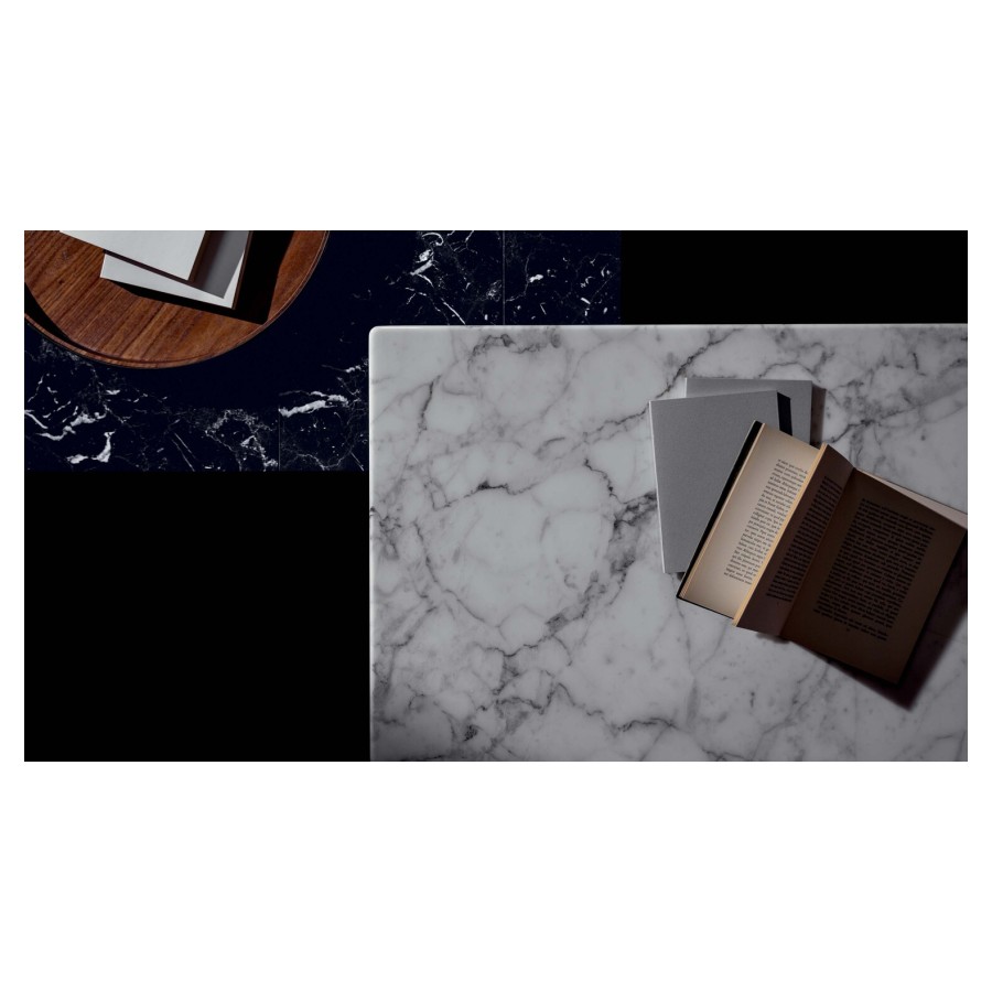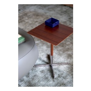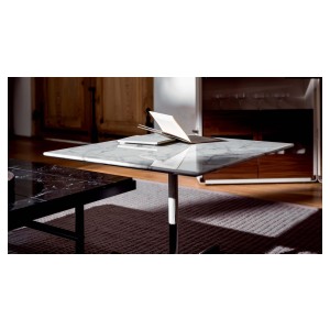 The BOB coffee table with square top is available in different sizes. The tabletop is finished with Canaletto walnut, Pelle Frau® leather, polished or semi-gloss marble with beveled edges. The upper part of the leg of the BOB coffee table is made of steel, on which is applied a collar insert that matches the top finish. The marble-top coffee table instead has its upper leg part upholstered in leather in a matching color. The leg base is made of steel, available in a range of finishes.