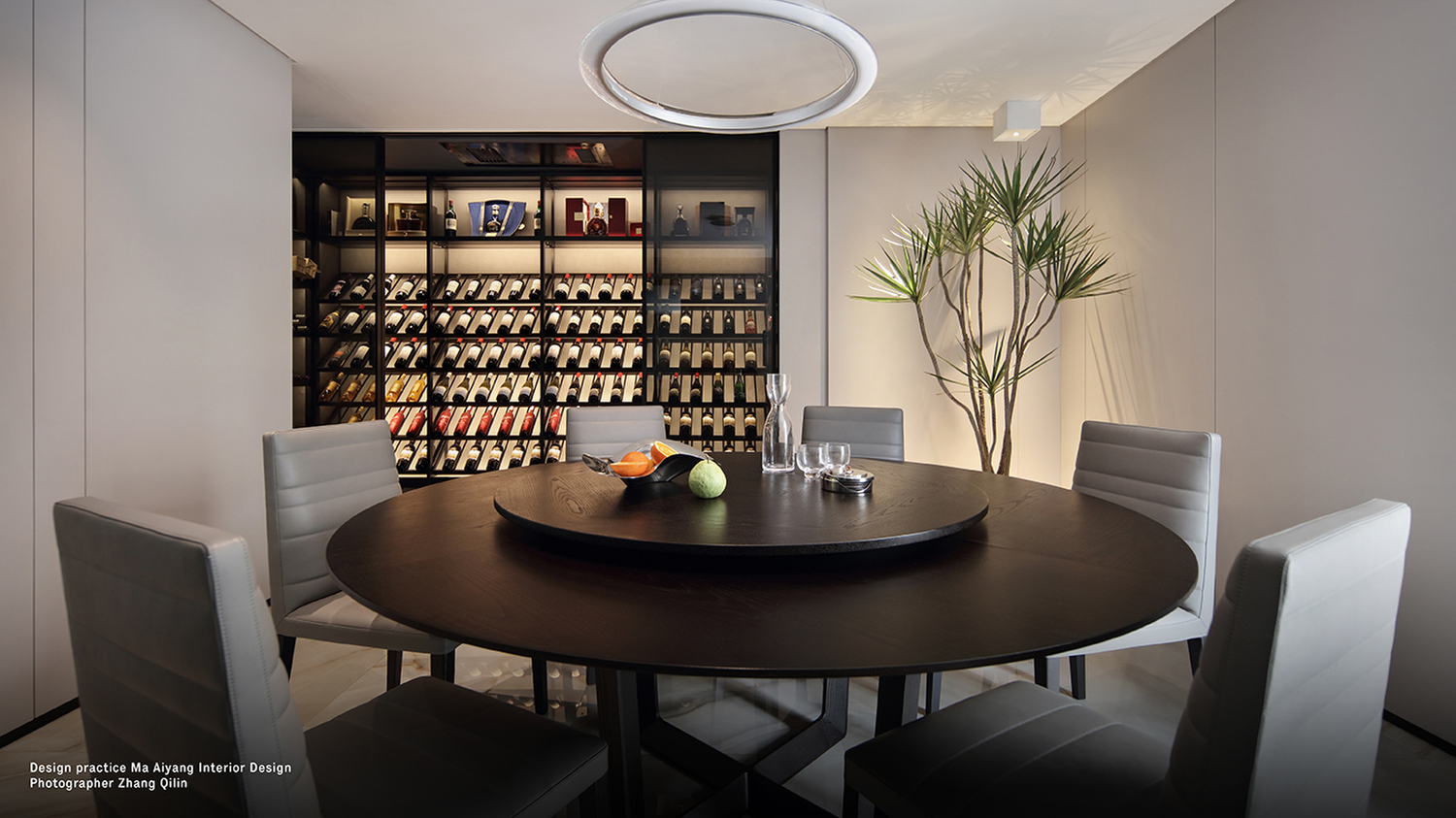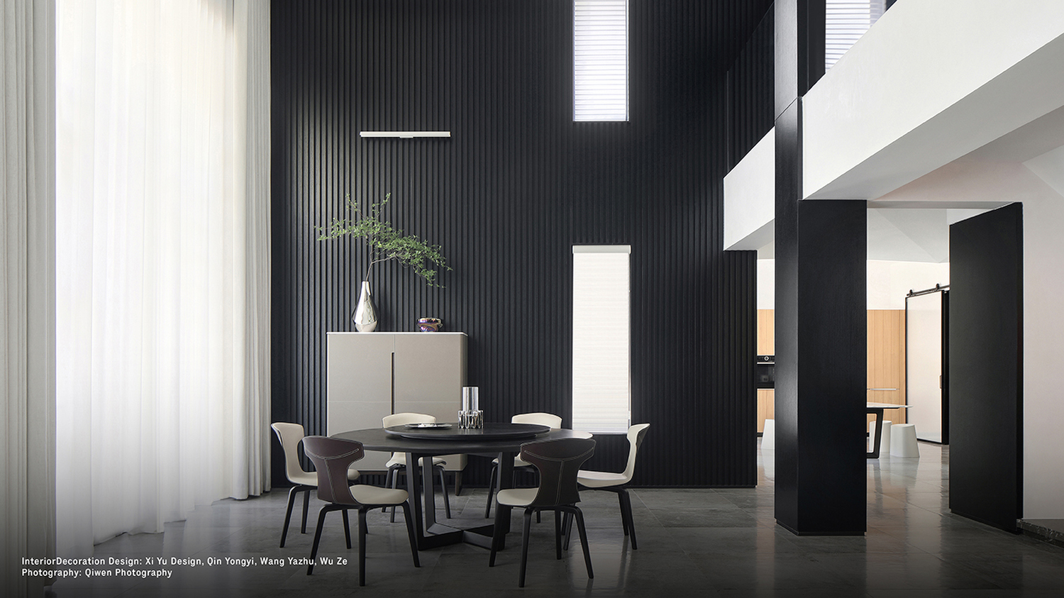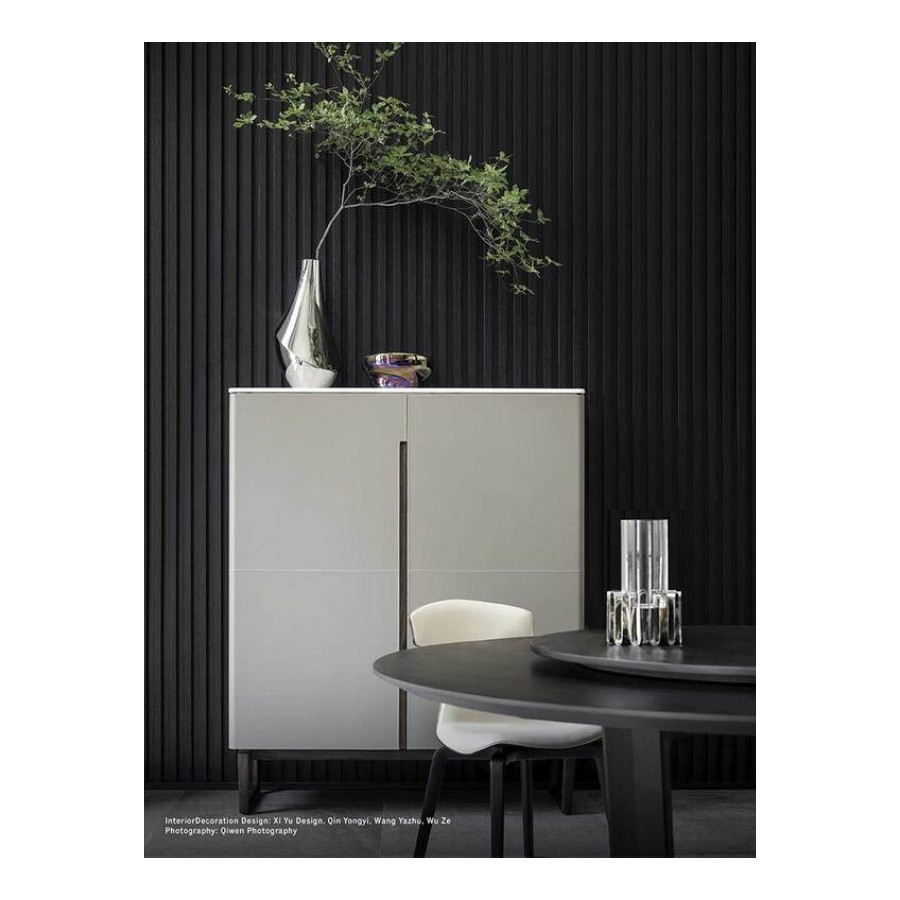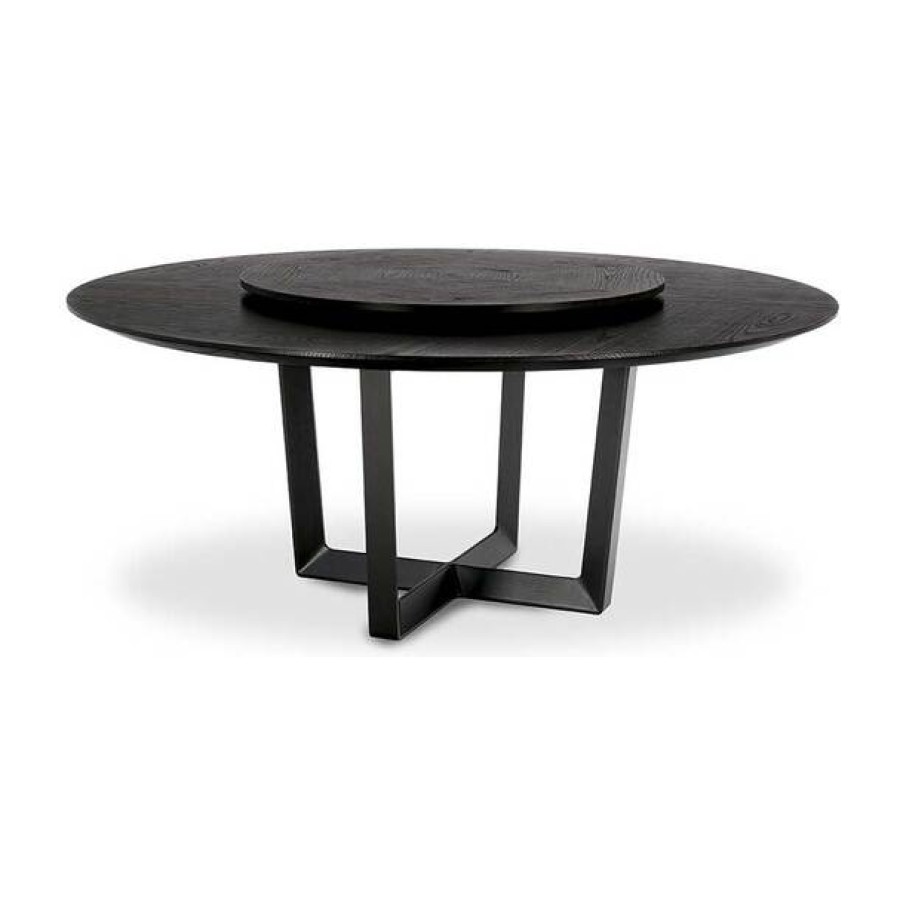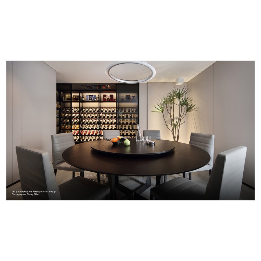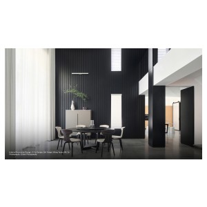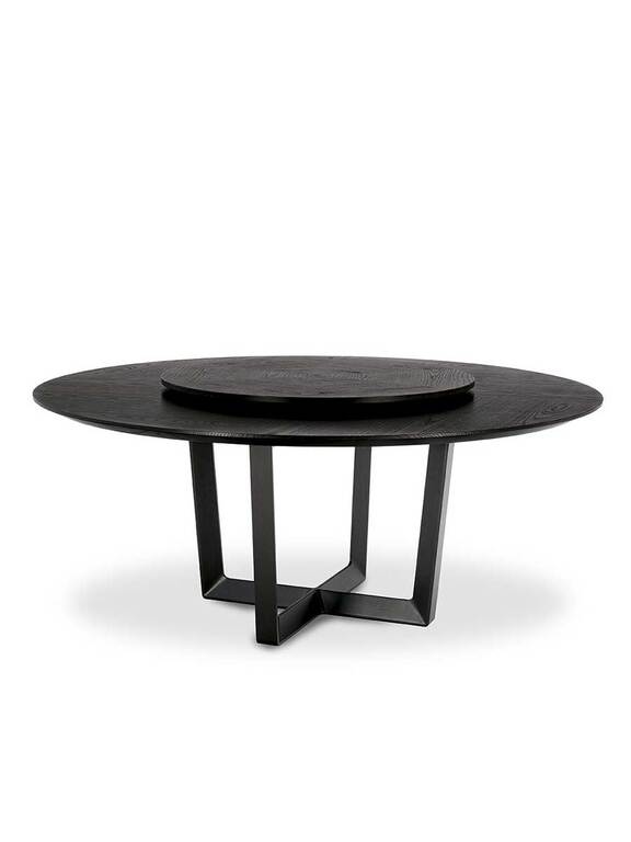 The supporting structure of the Bolero tables is made from solid wood with triangular cross-section. The wood can be ash, with wenge or moka stain, or Canaletto walnut. The top is available in wood or marble. The wood version comes with veneer in wenge- or moka-stained cut ash wood or Canaletto walnut with its distinctive inlay consisting of a criss-cross grain pattern, always matching the legs. The edges are decorated with a solid wood trim. The 220×110 cm and 250×100 cm versions of the Bolero tables and the round version with 150 cm diameter are also available with the top in Calacatta gold marble or Emperador marble, with bevelled edge and semi-polished or polished polyester finish. The 180 cm diameter round version is also available with a Lazy Susan which, resting on the table top rather than fixed to it, is composed of two round flat surfaces of different diameters.