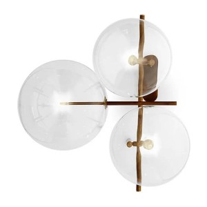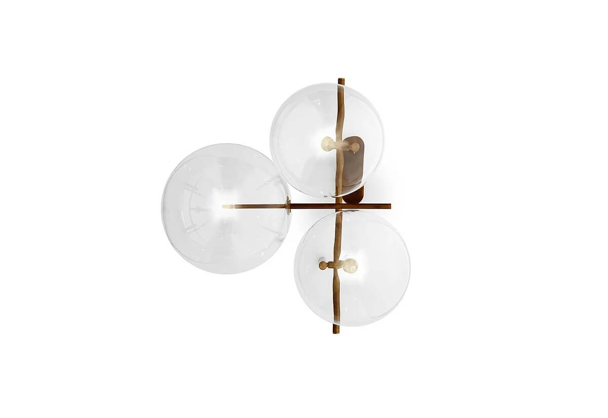 Wall or ceiling fitted lamp with hand burnished brass structure, available with 3 transparent mouth-blown glass spheres. Supplied with light bulbs (LED).