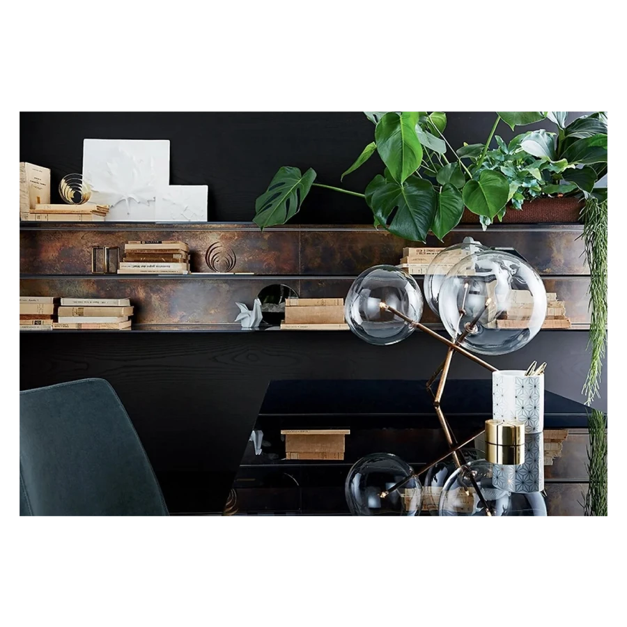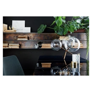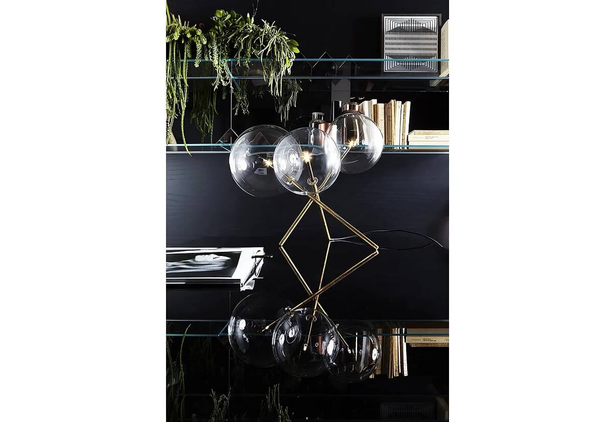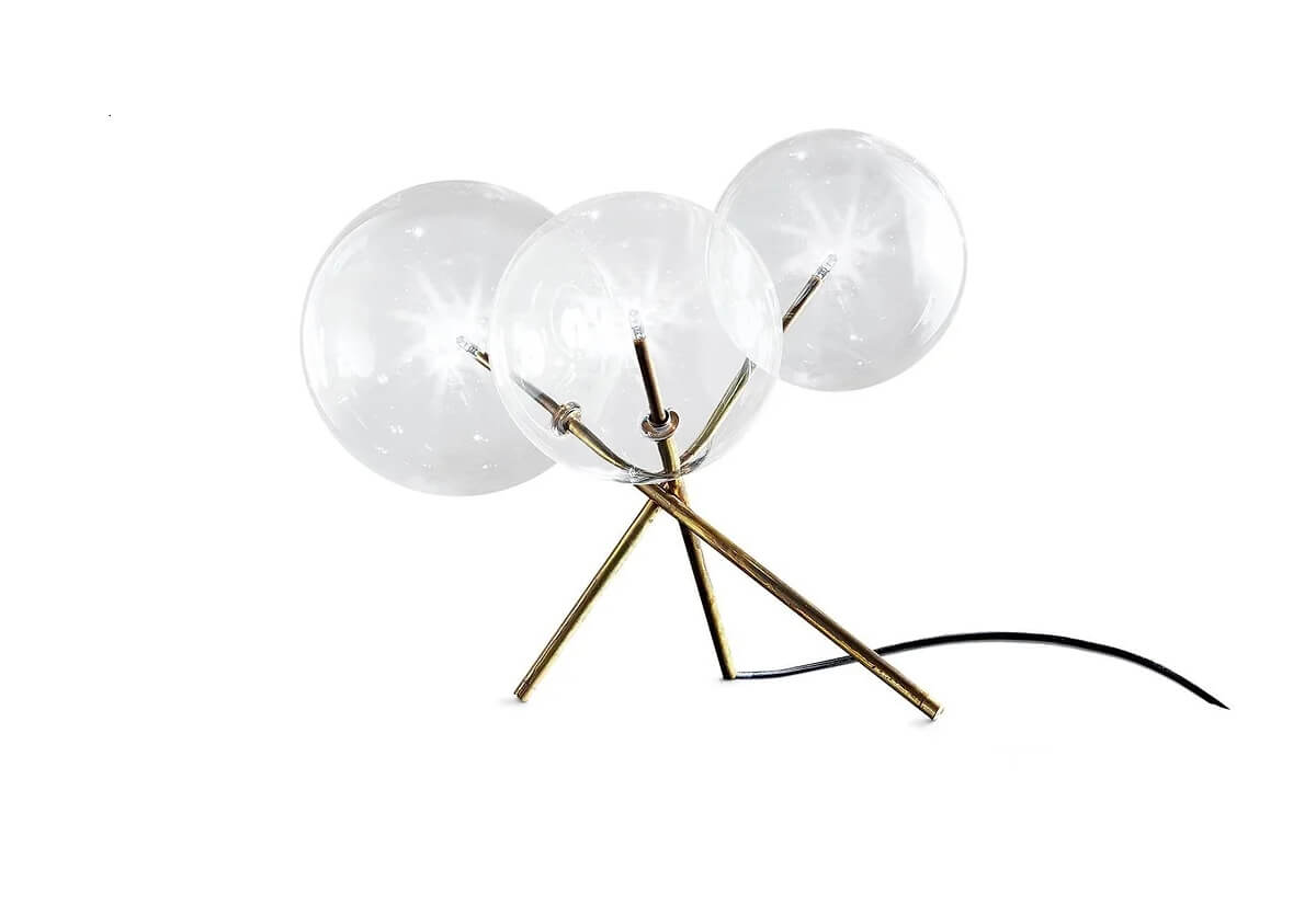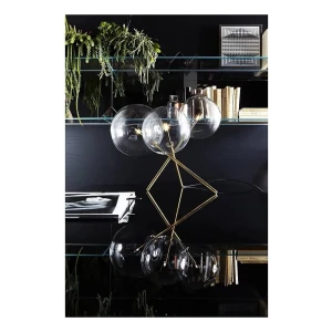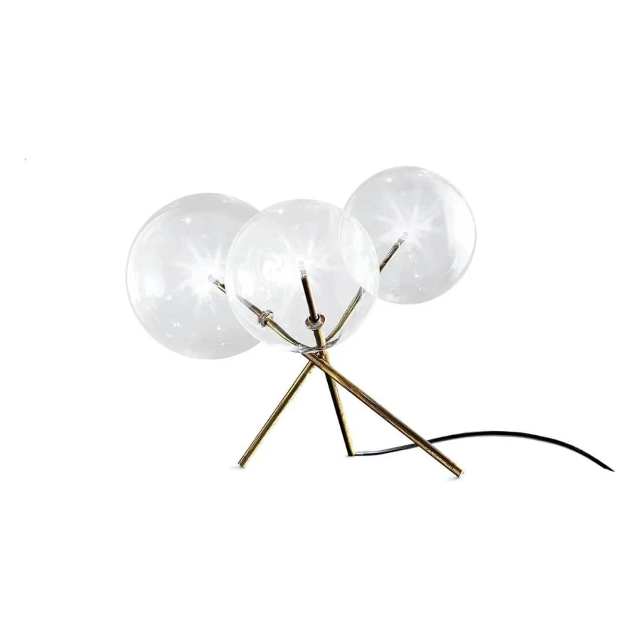 Table lamp with dimmable LED light. Transparent blown glass spheres. Metal parts in hand burnished brass. The hand burnished brass finish looks naturally spotted and irregular. Due to this craftmade processing, each product is unique and exclusive. Supplied with light bulbs (LED).