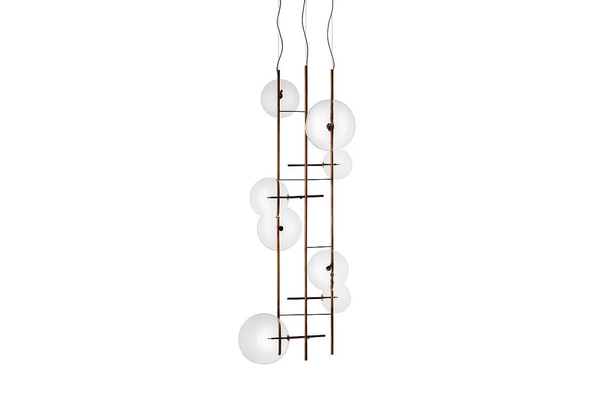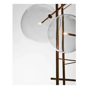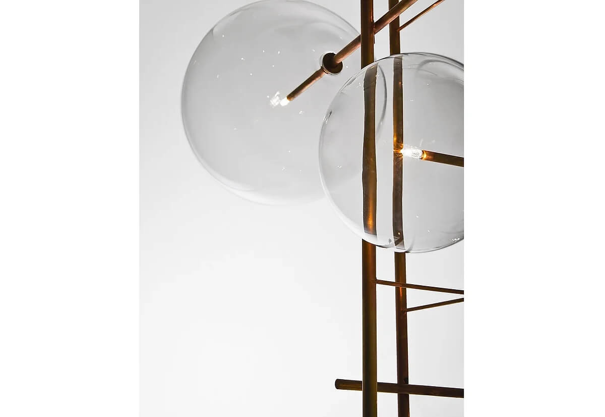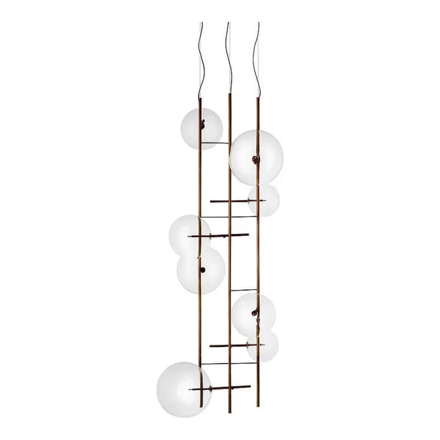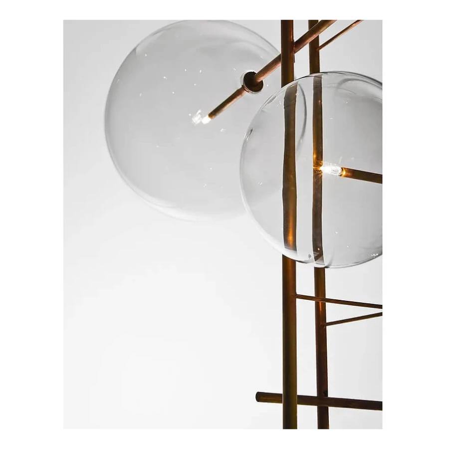 Hanging lamp with dimmable LED light. 8 transparent blown glass spheres. Also available version with 6 spheres. Metal parts in hand burnished brass. The hand burnished brass finish looks naturally spotted and irregular. Supplied with cable 4mt long. Supplied with light bulbs (LED).