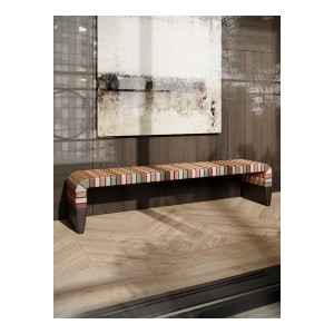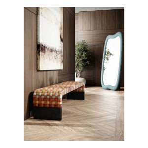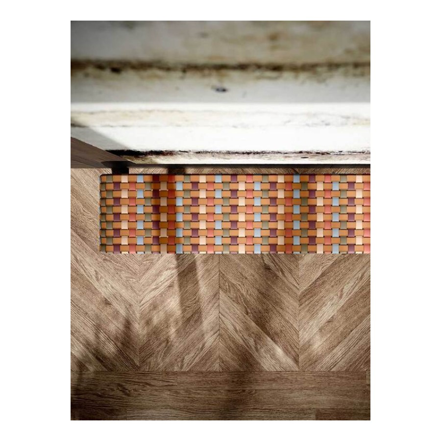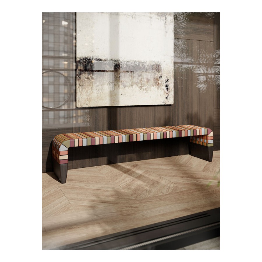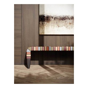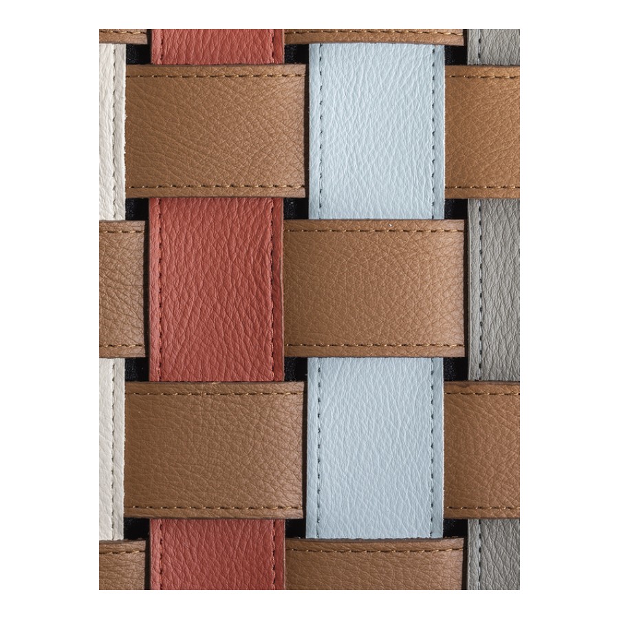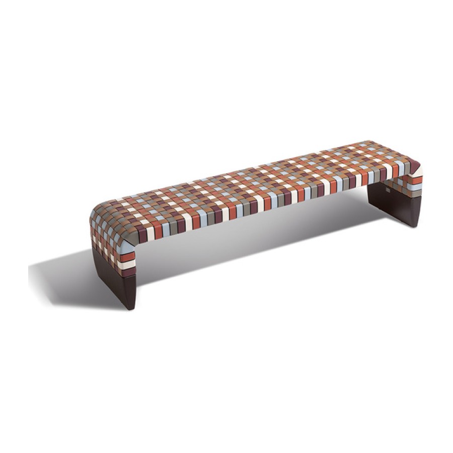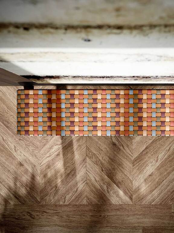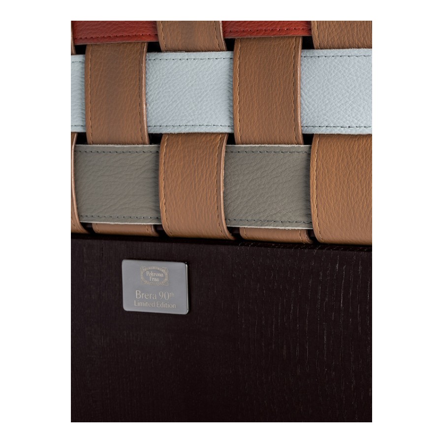 In the Brera 90th Anniversary Edition bench, the seat weft is made solely of leather-colored straps in Pelle Frau® Colorsphere® SC 66 India, running on the long side of the bench so as not to break its profile. The warp, on the other hand, features a delicate sequence of warm and cool hues drawn from the same world as the leather collection itself: SC 146 Cocciopesto, SC 92 Garnet, SC 233 Bardiglio, SC 176 Darsena and SC 01 Avorio. The different tones intertwine in a highly contemporary geometric and tactile pattern. The structure and two tapered, lightweight supports are made of solid ash wood with a Wengé or Moka finish. Brera 90th Anniversary Edition is a special edition and it features a metal plaque on the inner side of the bench.