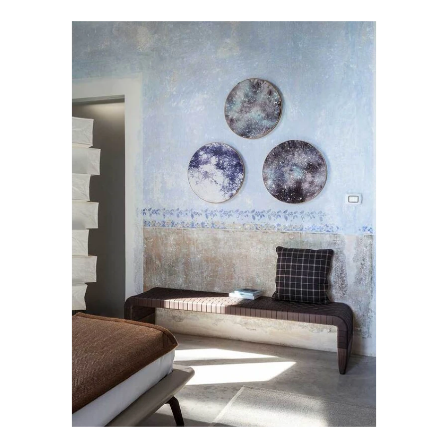 The structure and the two legs, tapered and light, are made from solid ash with a moka or wenge finish. The padding is in constant-density polyurethane foam, covered with a sheet of foam coupled with black light velvet. The Brera bench is perfect in numerous different contexts, from the living room and the bedroom to public waiting rooms.