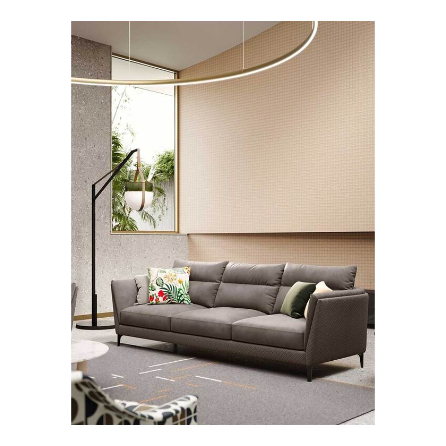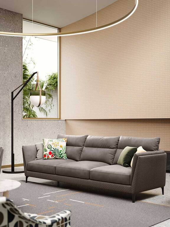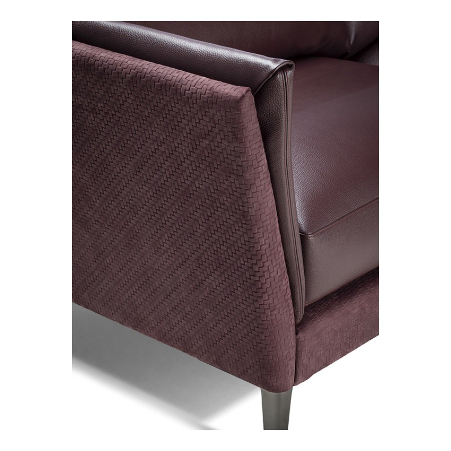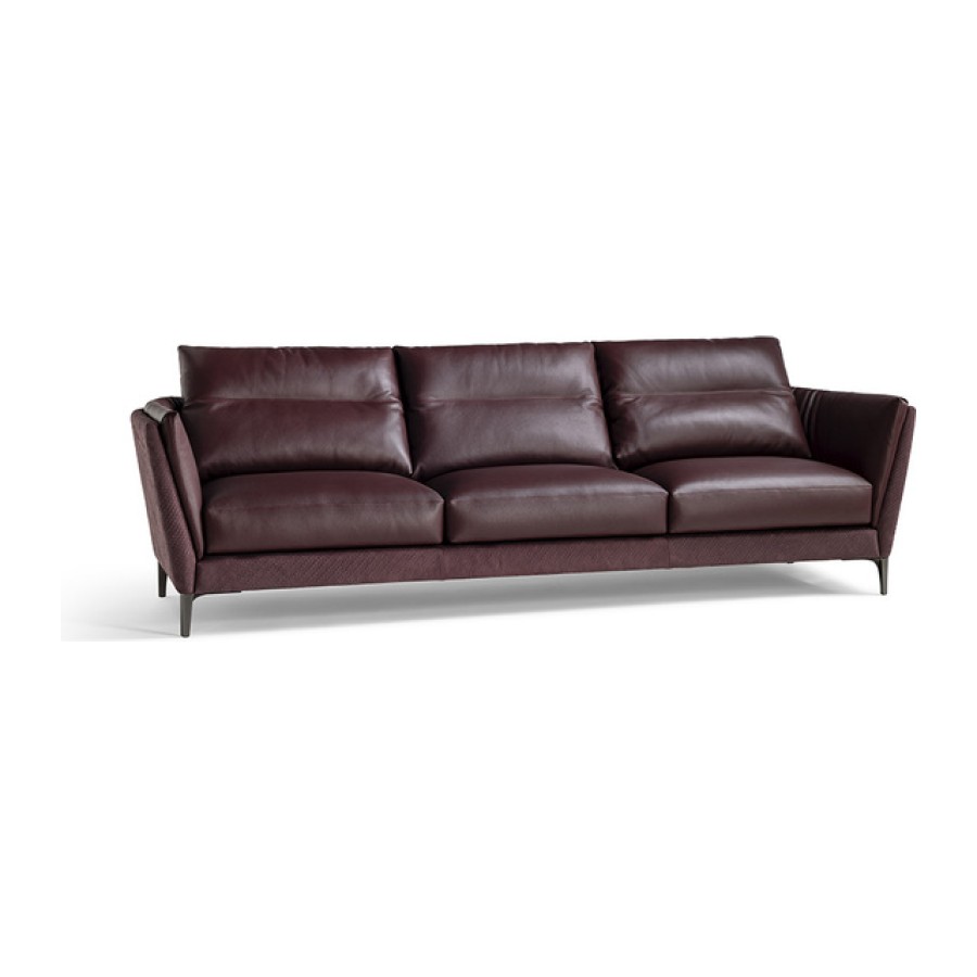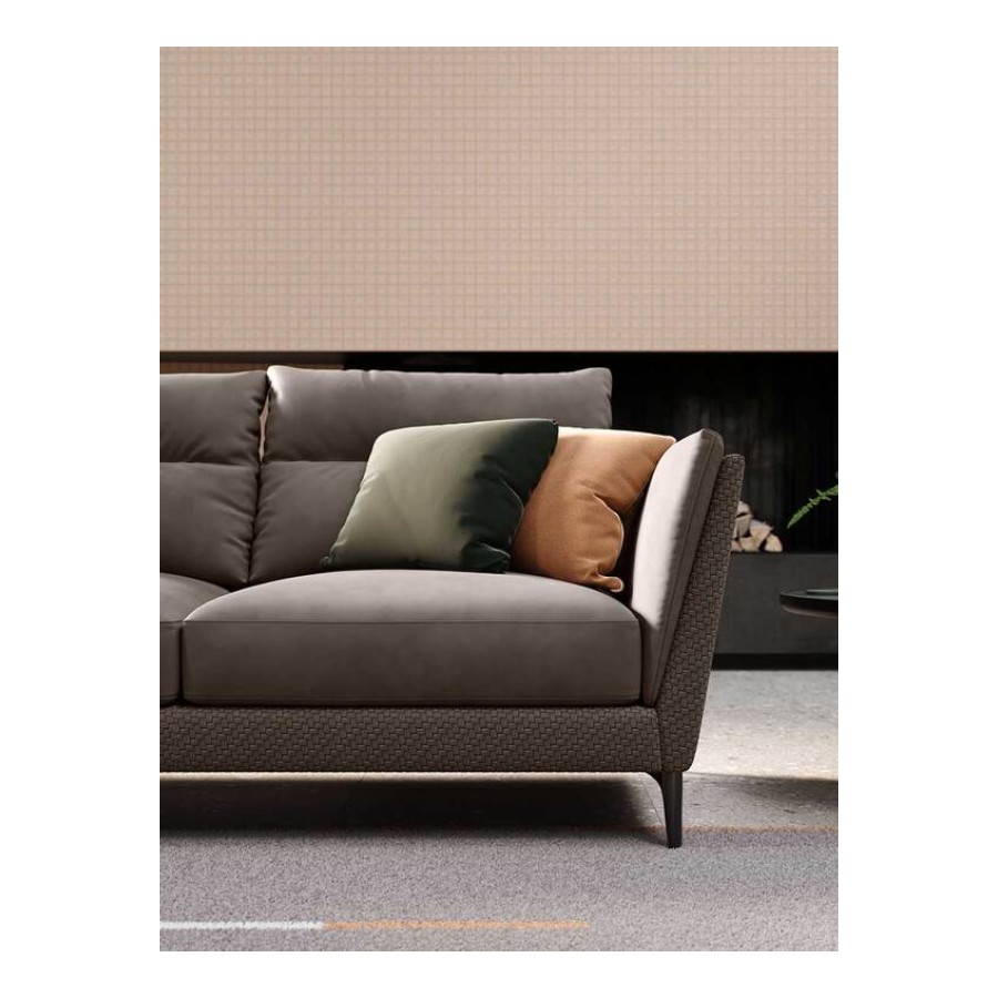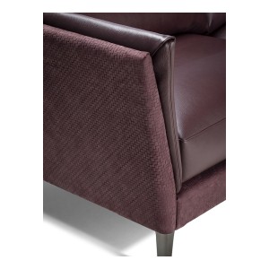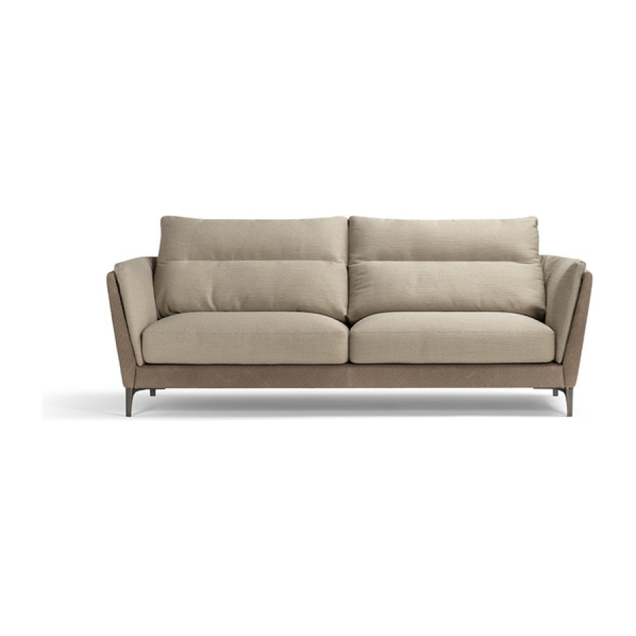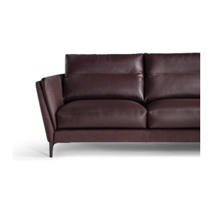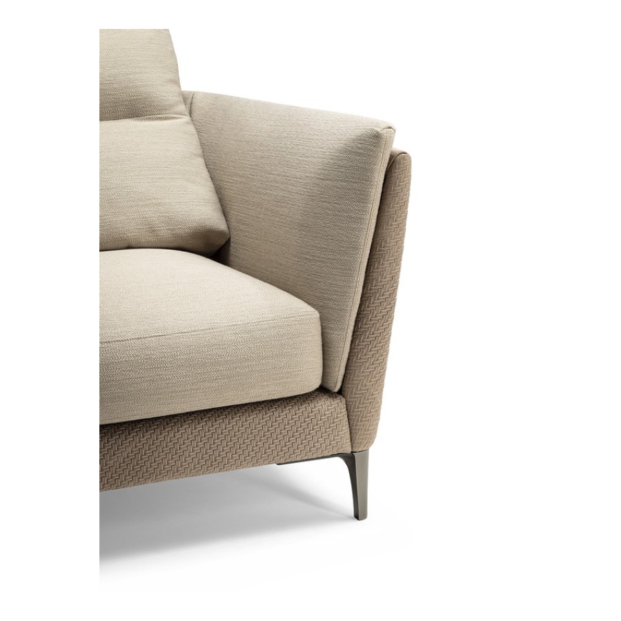 The Bretagne Gran Comfort sofa comes in a two-seater , two-seater Large, and three-seater version. The upholstery – entirely in Pelle Frau® leather or else a combination of Pelle Frau® leather and fabric – can also be contrasting, with the structural parts and base upholstered in Pelle Frau® Motif Knits leather, adding a more three-dimensional tactile and visual effect. The feet are in aluminum.