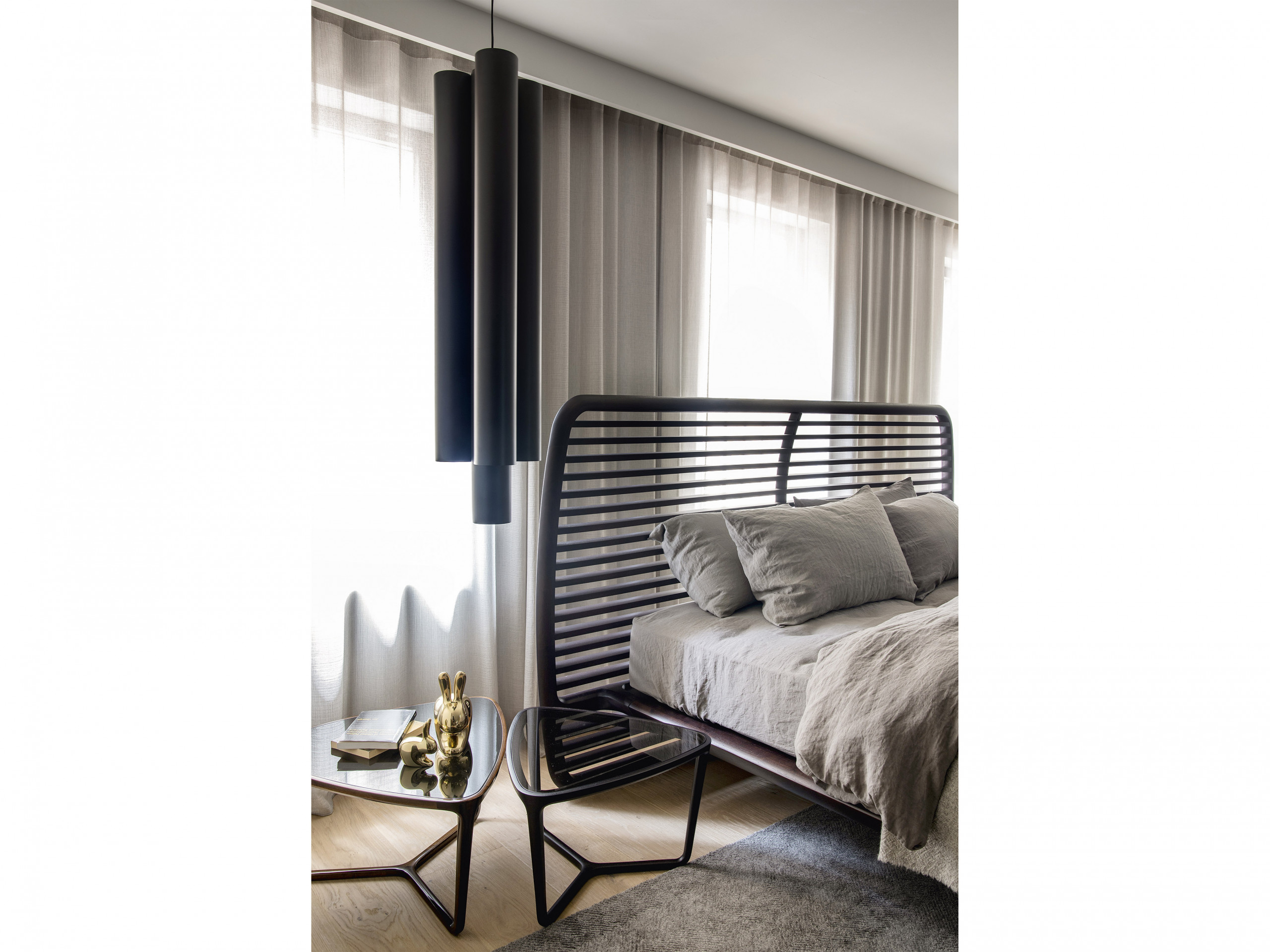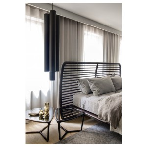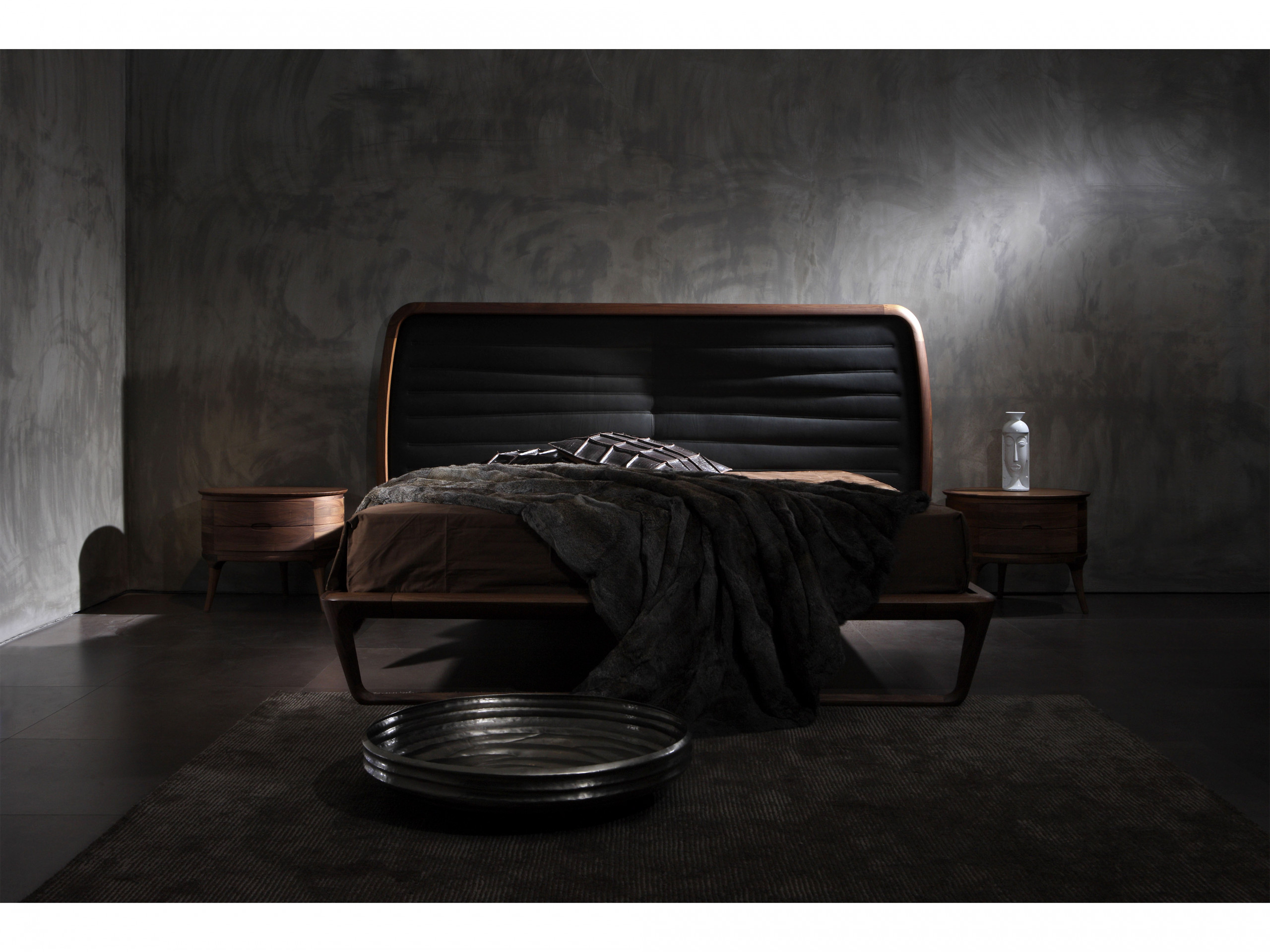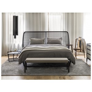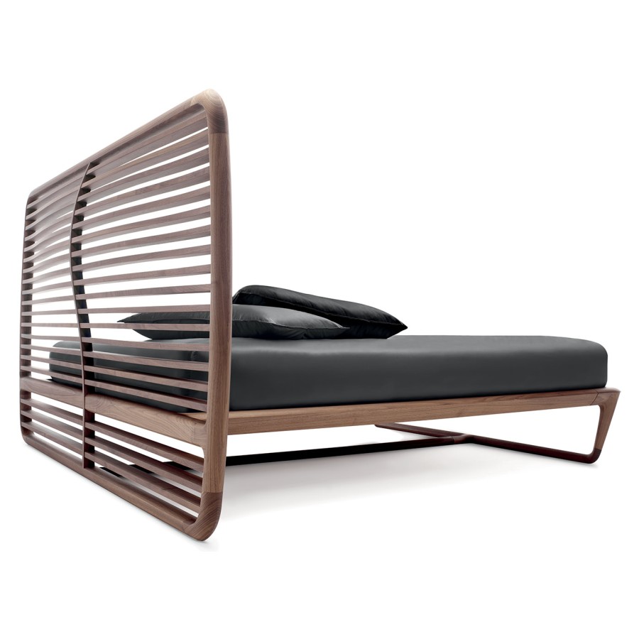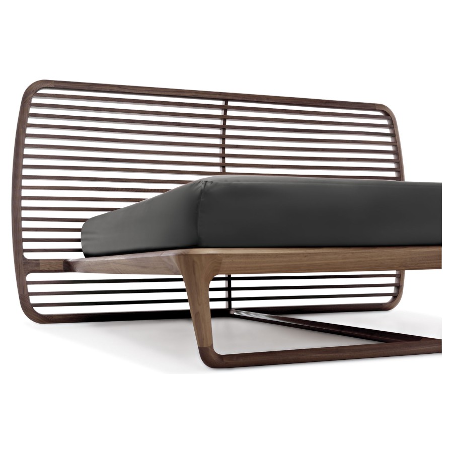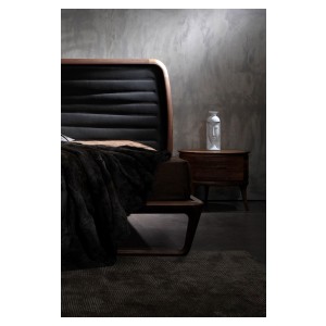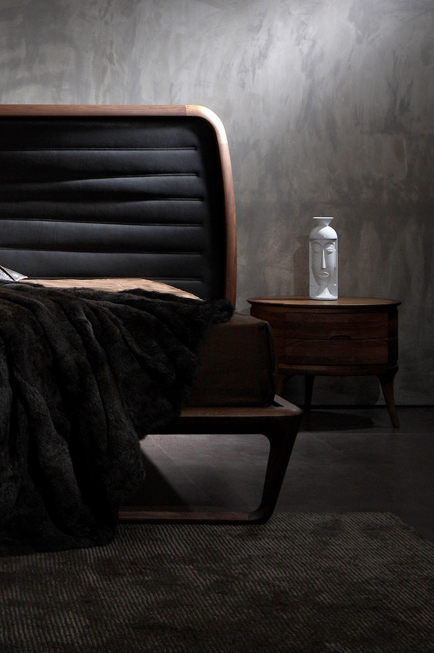 Noé Duchaufour-Lawrance designed this project for Ceccotti Collezioni in 2008. A bed that has become a design icon and synonymous with harmonious beauty. Designed entirely in wood, with base in veneered plywood and frame in solid American walnut. The headboard is its most distinctive feature: a series of parallel horizontal lines that start at the floor, enclosed in a wooden frame. The embodiment of style and lightness of touch, it shows how a product synonymous with aesthetics and durability can also be imbued with a strong design culture. In the version with high headboard, the horizontal crosspieces are curved at the back to soften the frame. The low version, more compact, has also been redesigned with a headboard padded in leather or real leather, for a more modern appearance. As its name suggests, Buonanotte Valentina – Goodnight Valentina – is an invitation to relax..