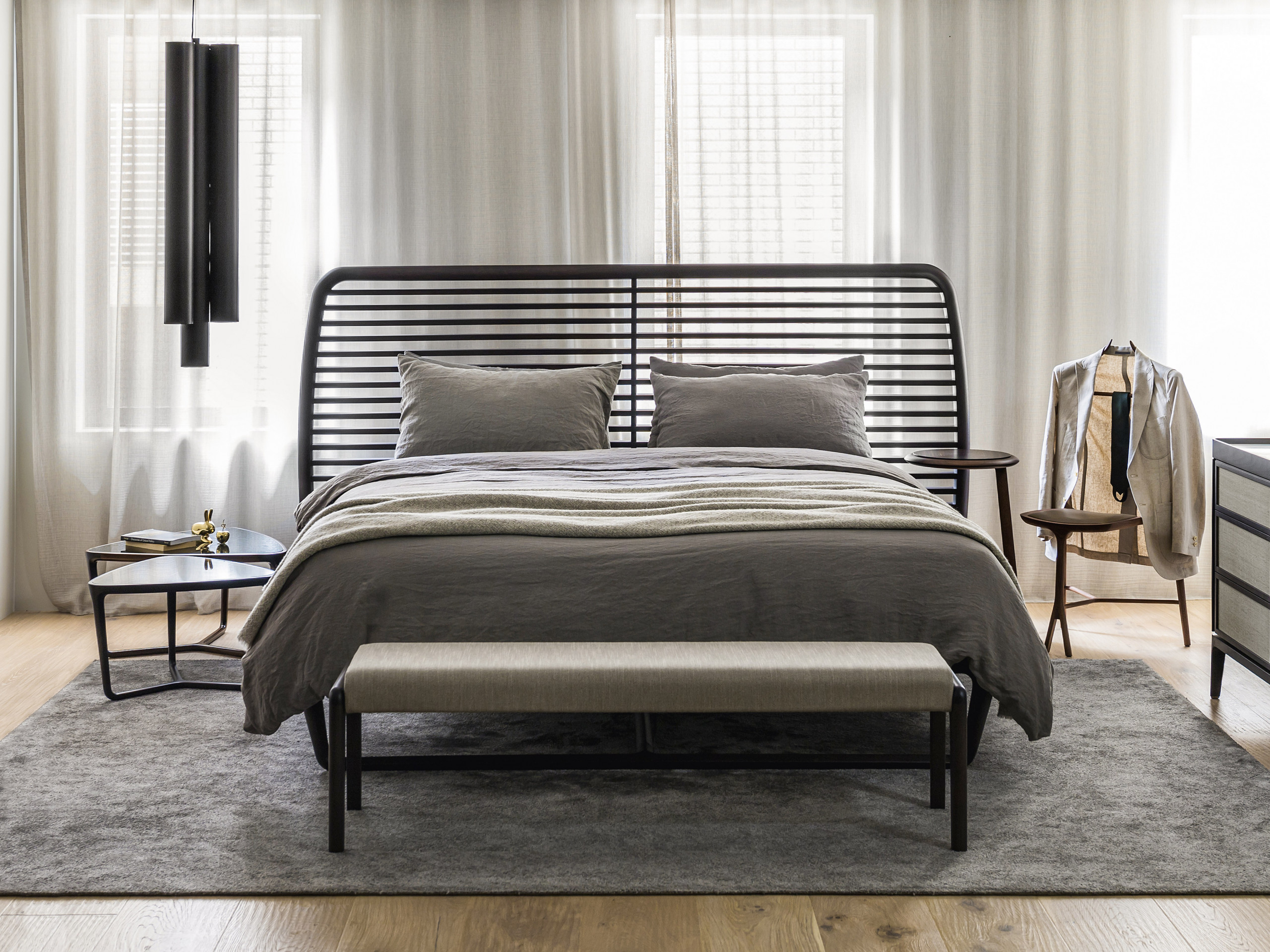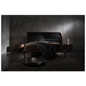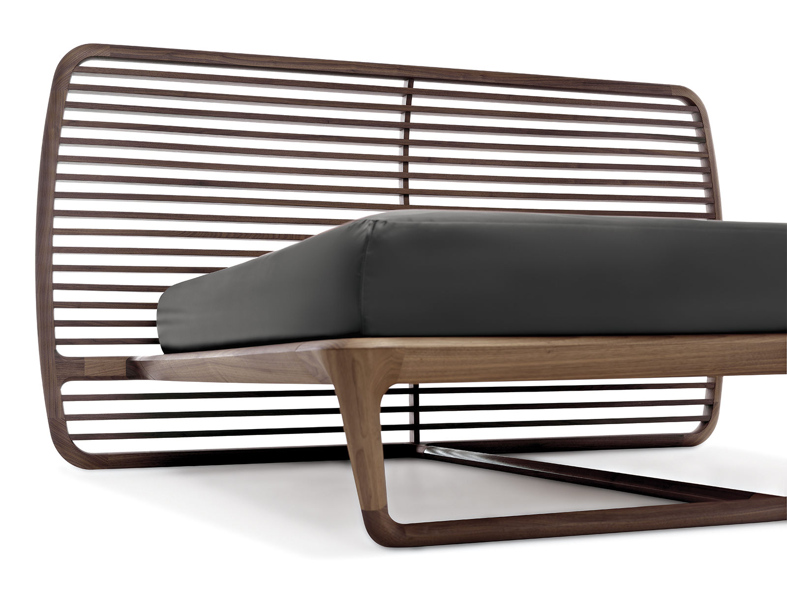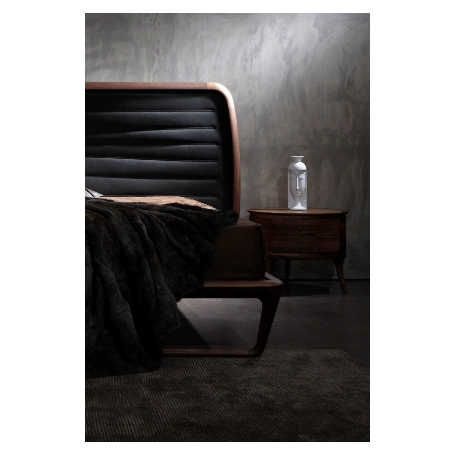 Noé Duchaufour-Lawrance designed this project for Ceccotti Collezioni in 2008. A bed that has become a design icon and synonymous with harmonious beauty. Designed entirely in wood, with base in veneered plywood and frame in solid American walnut. The headboard is its most distinctive feature: a series of parallel horizontal lines that start at the floor, enclosed in a wooden frame. The embodiment of style and lightness of touch, it shows how a product synonymous with aesthetics and durability can also be imbued with a strong design culture. In the version with high headboard, the horizontal crosspieces are curved at the back to soften the frame. The low version, more compact, has also been redesigned with a headboard padded in leather or real leather, for a more modern appearance. As its name suggests, Buonanotte Valentina – Goodnight Valentina – is an invitation to relax.
