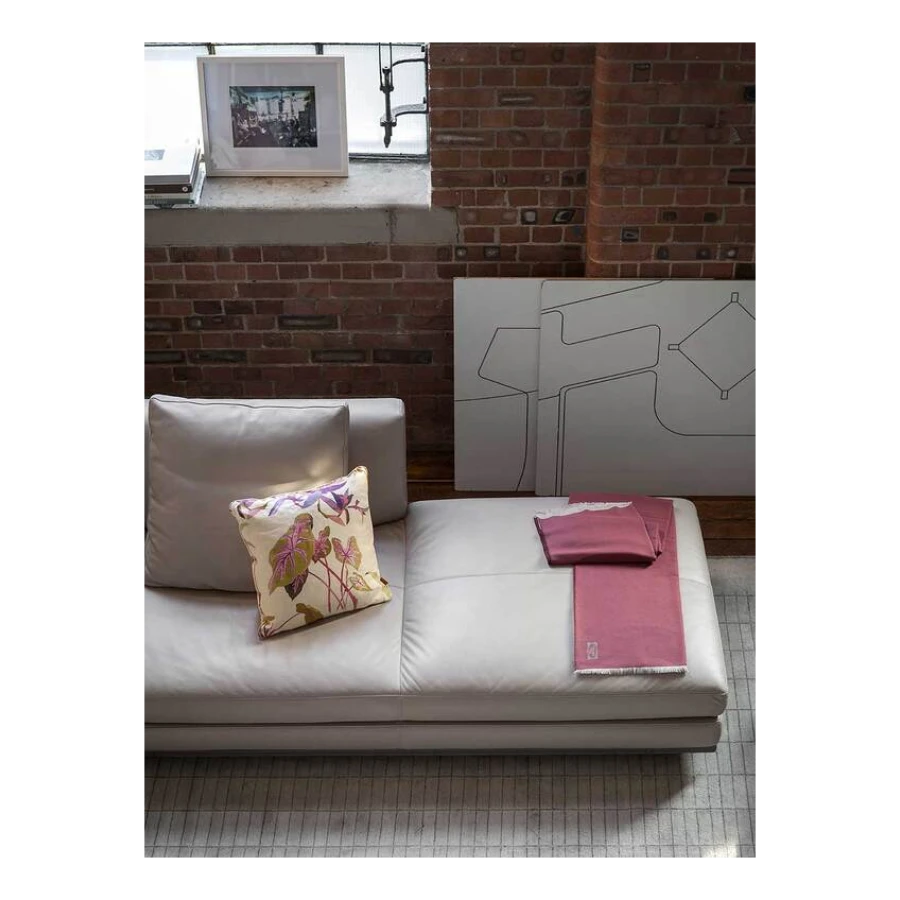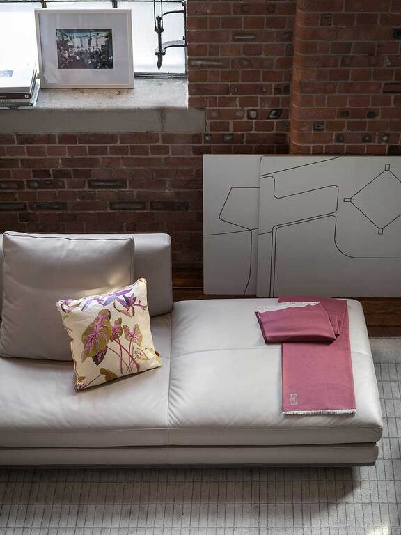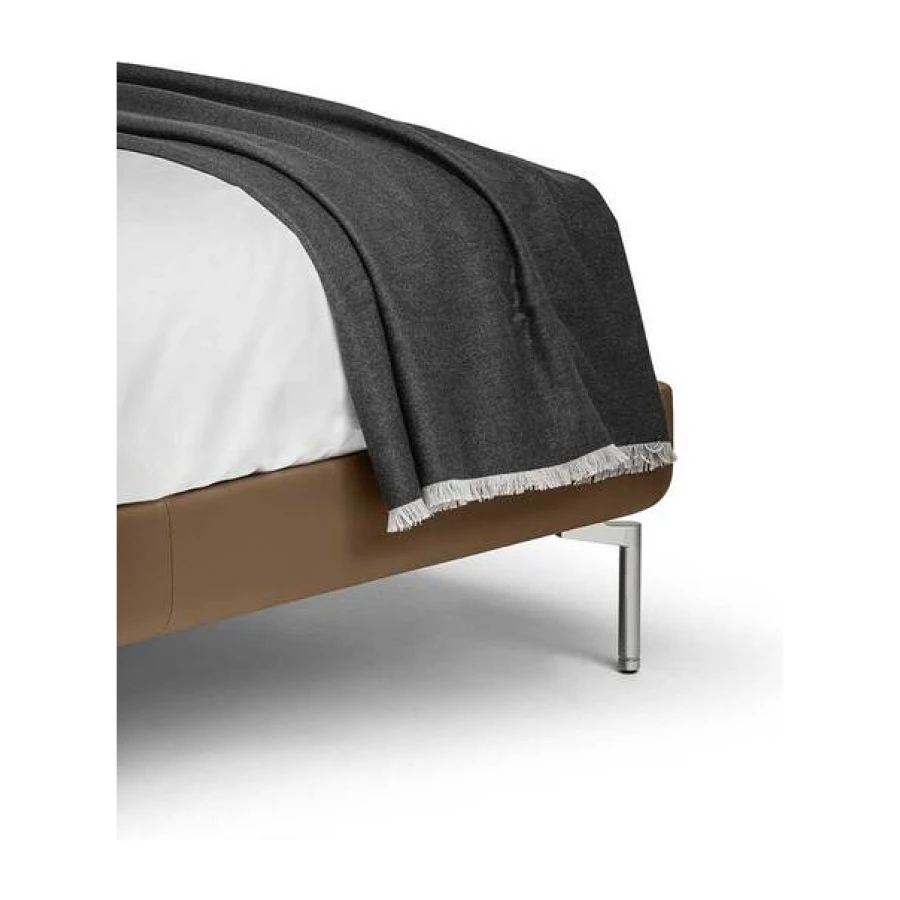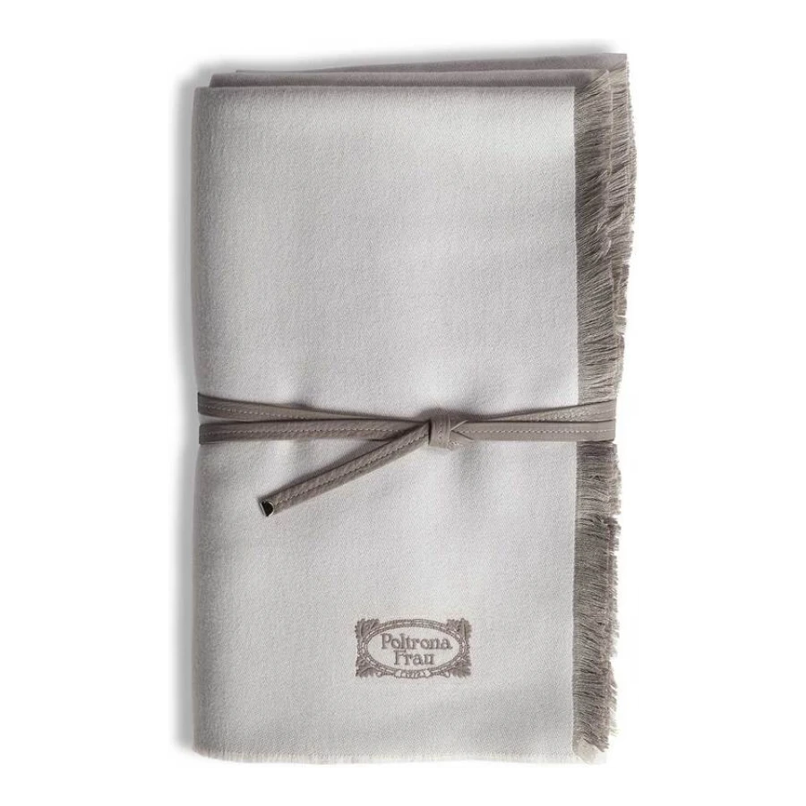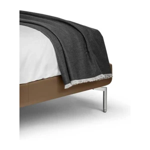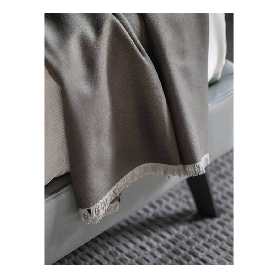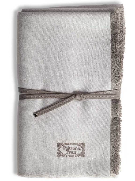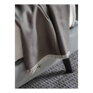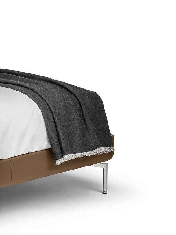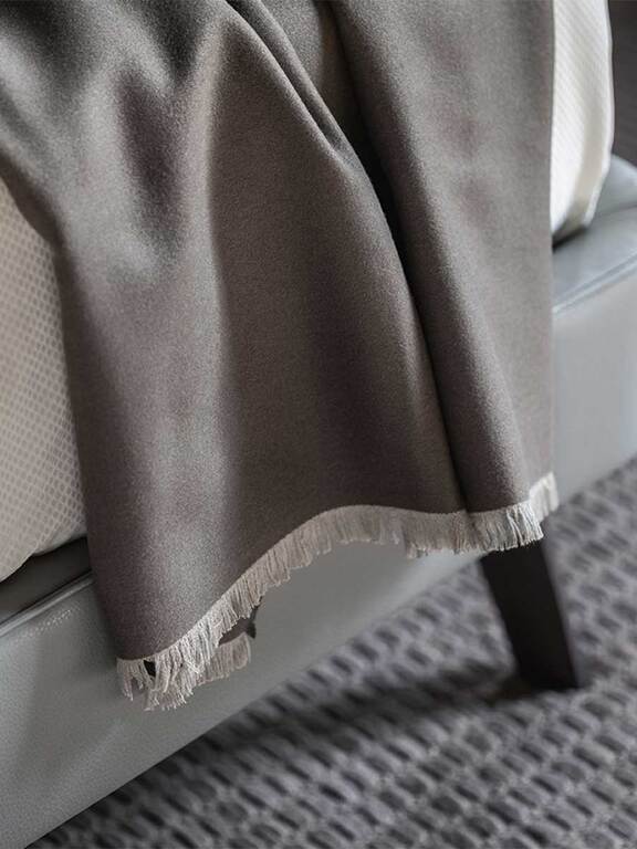 Every detail is exquisite. The Poltrona Frau logo is hand-stitched in contrasting turtledove-coloured silk thread. The fringe of the quilt stands out for its subtle variations in size and colour: 3 mm on the two longer sides with a tone-on-tone effect and 15 mm on the two shorter sides and in the same colour as the hand-stitched logo.
