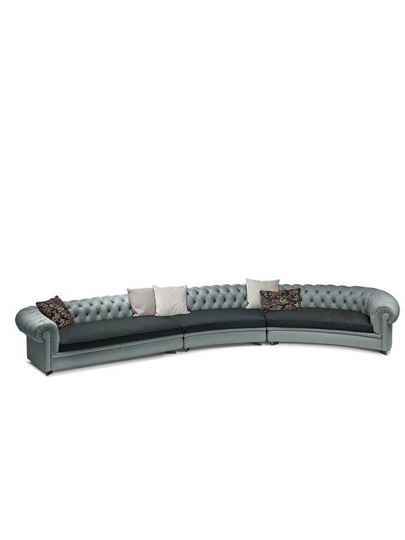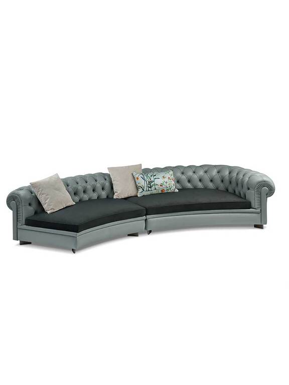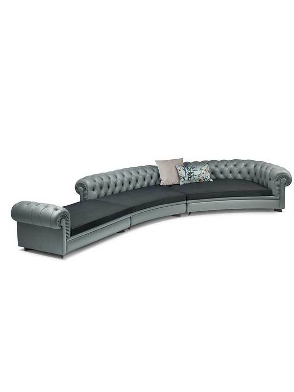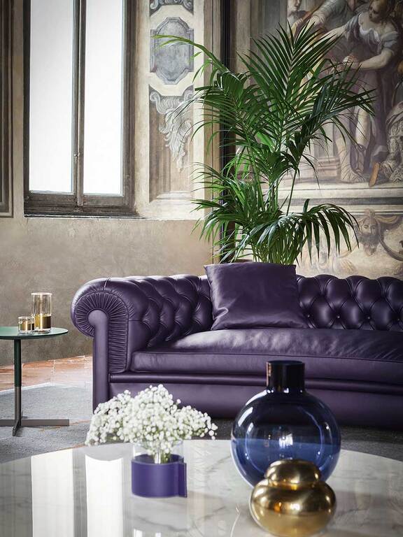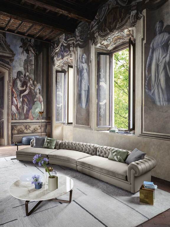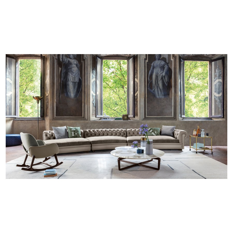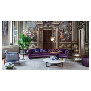 The distinctive features and precious processing details of the Chester are all present, revisited here in a lighter form in the quest for an informal elegance achieved by subtraction: the historic capitonné remains on the backrest while the base of the sofa disappears; the metal feet are almost invisible to further emphasise the beauty of the seat; compared with the classic two-seater sofa, there is just one large cushion which is even more comfortable.
