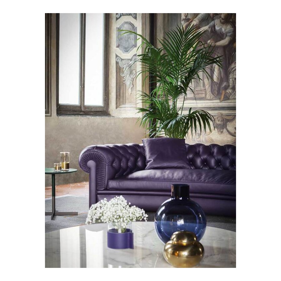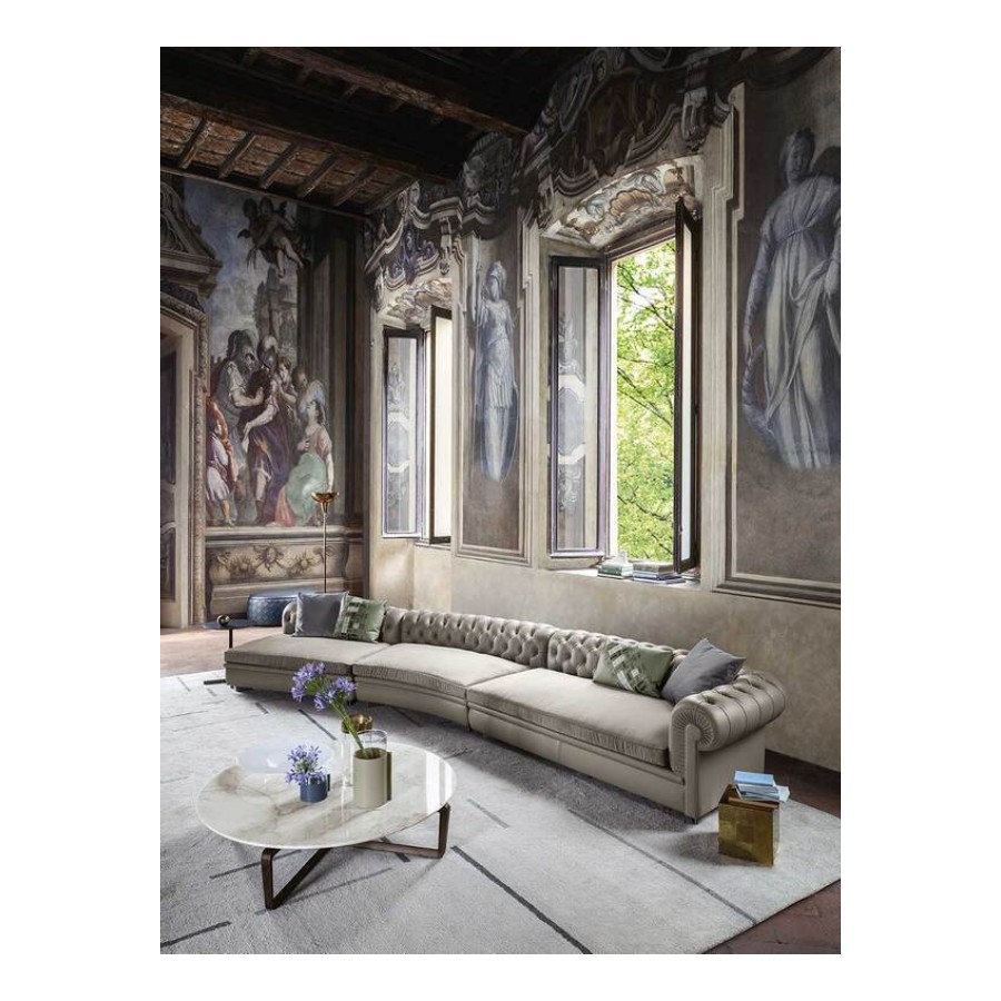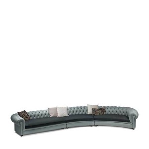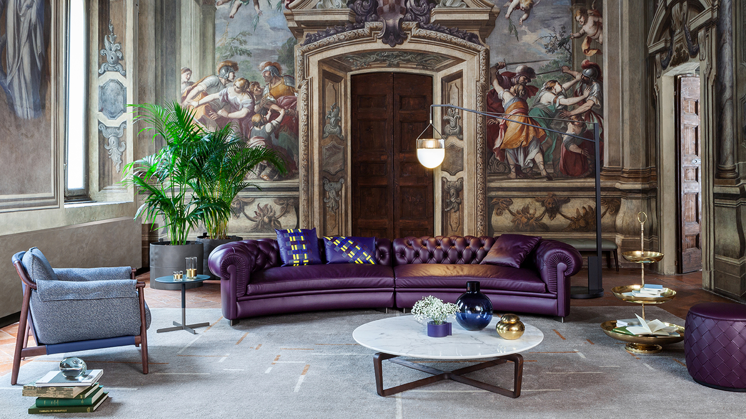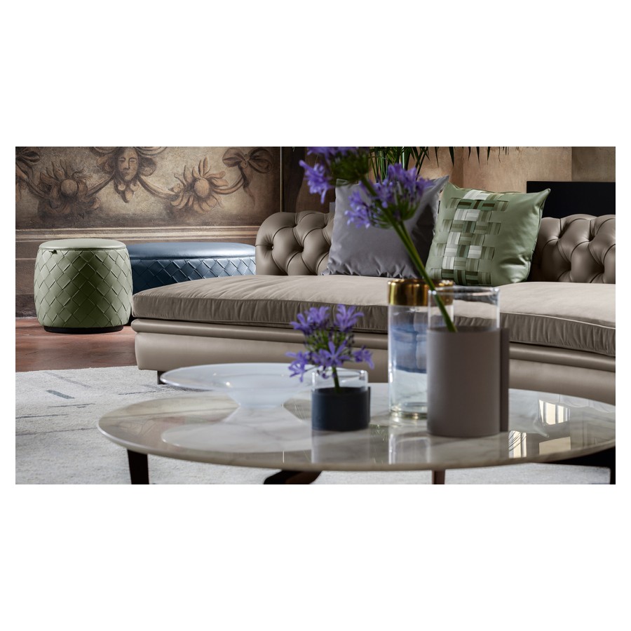 The distinctive features and precious processing details of the Chester are all present, revisited here in a lighter form in the quest for an informal elegance achieved by subtraction: the historic capitonné remains on the backrest while the base of the sofa disappears; the metal feet are almost invisible to further emphasise the beauty of the seat; compared with the classic two-seater sofa, there is just one large cushion which is even more comfortable.