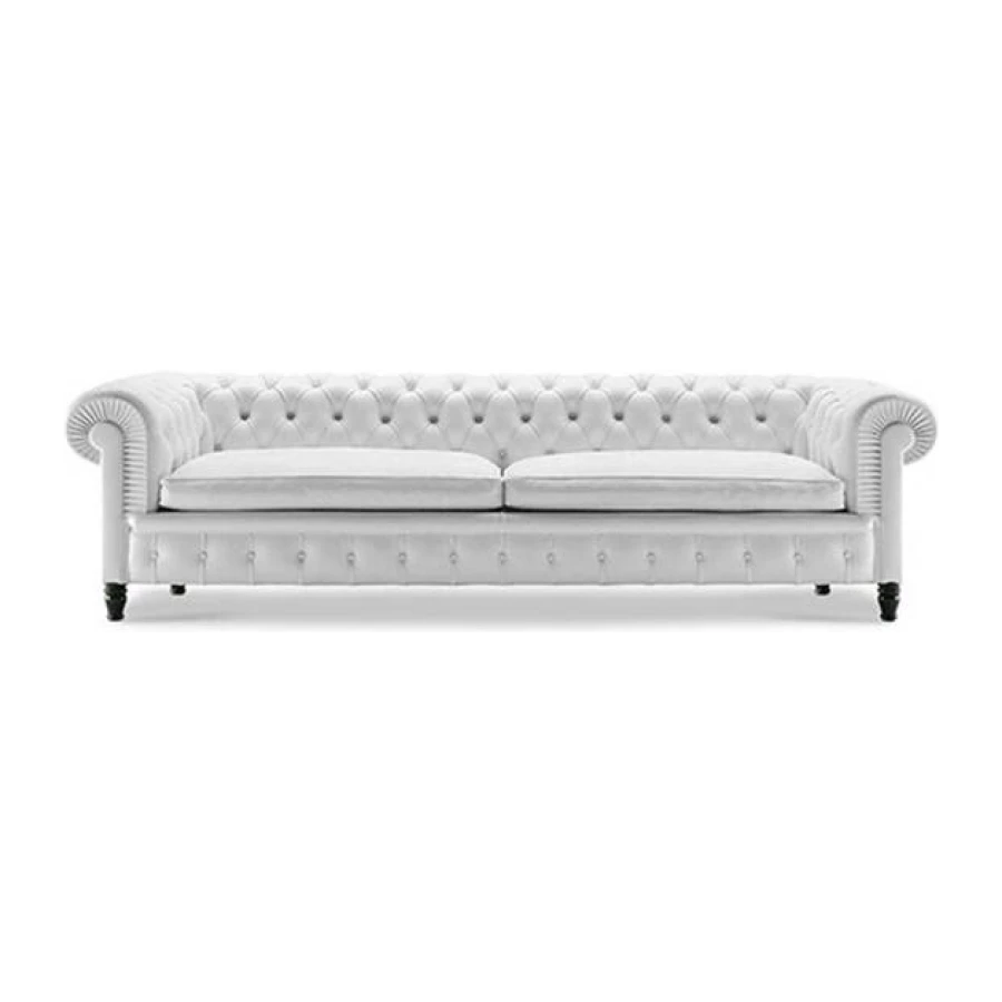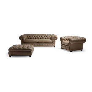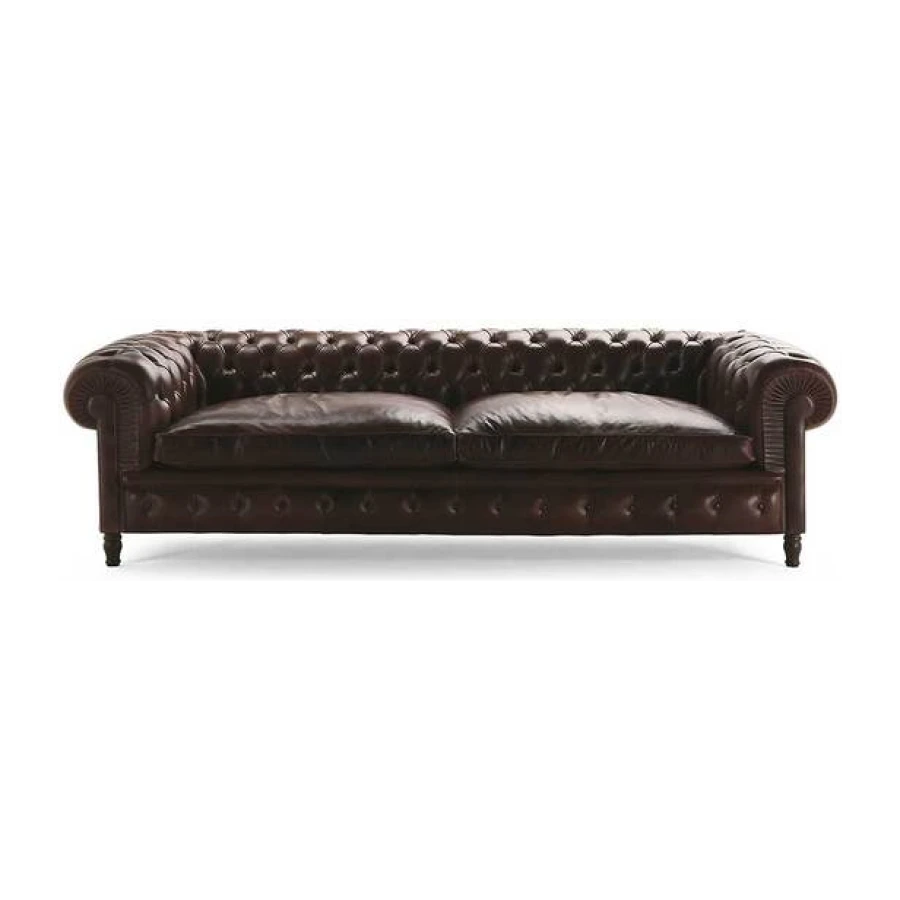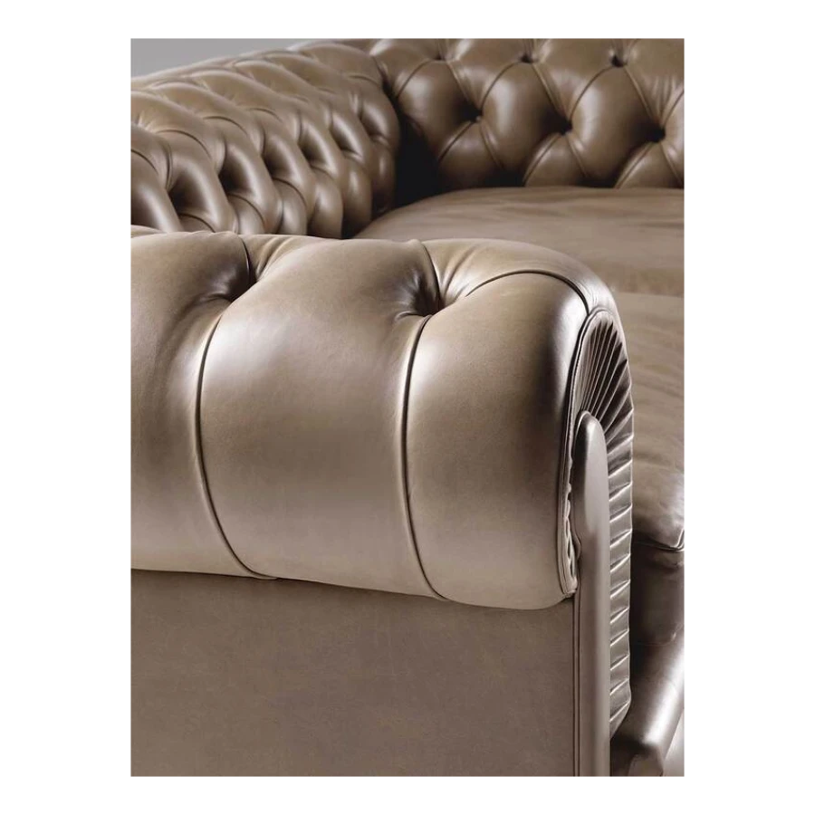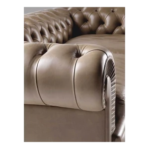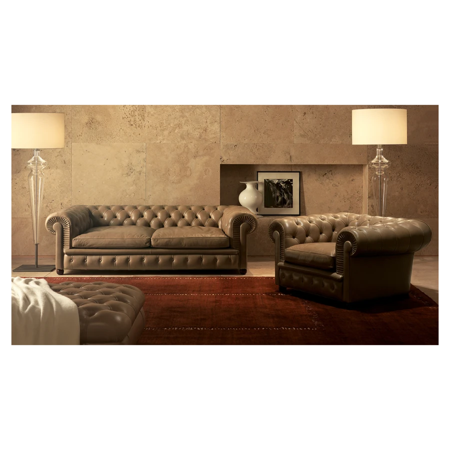 Chester is now also Chester One: a more extensive collection with new four- and five-seater sofas and poufs, also revisited in terms of their dimensions. In fact, the seats are now 15 centimetres deeper to offer greater comfort and contemporary elegance, in keeping with the times. However, the Chester One sofa maintains the features of the classic model designed by Renzo Frau: the famous capitonné processing, the curved armrest, the series of pins that refines the Pelle Frau® leather upholstery.