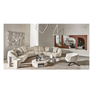 Modular sofa in non-deformable foam polyurethane in different density and polyester fibre with wooden inside structure. Black lacquered wooden feet. Available covered by fabric or leather as per samples.Not removable cover. Decorative polyester fibre cushions, on request. Modules cannot be sold individually.
